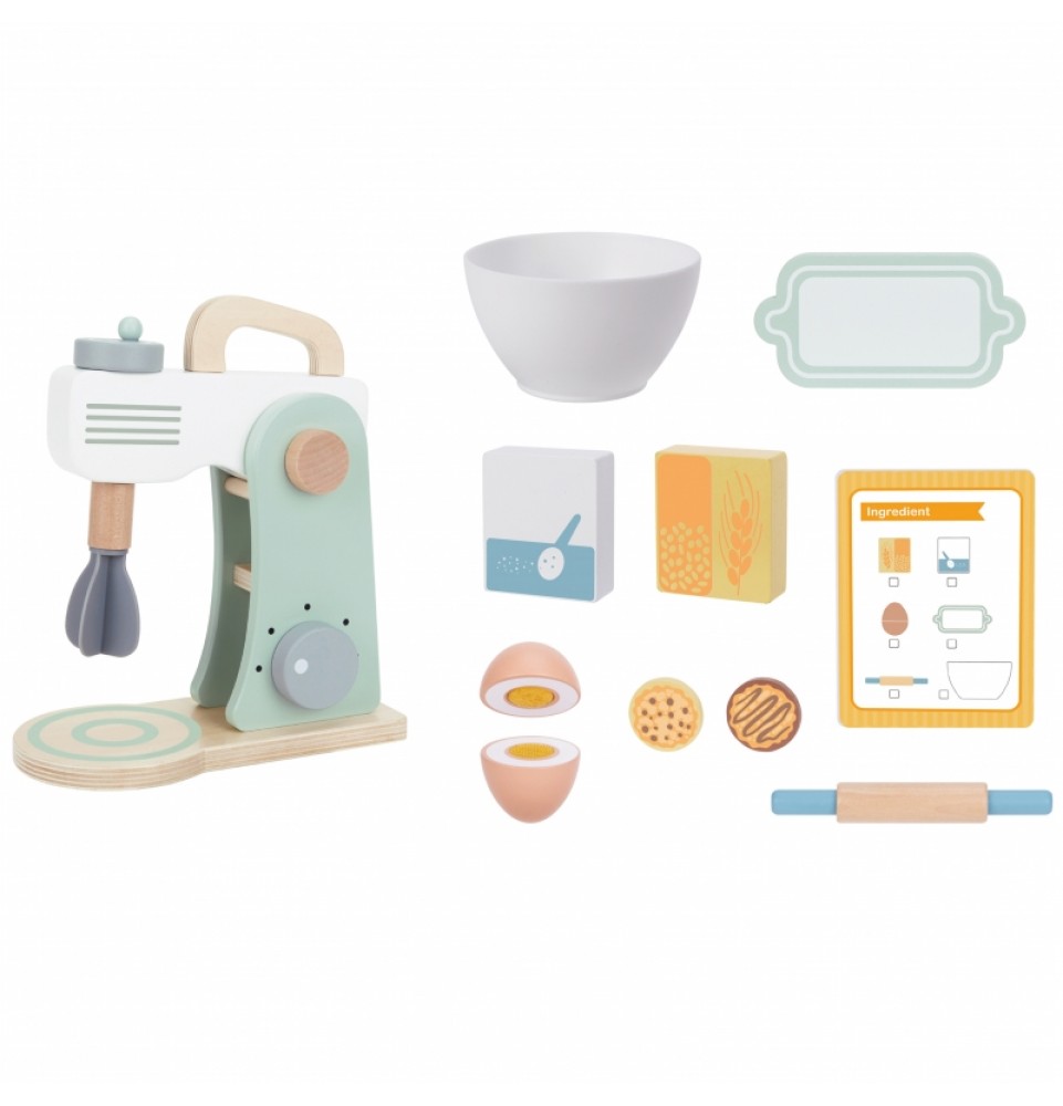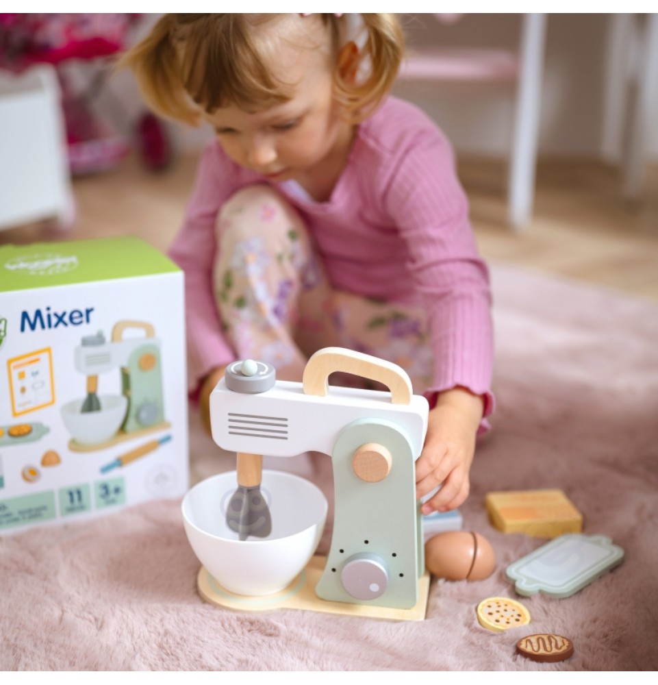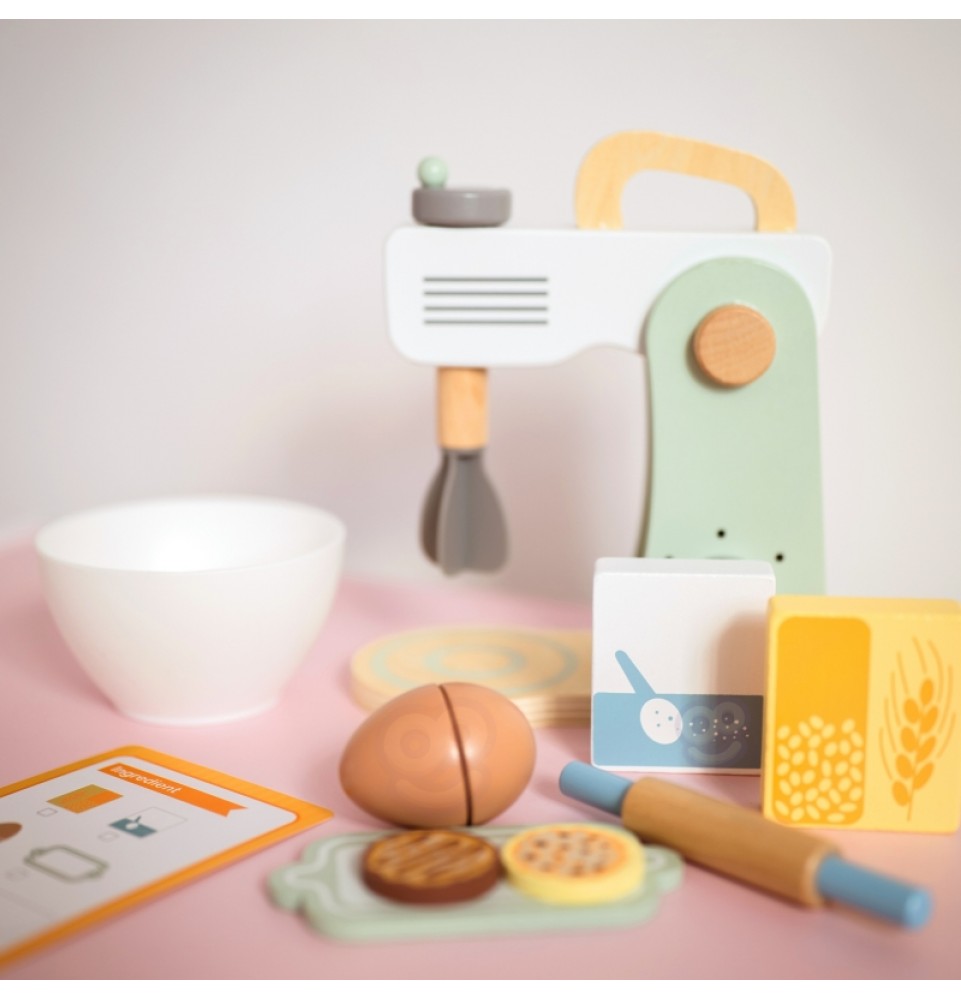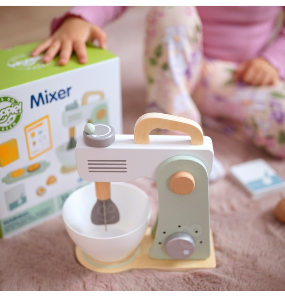 Laikas kažkam saldaus! Šį kartą jūsų vaikas paruoš desertą visai šeimai. Žaidimas su maišytuvu lavina vaizduotę , lavina kūrybiškumą ir gebėjimą mėgdžioti suaugusiuosius – tai, ką vaikai mėgsta labiausiai. Mediniai elementai yra saugūs ir malonūs liesti, o pastelinės spalvos suteikia žavesio bet kurios vaiko virtuvei.