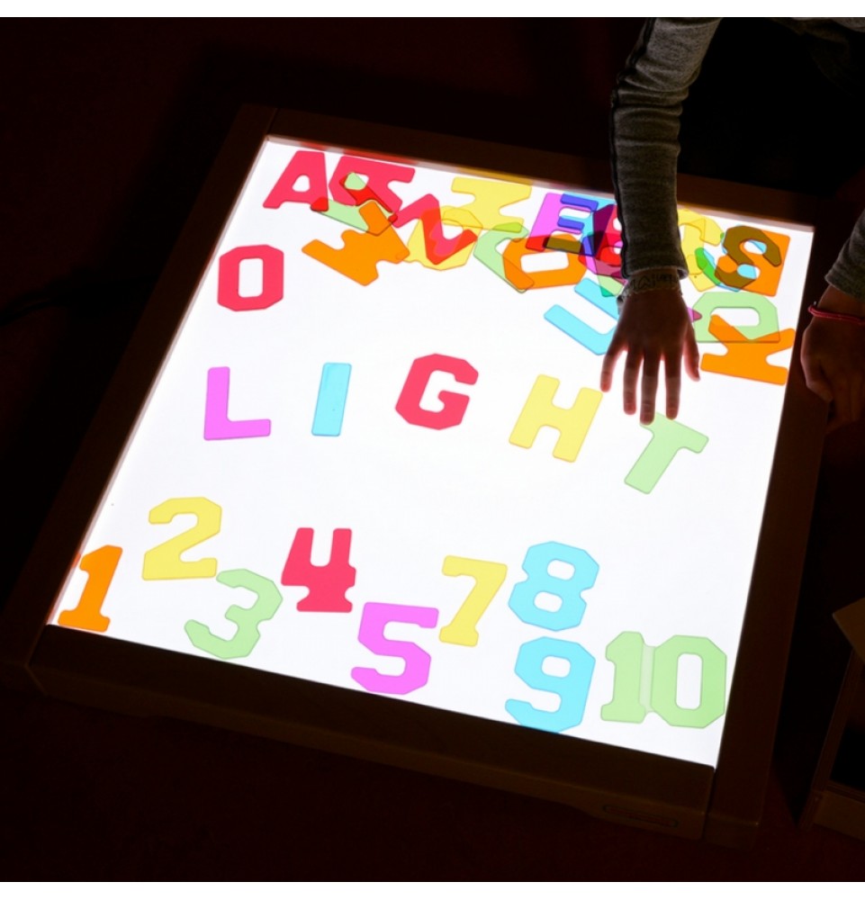 „Masterkidz“ LED jutiklinė dėžutė yra tvirta medinė dėžutė su LED apšvietimu, skleidžiančia spalvingą šviesą. Pridedamas nuotolinio valdymo pultas leidžia vartotojams nustatyti vieną iš 11 iš anksto užprogramuotų spalvų arba rankiniu būdu keisti skleidžiamą spalvą pagal pagrindines raudonas, žalias ir mėlynas spalvas. Įrenginys taip pat leidžia sklandžiai pereiti spalvas ir išsaugoti pasirinktas spalvas pakartotiniam naudojimui. LED šviesos plokštė leidžia užsiimti įvairia kūrybine veikla, pavyzdžiui, maišyti spalvas ir mokytis STEM dalykų. Akį traukiantys efektai pasiekiami, kai šviesa prasiskverbia pro įvairias medžiagas – lapus, popierių, smėlio padėklą ar skaidrų vandenį. Skydelis puikiai dera su pridedamomis skaidriomis, spalvingomis geometrinėmis figūromis, kurios žaidimo metu skatina kūrybiškumą ir vaizduotę.