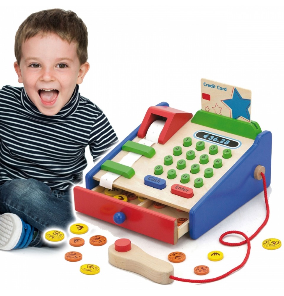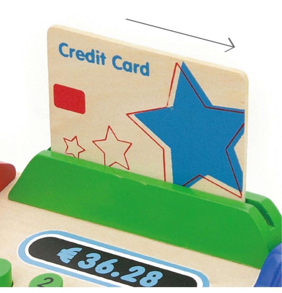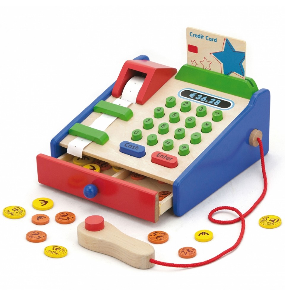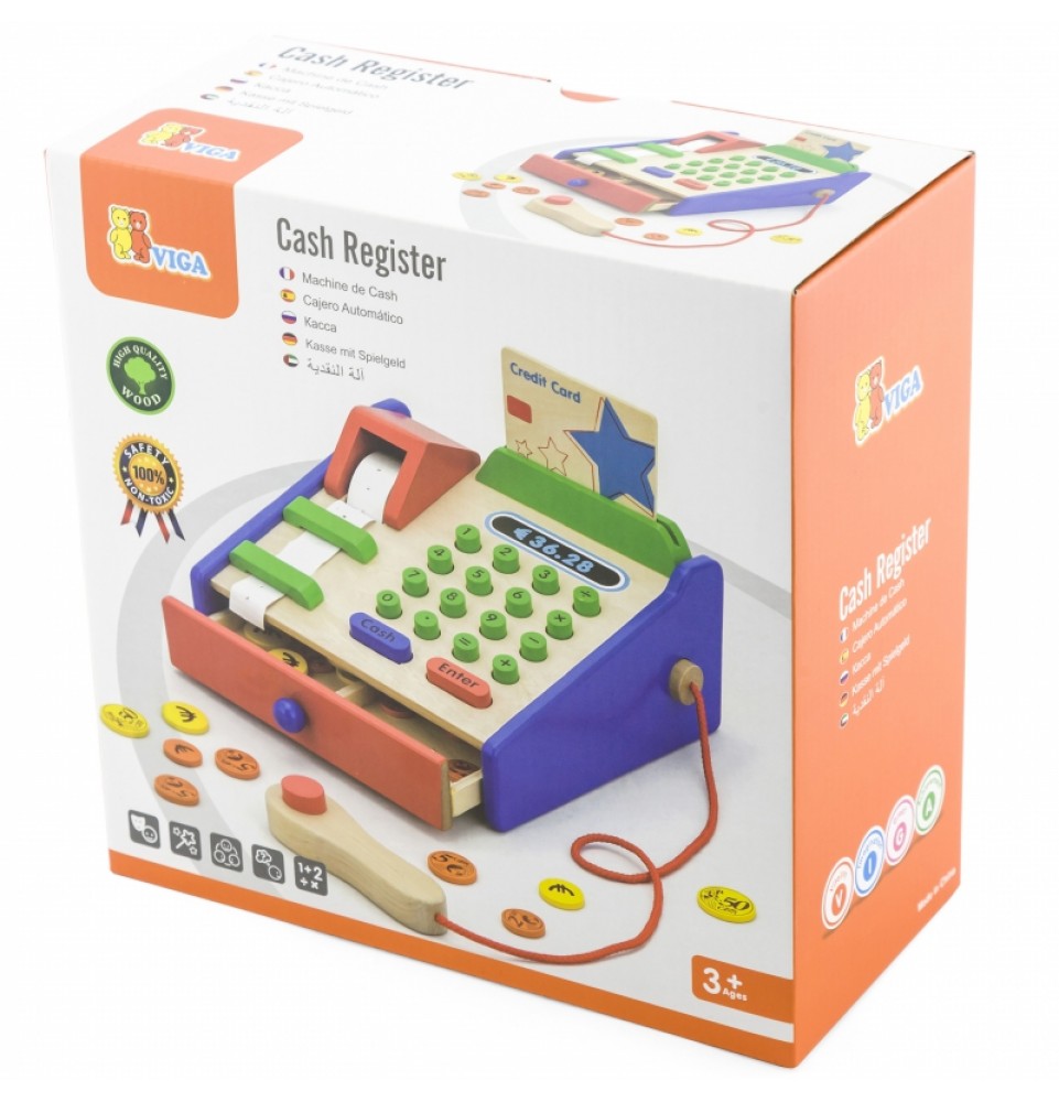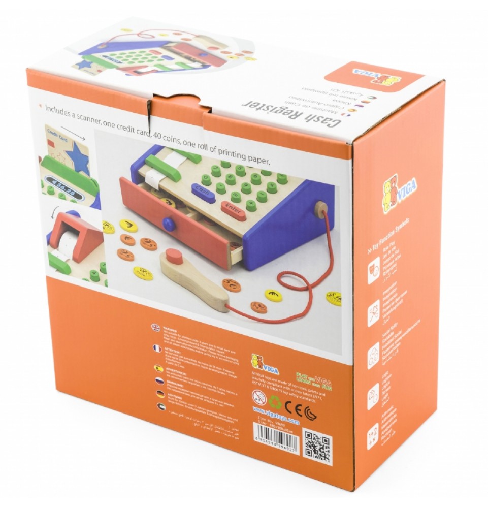 „Viga“ kasos aparatas yra puikus medinis žaislas, leidžiantis žaisti vaidmenimis įvairius parduotuvėje vykstančius scenarijus. Vaikai gali atlikti kasininko arba kliento vaidmenis ir kartu lavinti socialinę sąveiką bei bendravimo įgūdžius . Grynieji pinigai ar kortelė? Suskaičiuokite sumą, priimkite pinigus ir atiduokite teisingą grąžą. Kasos aparate yra 40 monetų, mokėjimo kortelė, skaitytuvas ant virvelės ir juostelės ritinėlis kvitams „spausdinti“. Vaikai gali mokytis žaisdami, vadovaudamiesi Montessori metodu ! Mokslų karalienė – matematika nebebus bauginanti.