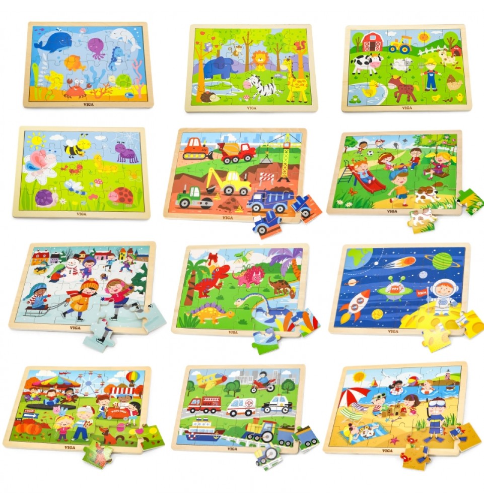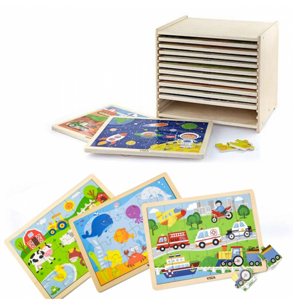 „Viga“ medinių dėlionių rinkinys, 12 dėlionių po 24 detales, ant stovo
