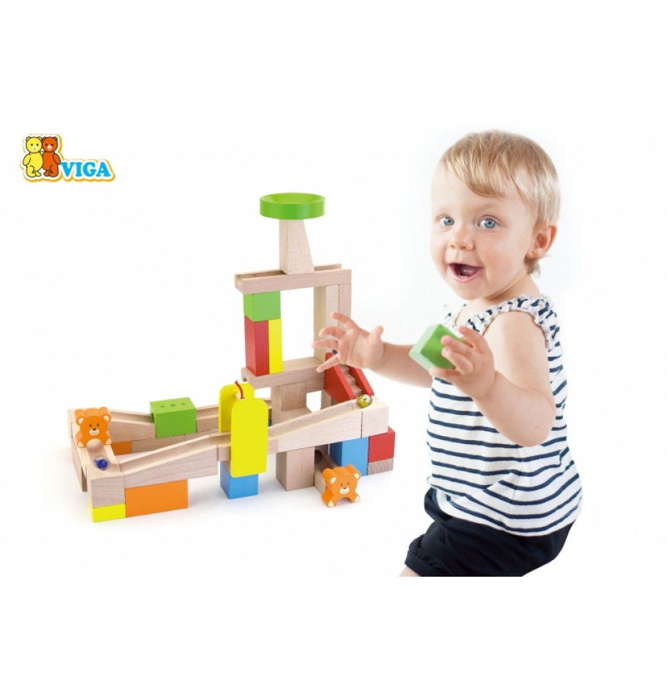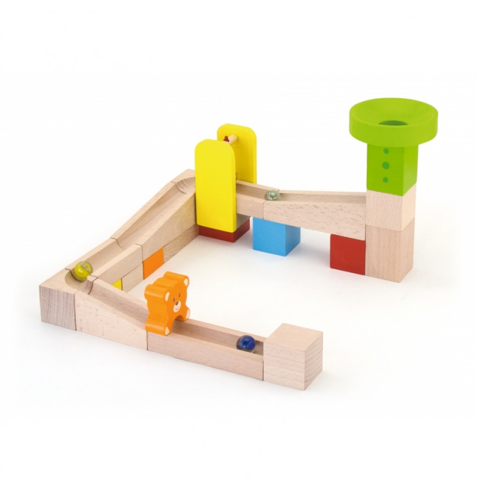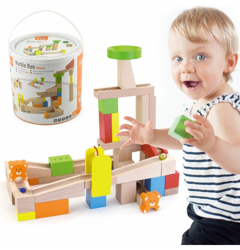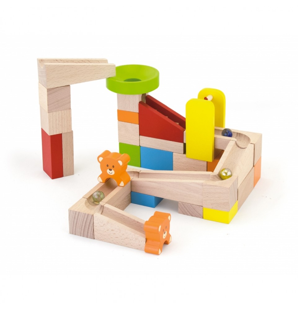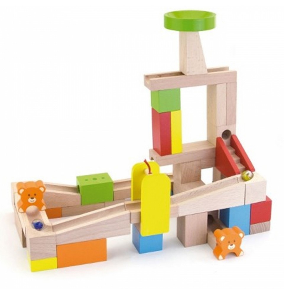 Kamuoliukų trasos konstruktoriaus rinkinys, pagamintas iš aukštos kokybės natūralių medinių kaladėlių, suteikia jauniesiems architektams daugybę galimybių kūrybiškam, tyrinėjančiam ir vaizduotę lavinančiam žaidimui. Rinkinį sudaro 10 kortelių, vaizduojančių kamuoliukų trasos konfigūracijų derinius, kurių kiekviena yra skirtingo sudėtingumo lygio. Pabandykite sukonstruoti ant kortelės pavaizduotą trasą arba sukurkite savo fantastišką konstrukciją iš 49 detalių! Rinkinyje yra laipteliai ir meškiukai papildomoms pramogoms. Visas rinkinys supakuotas patogiame kibirėlyje su rankena, kad būtų galima saugiai laikyti ir lengvai transportuoti.