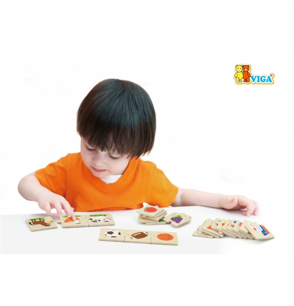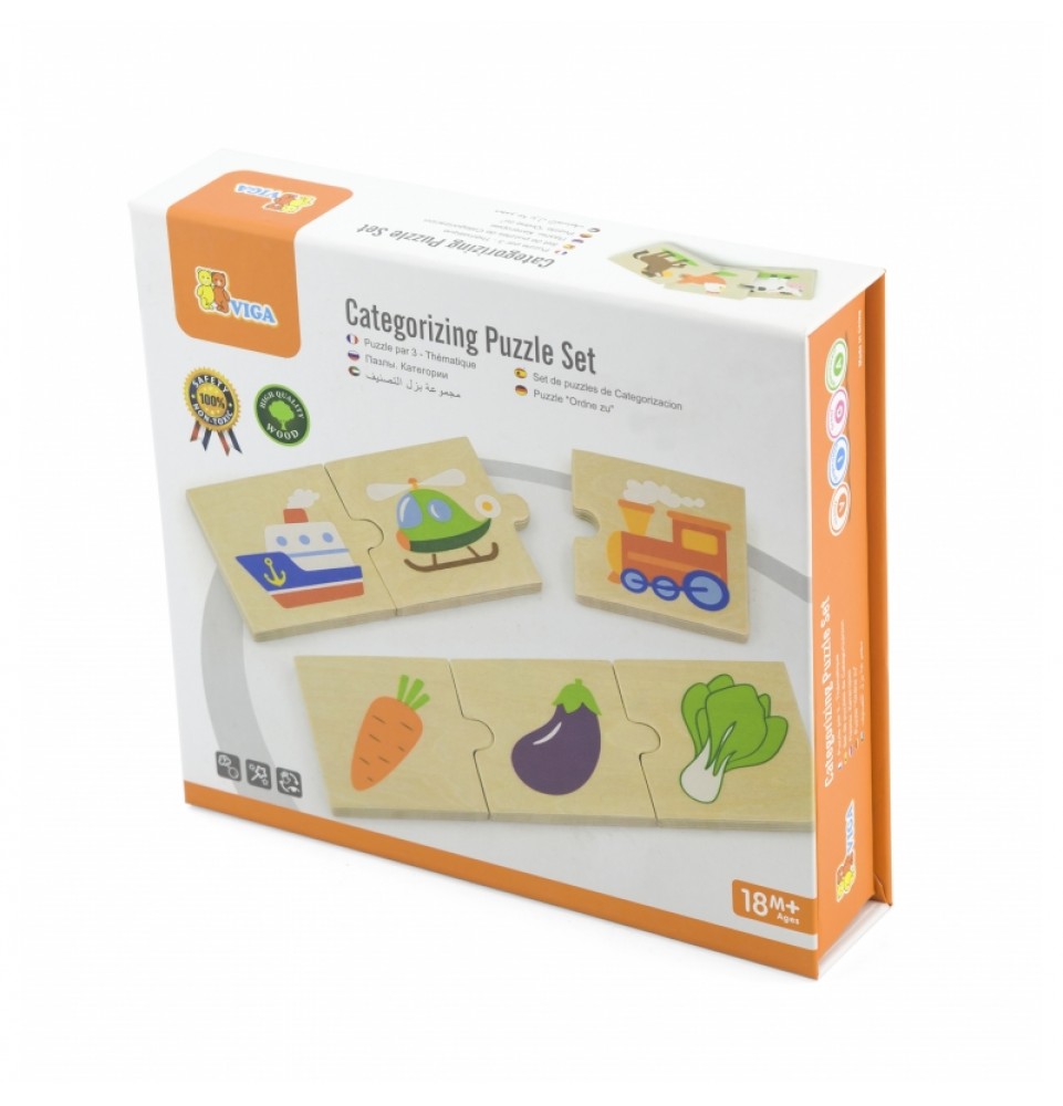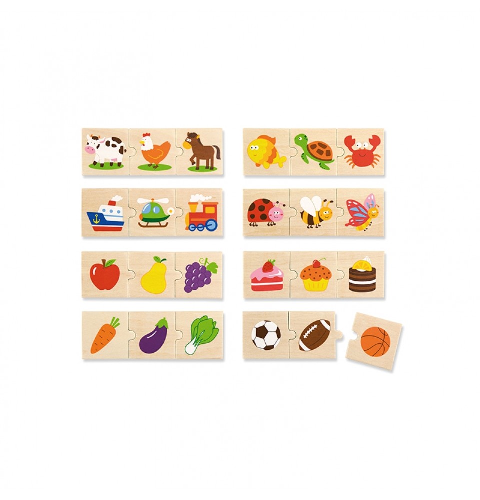 24 medinių dėlionės detalių rinkinys, kurios sujungiamos į aštuonis trijų detalių rinkinius. Jas sudaro trys gyvūnai, trys transporto priemonės arba trys daržovės. Vaiko užduotis, žinoma, yra jas suderinti. Tai labai geras lavinamasis žaislas, galintis vaikams suprantamai paaiškinti daugelį dalykų. Jis skatina loginį mąstymą ir vaizduotę. Paveikslėliai yra gražūs ir estetiškai patrauklūs, todėl žaislas ne tik lavina protą, bet ir malonus akiai.