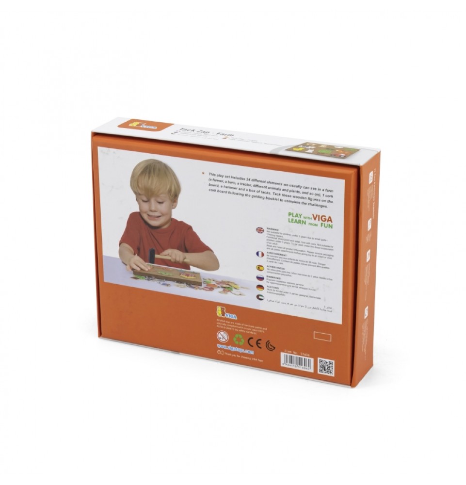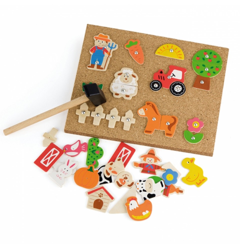 „Viga Toys“ kamštinė ūkio lenta yra puiki lenta jaunajam ūkininkui . Šis žaislas įkvėptas Montessori metodo. Rinkinį sudaro 24 mediniai paveikslėliai. , kamštinė lenta ir plaktukas . Kiekvienas medinis elementas turi skylę , o vaikas gali naudoti smeigtukus , kad įkaltų į lentą bet kokią formą. Vaikai gali laisvai išdėlioti elementus, taip pat pagal savo vaizduotę ir kūrybiškumą . Kamštiniai vinių kalimo žaislai lavina rankinius įgūdžius , loginį mąstymą ir susikaupimą . Elementai turi užapvalintus kraštus , todėl jie yra 100 % saugūs vaikams.