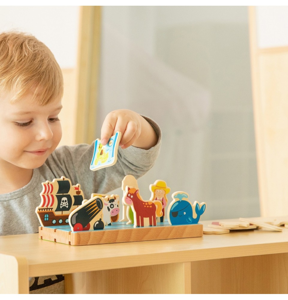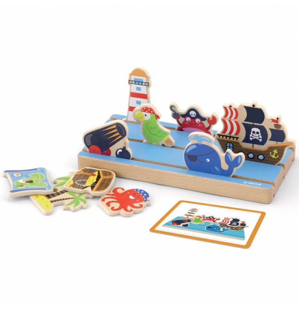 • mediniai elementai jūros nuotykių surinkimui: švyturys, krabas, patranka, aštuonkojis, banginis, papūga, sala su palmėmis, lobių skrynia, žemėlapis, piratų laivas,