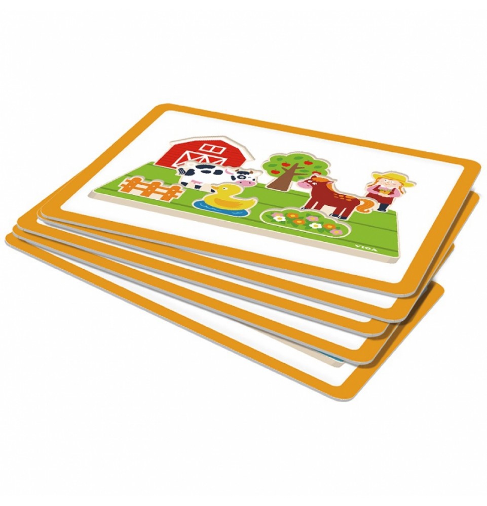 • mediniai ūkio elementai: tvartas, tvora, mergaitė, obelis, karvė, gaidys, gėlių lova, antis, arklys, traktorius su ūkininku,