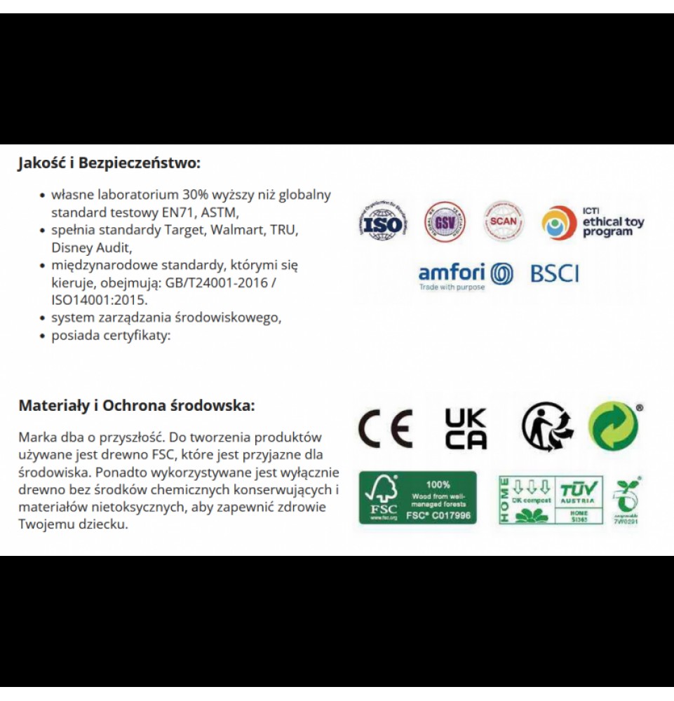 Vaikai nusipelno geriausių žaislų, todėl „Classic World“ užtikrina nepriekaištingą kokybės kontrolę bei kruopščiai prižiūrimą gamybos procesą. Visi žaislai yra pagaminti iš aukščiausios kokybės natūralių medžiagų, yra biologiškai skaidūs, hipoalerginiai ir draugiški aplinkai. Be to, gamyboje naudojami tik ekologiški vandens pagrindo dažai ir netoksiški klijai, todėl jie yra visiškai saugūs vaikams.