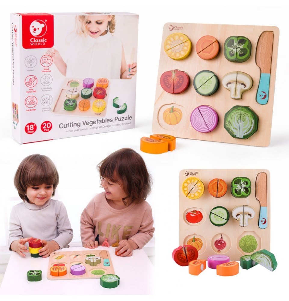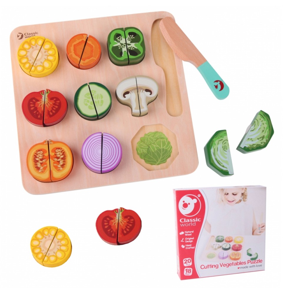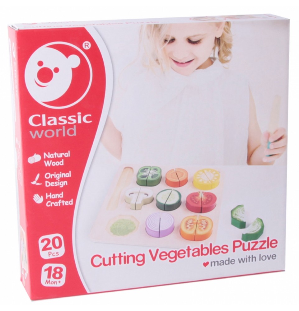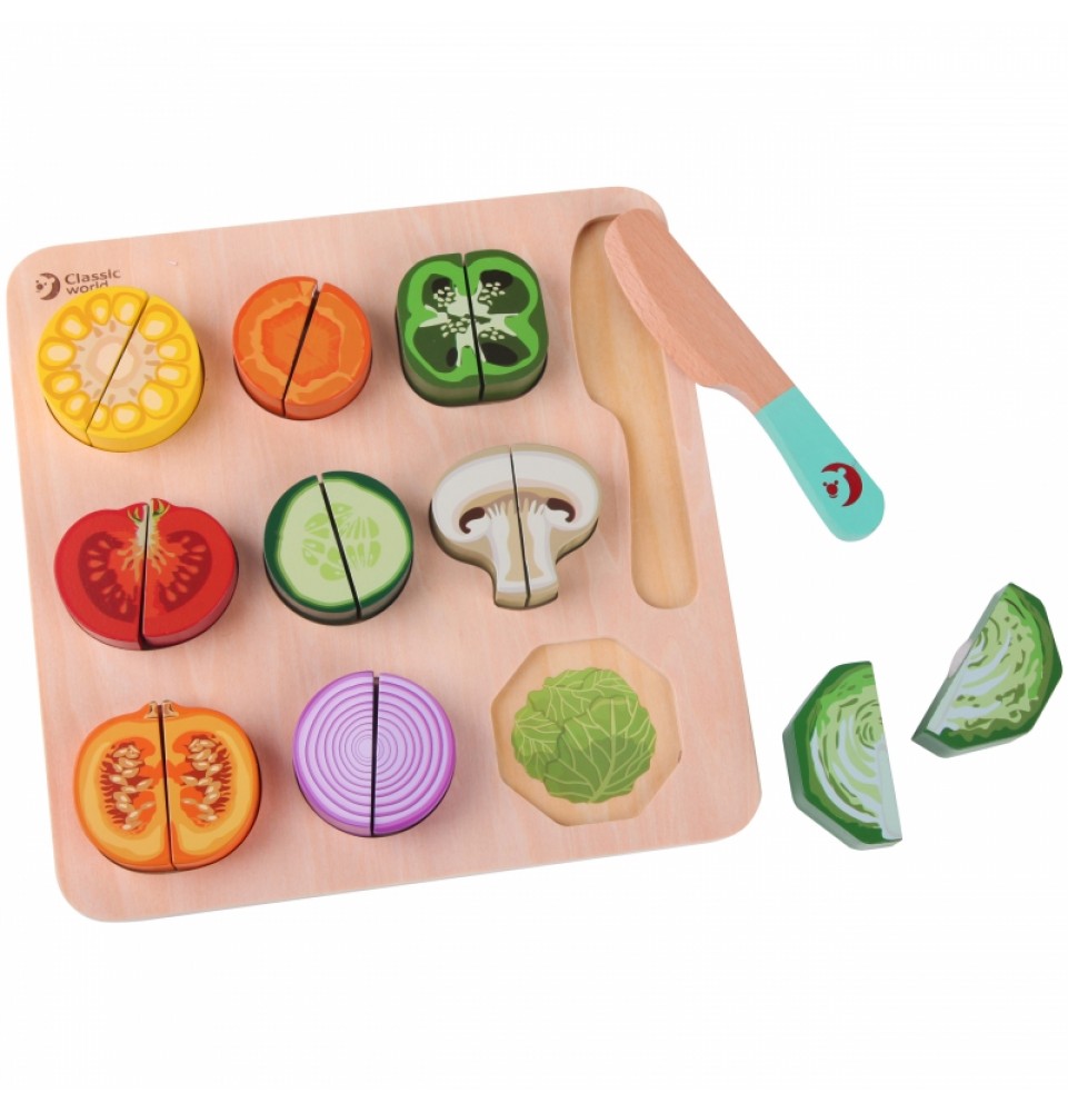 „Classic World“ medinis rinkinys „Daržovių pjaustyklės“ yra puikus žaislas maždaug 18 mėnesių amžiaus mažyliams. Jis leidžia jūsų vaikui žaisti virėją – praktikuotis pjaustyti daržoves, lavinti kūrybinius vaidmenų žaidimo įgūdžius ir lavins pojūčius. Spalvingos lipnios detalės imituoja tikrus daržovių gabalėlius, kai jūsų vaikas juos pjausto ir vėl sujungia. Pagamintas iš medžio ir dažytas netoksiškais dažais, jis yra saugus ir patogus mažoms rankytėms. Puiki dovana, kuri derina mokymąsi su pramogomis ir skatina vystymąsi įvairiais lygmenimis.