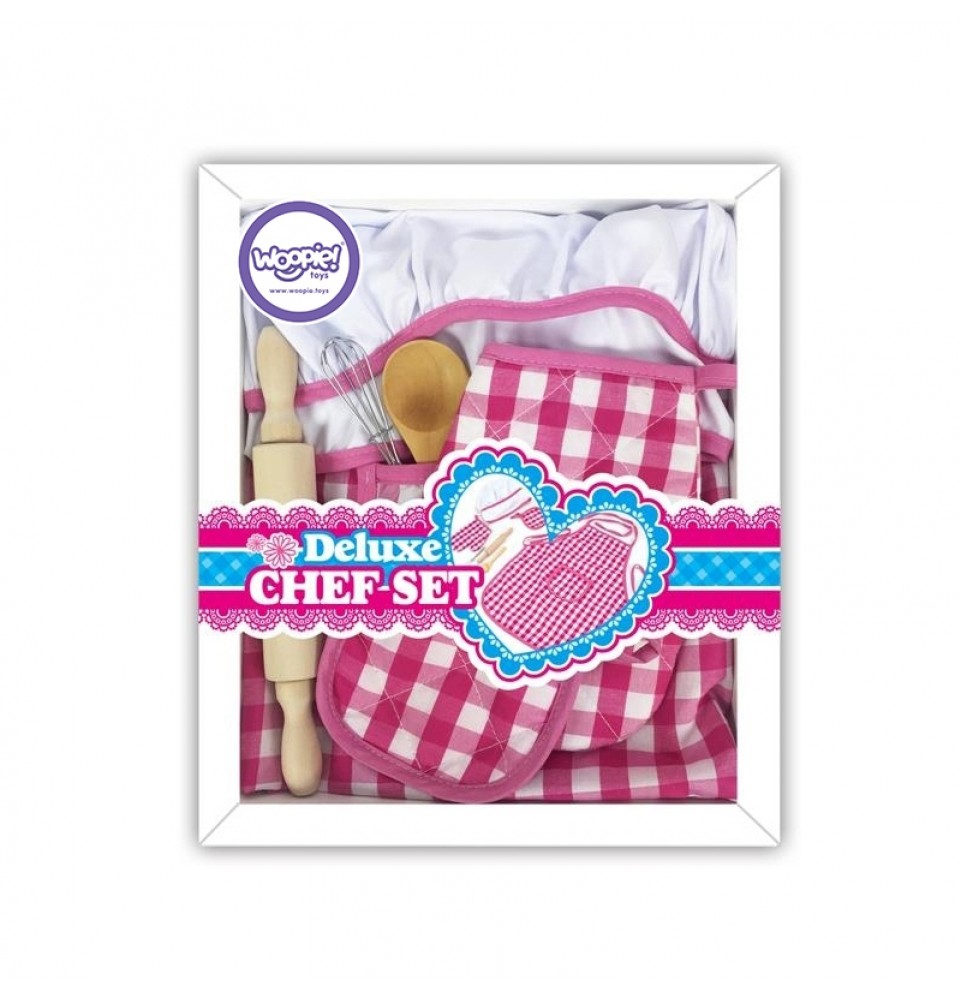 „WOOPIE“ virėjo rinkinys, virėjo uniforma su priedais, yra tobulas produktas bet kuriam mažajam virėjui. Gražiai supakuotas, tai puiki dovana jaunajam virėjui. Rinkinį sudaro prijuostė, kepurė, orkaitės pirštinė, medžiaginis kilimėlis, 20 cm kočėlas, medinis šaukštas ir metalinis plaktuvas. Kiekvienas mažylis mėgsta padėti virtuvėje, todėl šis rinkinys bus puikiai aprūpintas reikalingais priedais!