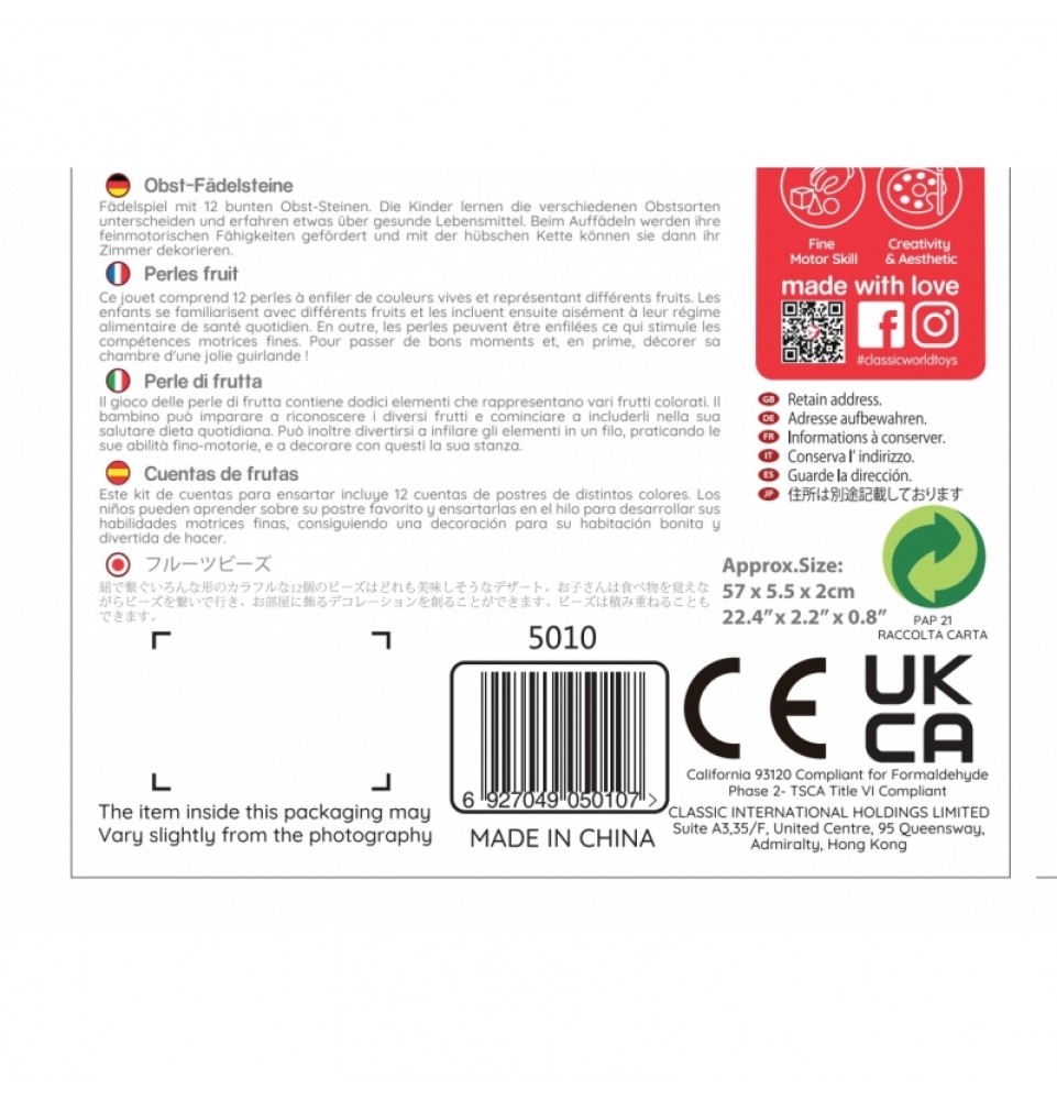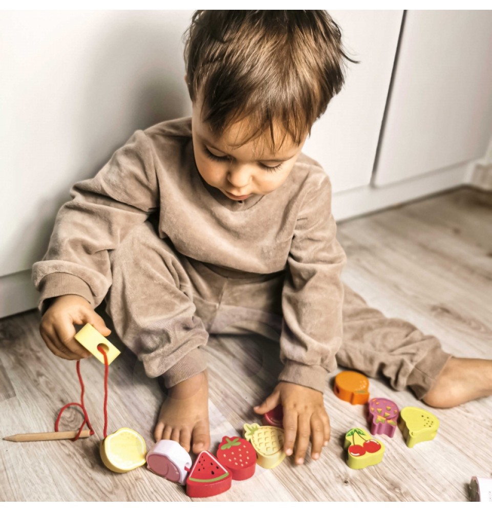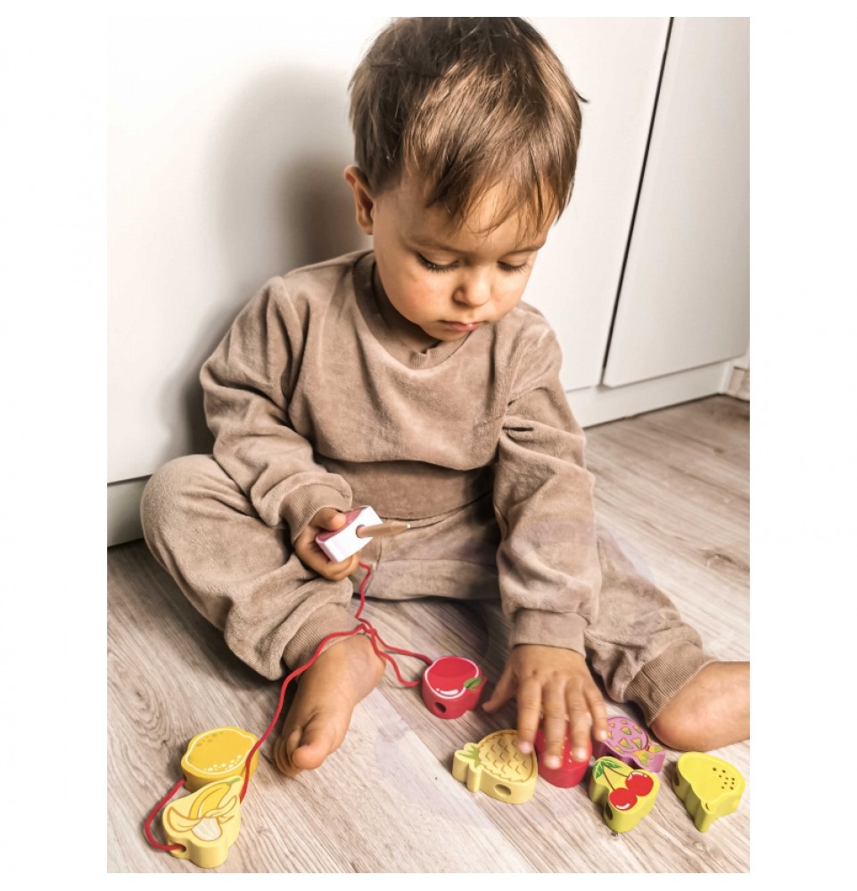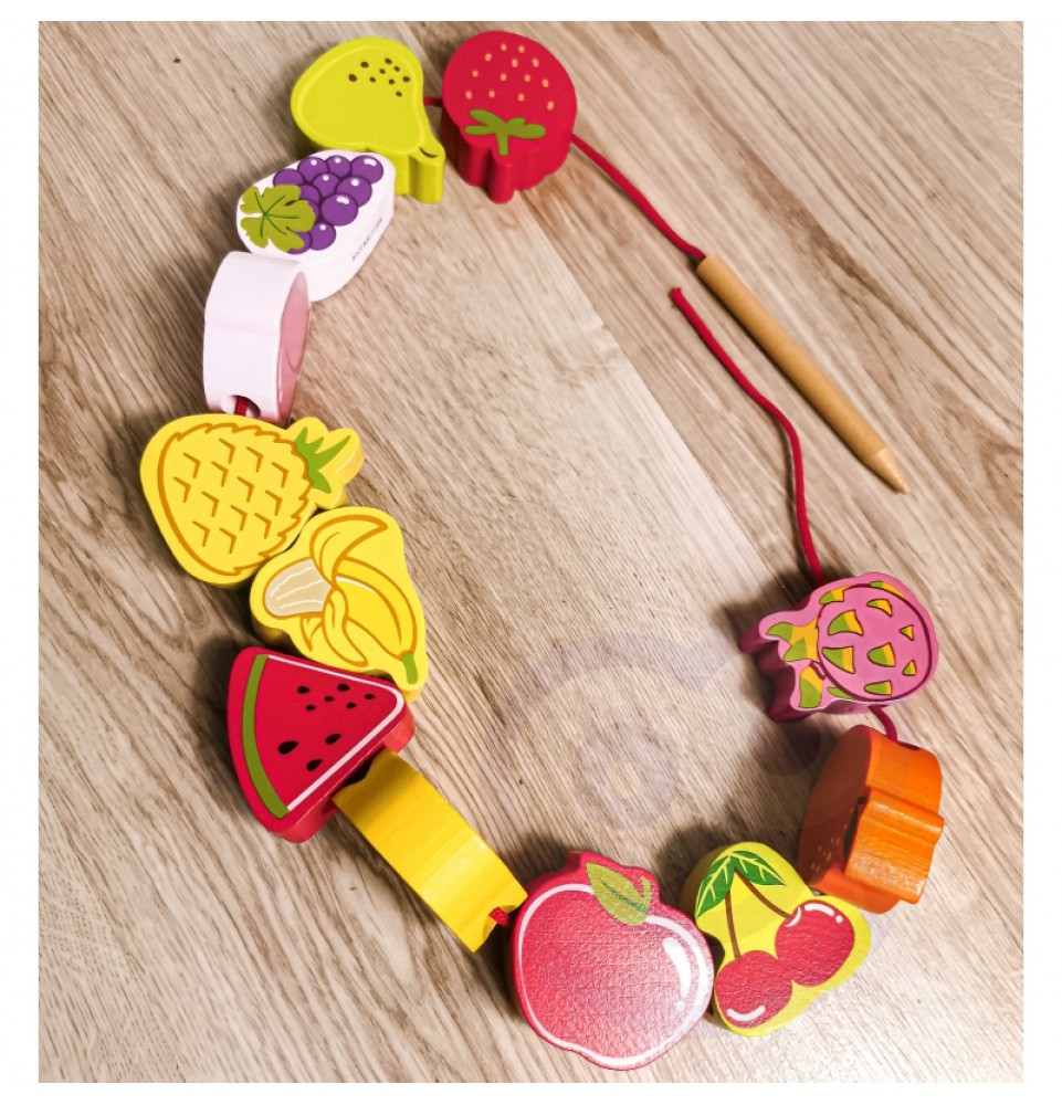 Šis medinis garsaus prekės ženklo „Classic World“ vaisių siūlo vėrimo žaislas yra puikus žaislas jūsų jauniausiems tyrinėtojams. Rinkinį sudaro 12 medinių vaisių formos kaladėlių, kurios medine adata suveriamos ant siūlo. Šis žaislas padės jūsų vaikui lavinti smulkiąją motoriką ir praplės vaizduotę. Jis taip pat skirtas išmokyti vaikus vaisių pavadinimų ir jų spalvų. Šis rinkinys sužadins jūsų mažylio smalsumą ir suteiks valandų valandas pramogų – kaladėles galima išdėlioti bet kokiu jiems patinkančiu būdu.