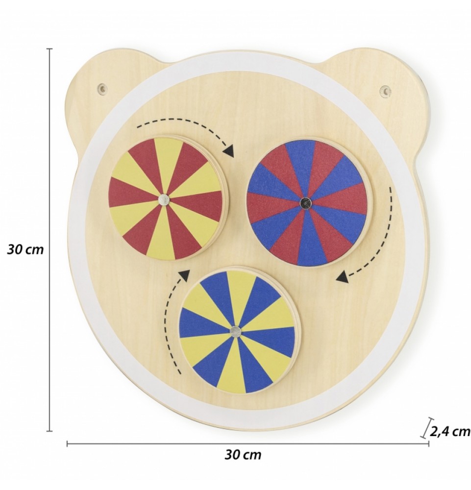 Viena iš medinių lentelių su žavinga meškiuko galva serijos. Lenta turi tris ratukus, kurių kiekvienas nudažytas taip, kad sukant sukurtų optines iliuzijas. Šis žaislas padeda lavinti vaikų loginį mąstymą ir mokosi atpažinti spalvas . Šis gaminys puikiai tinka tiek naudoti namuose, tiek ikimokyklinio ugdymo įstaigose. Įdomus lentos dizainas tikrai pritrauks kiekvieno vaiko dėmesį. Pagaminta iš lakuotos medienos ir nudažyta netoksiškais ryškių spalvų dažais, ji pradžiugins kiekvieną naudotoją ir suteiks daug smagių žaidimų akimirkų. Tinka 18 mėnesių ir vyresniems vaikams, visa mūsų kolekcija apima visą meškiuko galvūgalių lentelių liniją.