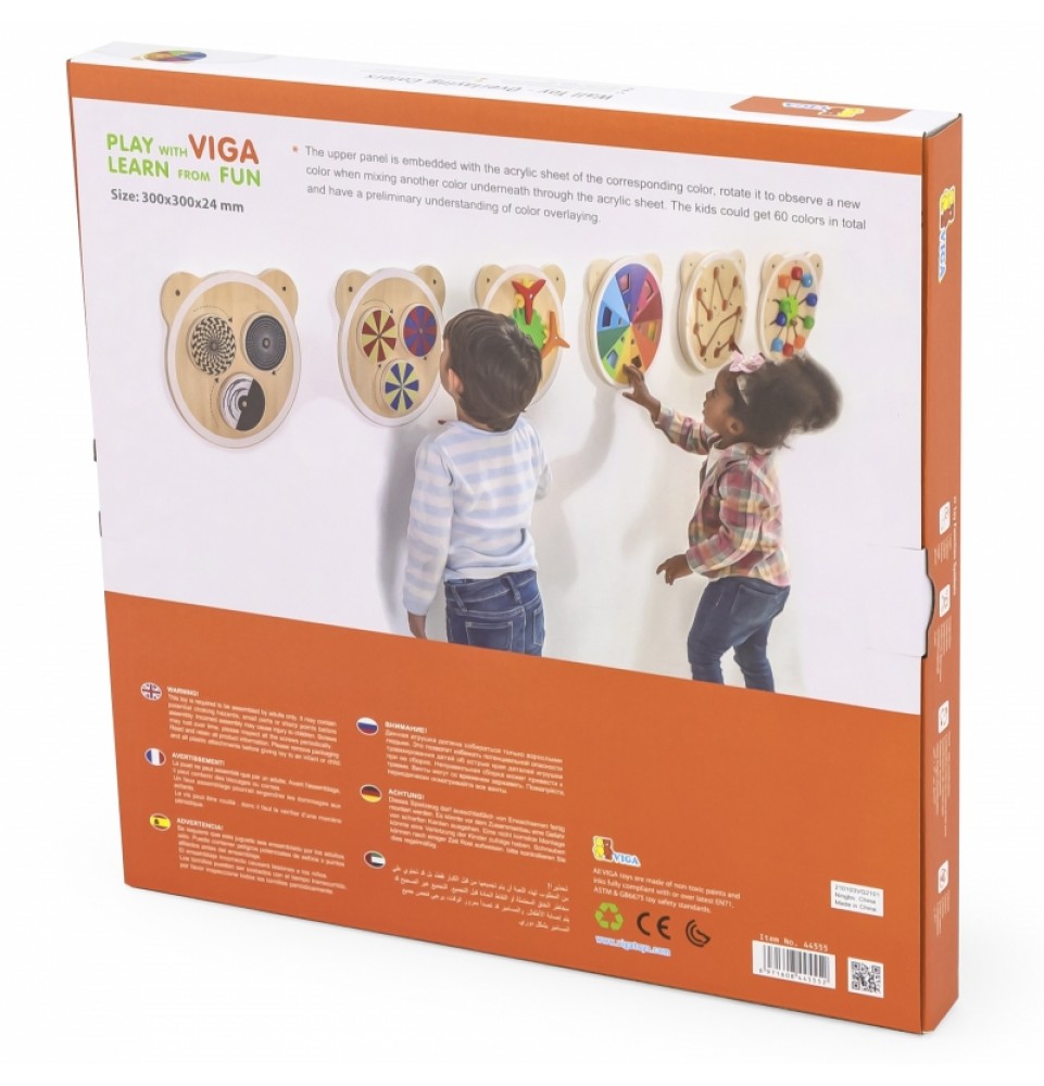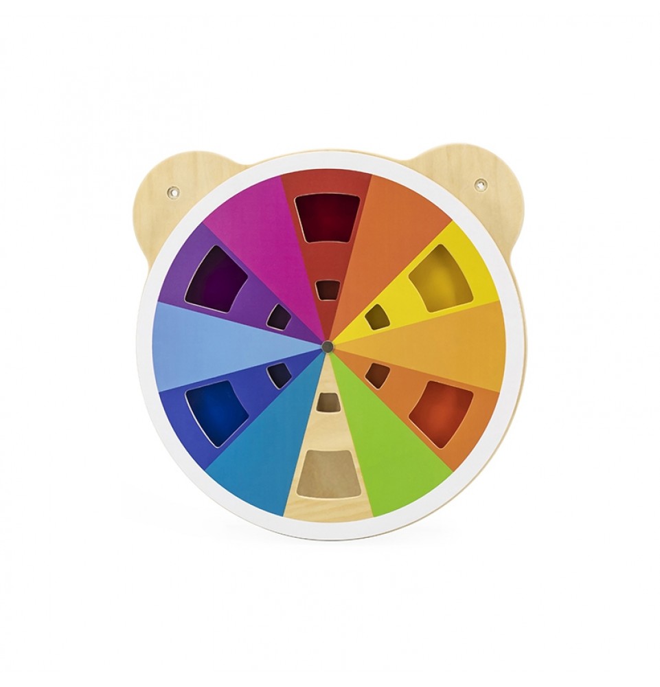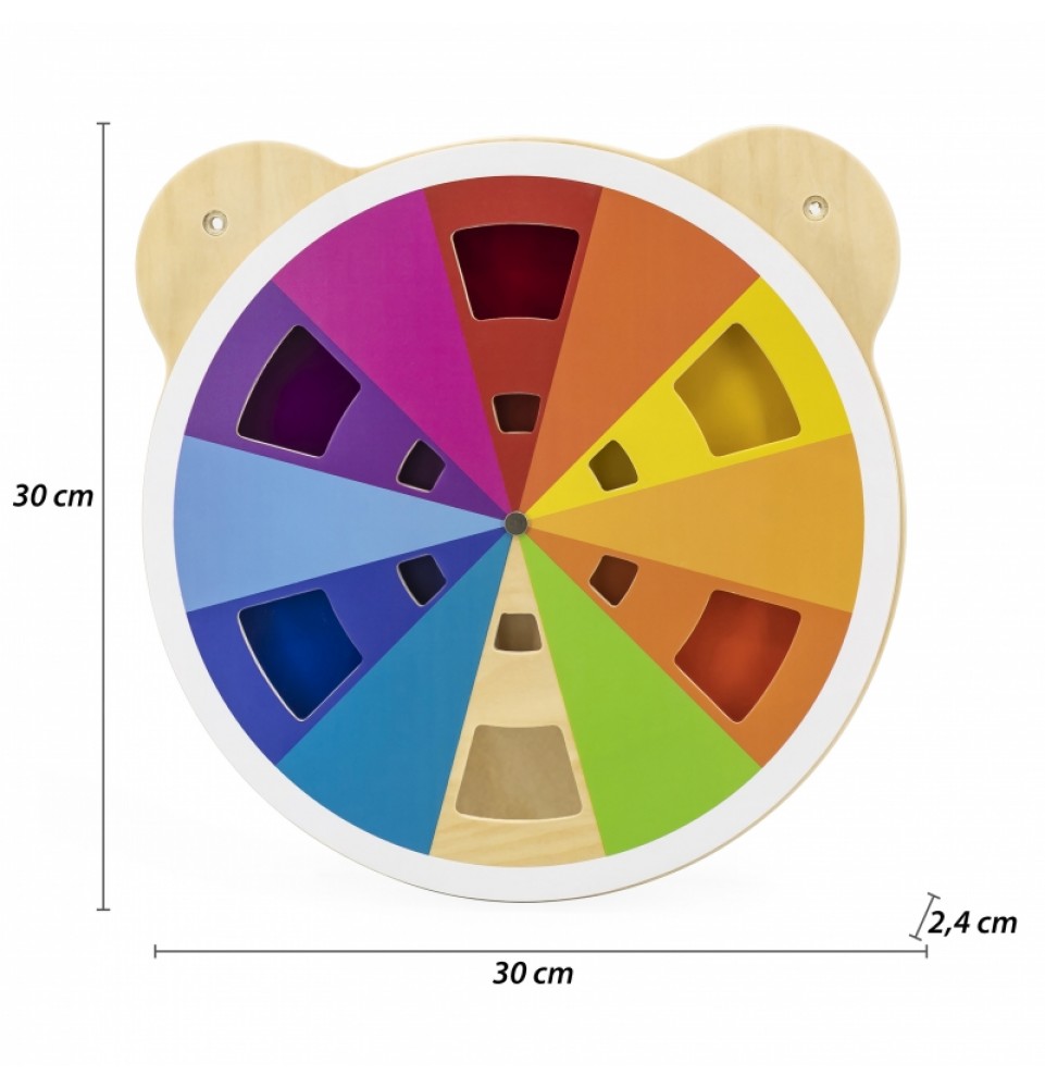 Viena iš medinių lentelių su žavinga meškiuko galva serijos . Šios lentos priekyje yra įvairių atspalvių akrilinis diskas. Sukdami diską, vaikai gali maišyti spalvas bet kokiu būdu ir atrasti, kokios kitos spalvos sukuriamos . Iš viso galima sukurti 60 skirtingų spalvų. Šis gaminys puikiai tinka tiek naudoti namuose, tiek ikimokyklinio ugdymo įstaigose. Įdomus lentos dizainas tikrai pritrauks kiekvieno vaiko dėmesį. Visa lenta pagaminta iš lakuotos medienos ir dažyta netoksiškais ryškių spalvų dažais, kurie pradžiugins kiekvieną vartotoją ir suteiks daug džiaugsmo. Šis gaminys skirtas 18 mėnesių ir vyresniems vaikams. Siūlome visą meškiuko galvūgalių lentelių seriją.