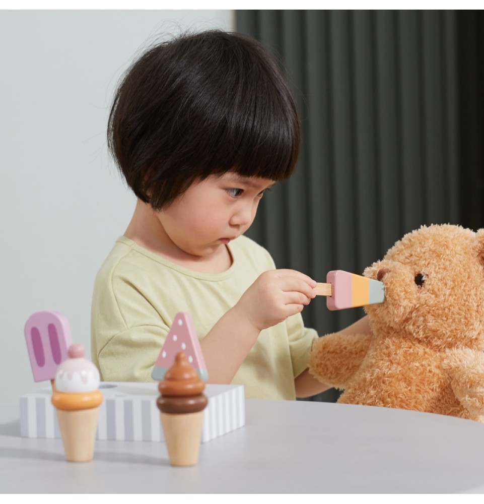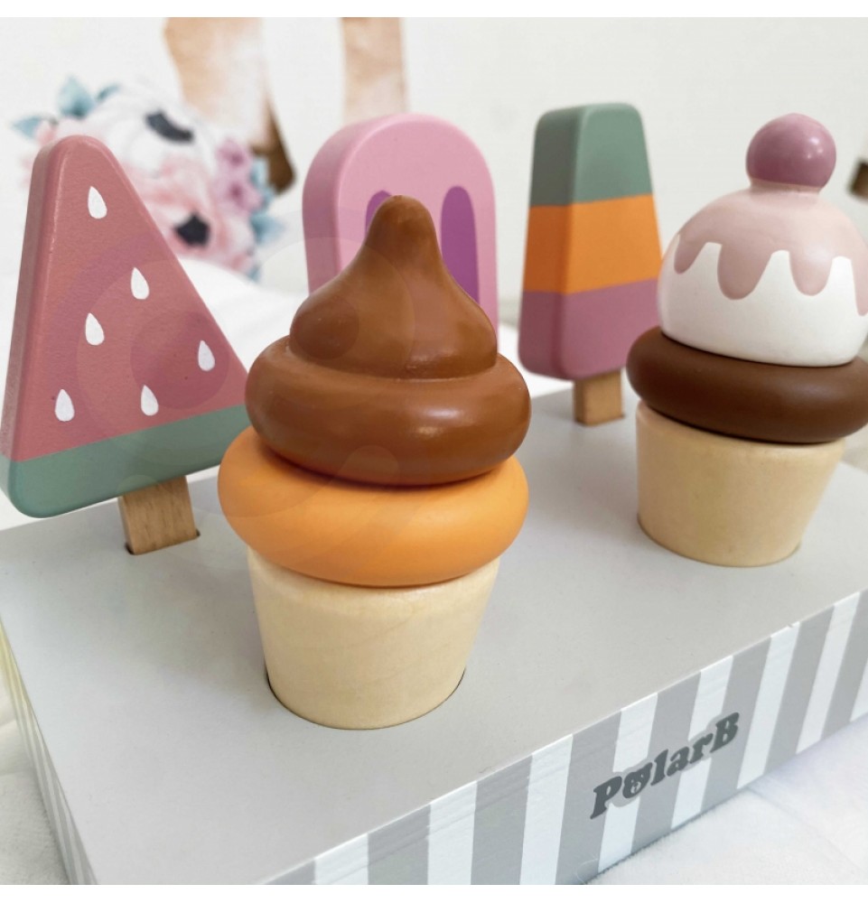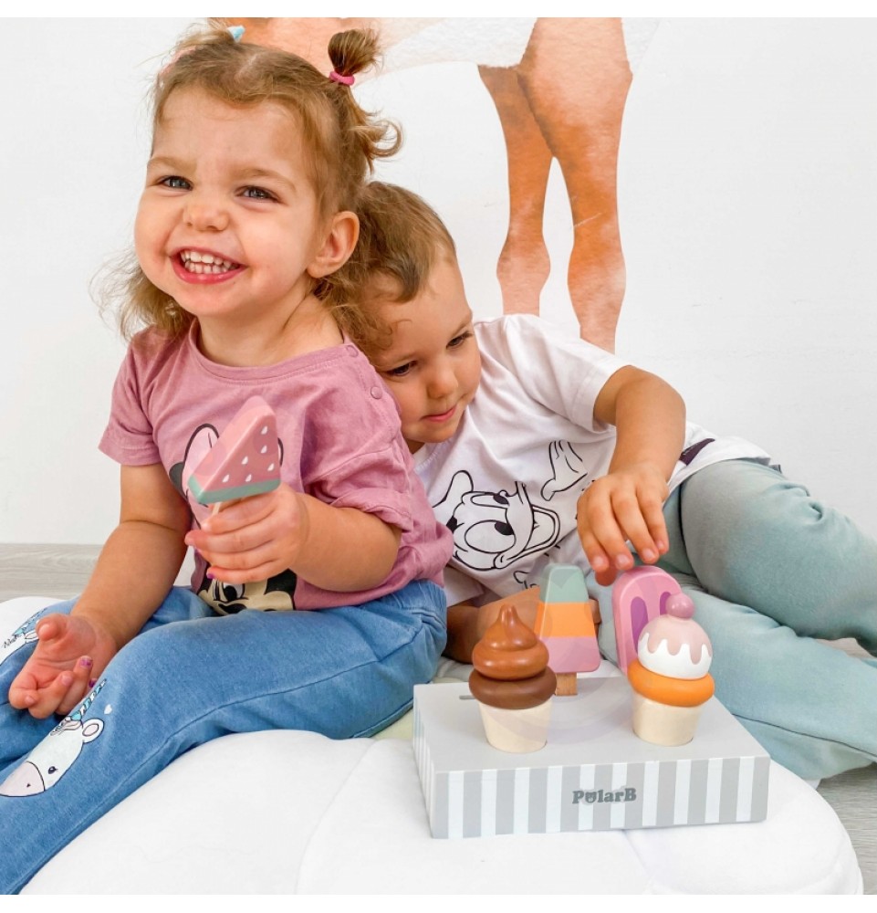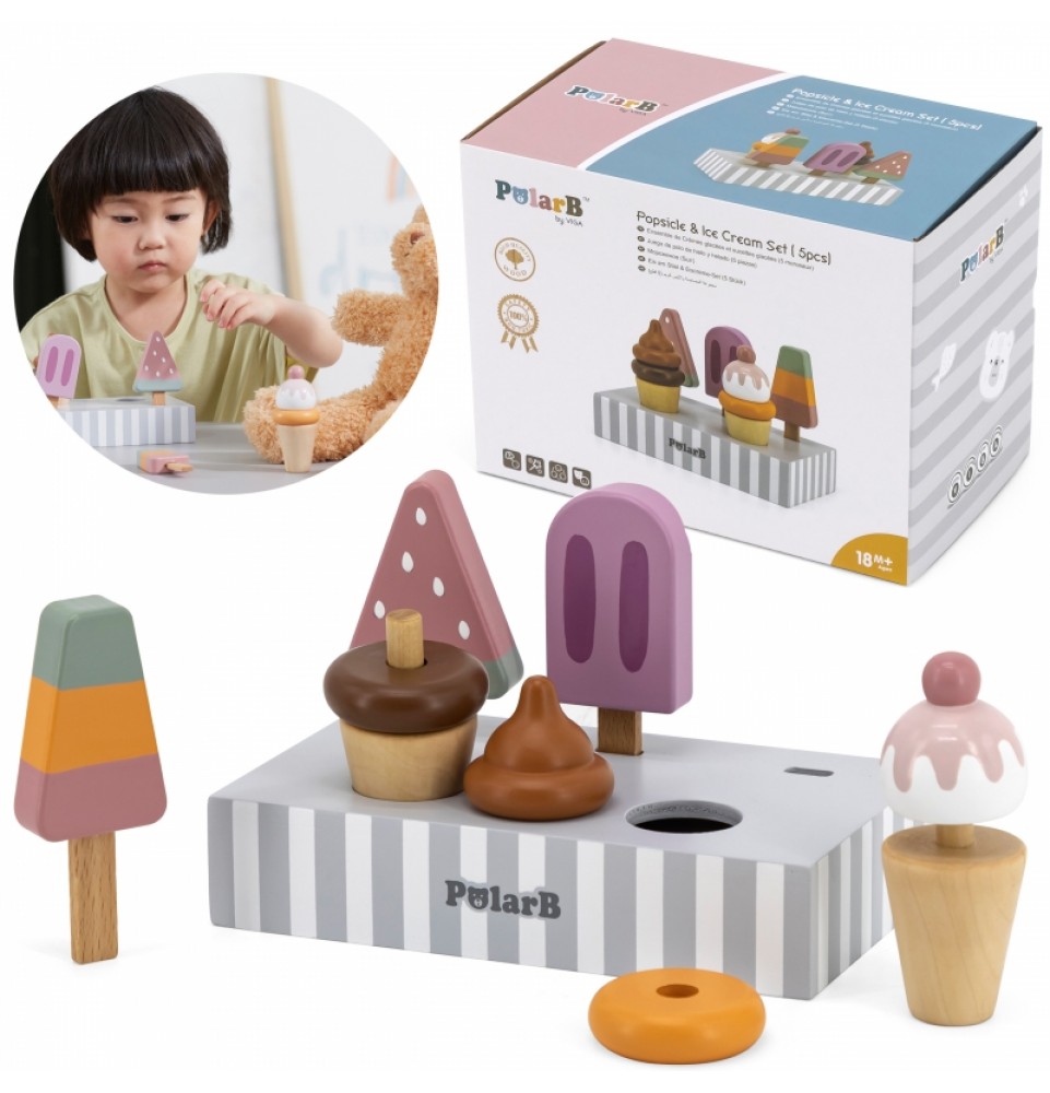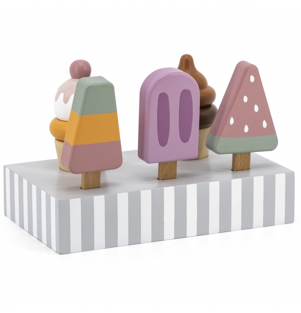 Medinis penkių ledų rinkinys, puikiai tinkantis desertui karštą dieną. Ledai yra gražių spalvų ir skanūs, pagaminti kruopščiai atkreipiant dėmesį į detales. Šis medinis rinkinys puikiai tinka žaisti parduotuvę arba kaip virtuvės aksesuaras. Puiki kokybė, žavios spalvos, praktiškumas ir funkcionalumas. Žaidimų namelis, parduotuvė ir suaugusiųjų vaidmenų imitavimas yra kūrybingi būdai kurti socialinius santykius, lavinti ir mokytis žodyno.