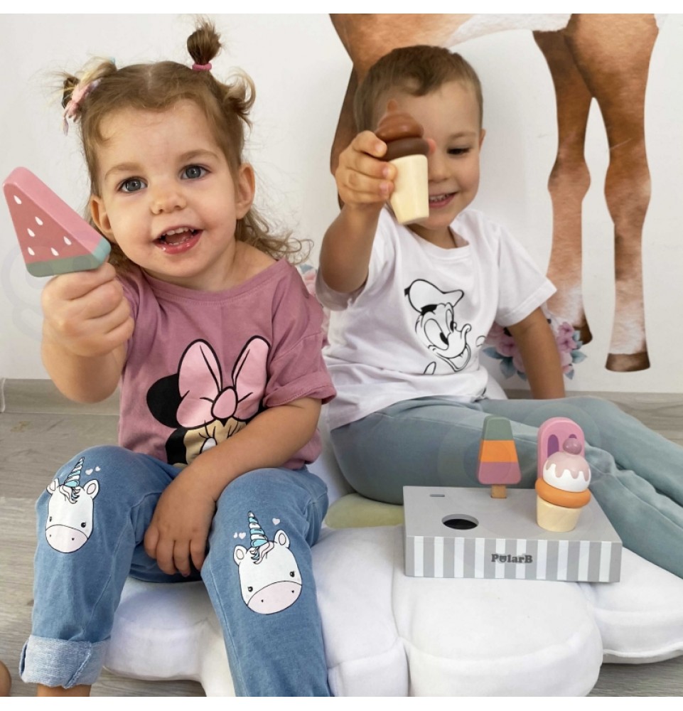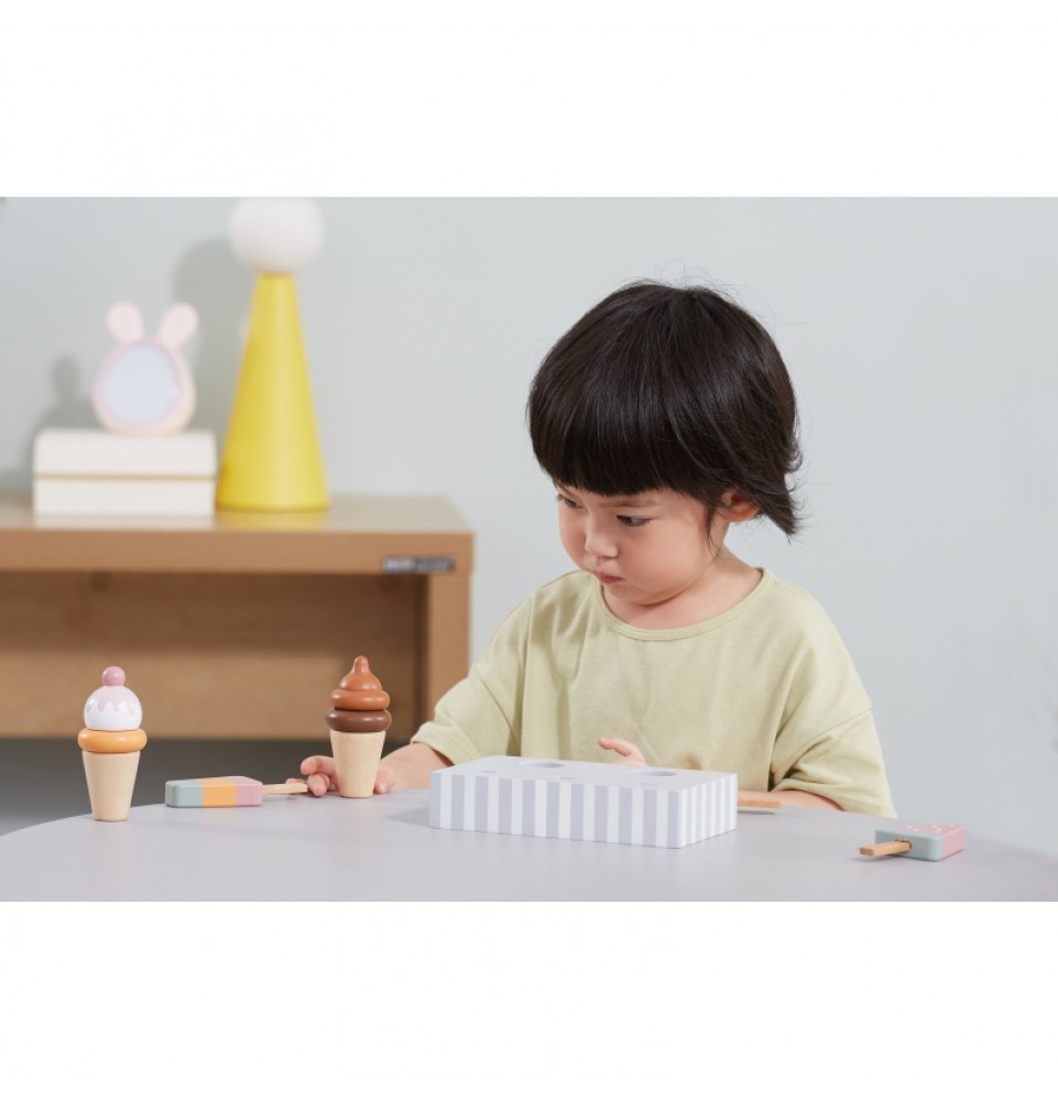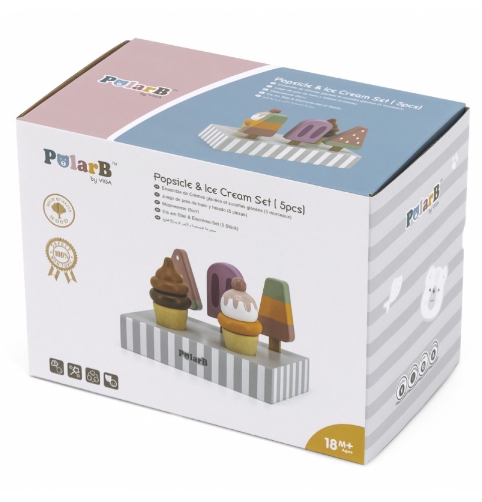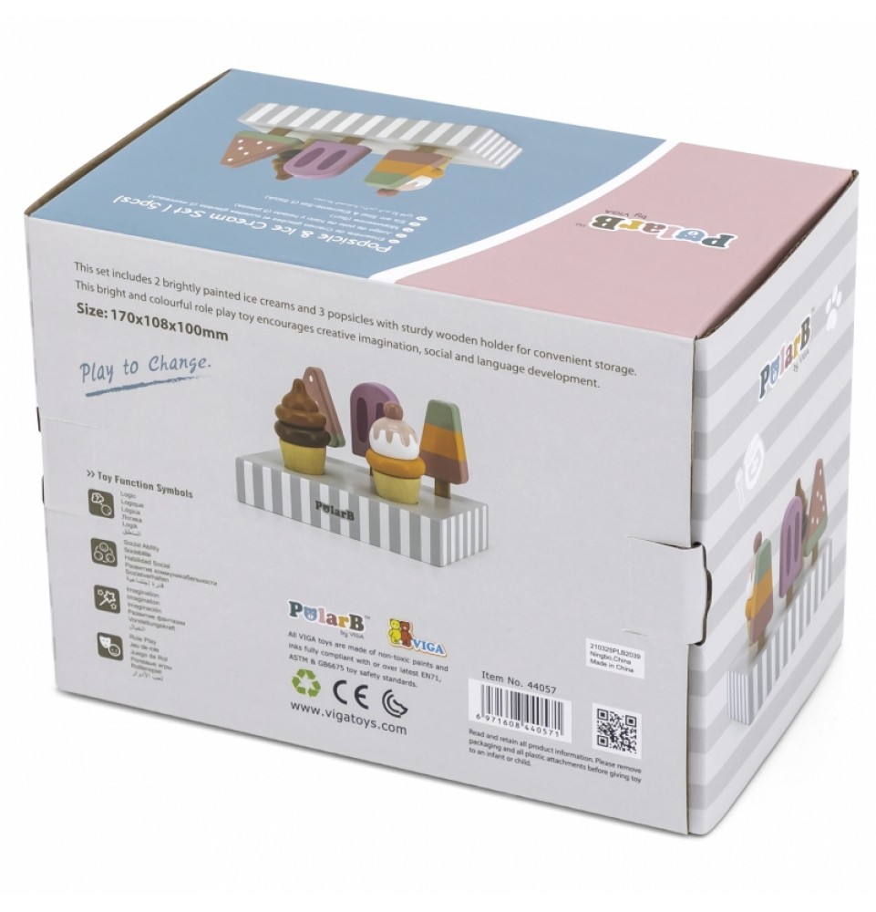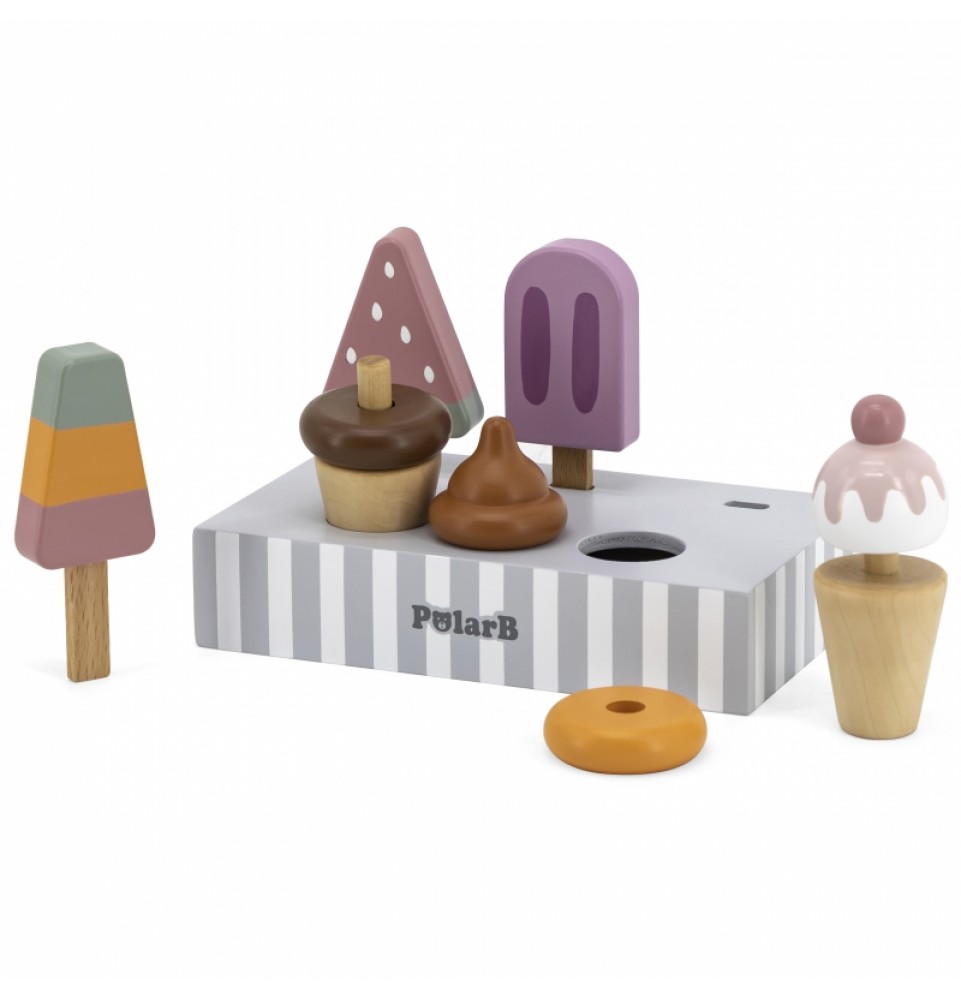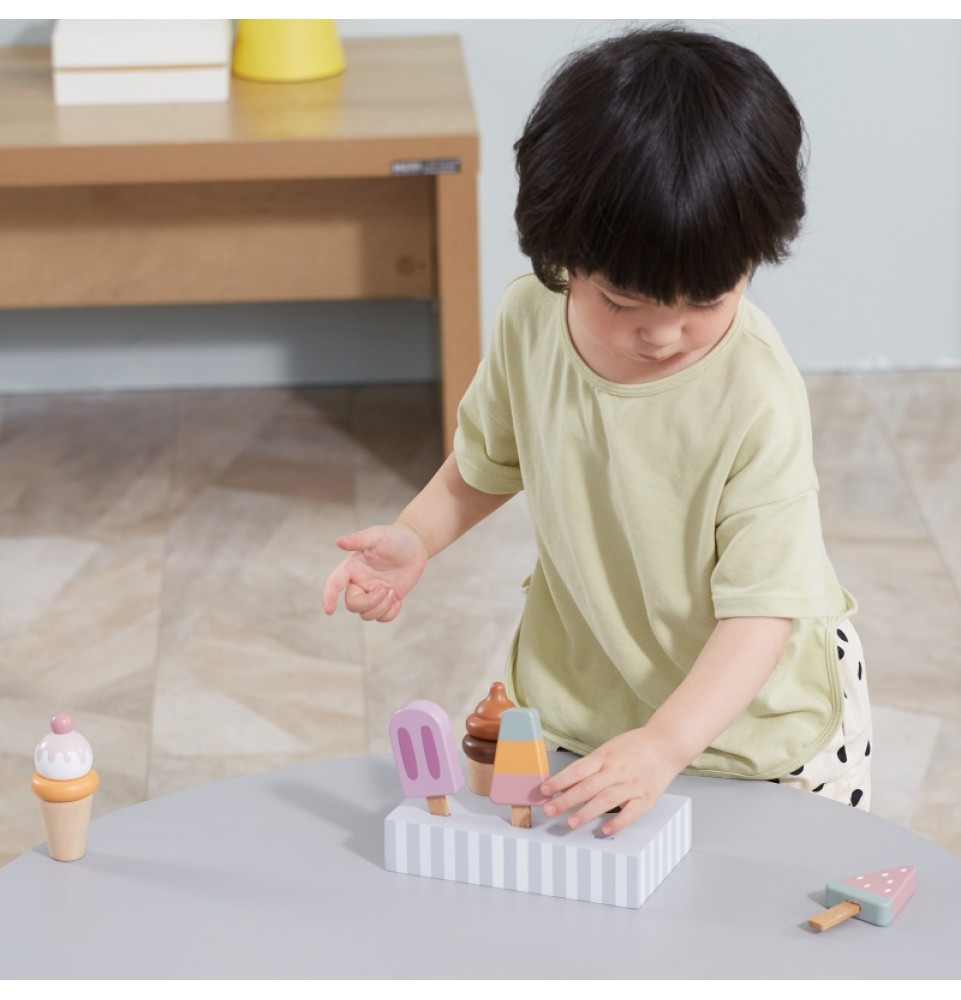 Medinis penkių ledų rinkinys, puikiai tinkantis desertui karštą dieną. Ledai yra gražių spalvų ir skanūs, pagaminti kruopščiai atkreipiant dėmesį į detales. Šis medinis rinkinys puikiai tinka žaisti parduotuvę arba kaip virtuvės aksesuaras. Puiki kokybė, žavios spalvos, praktiškumas ir funkcionalumas. Žaidimų namelis, parduotuvė ir suaugusiųjų vaidmenų imitavimas yra kūrybingi būdai kurti socialinius santykius, lavinti ir mokytis žodyno.