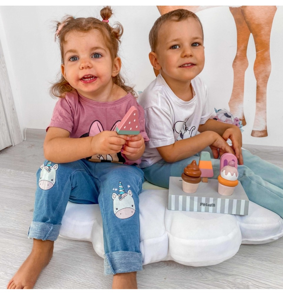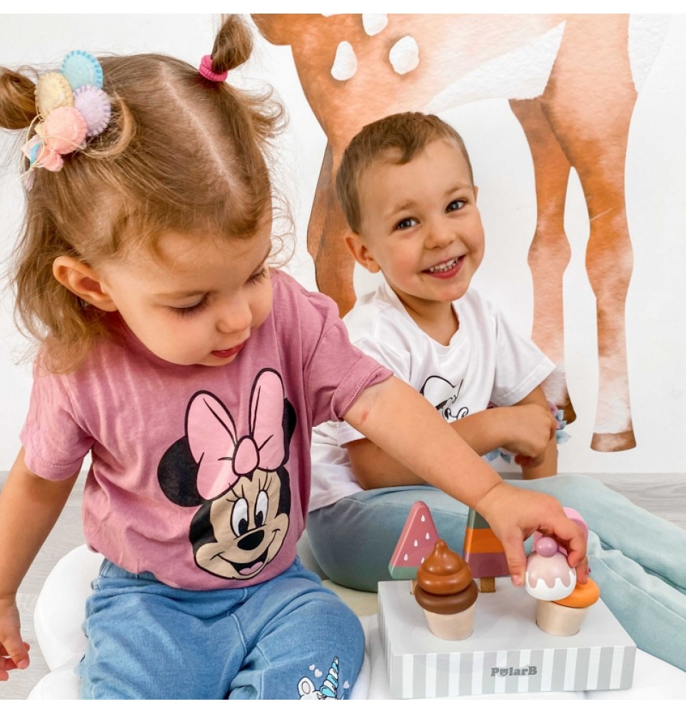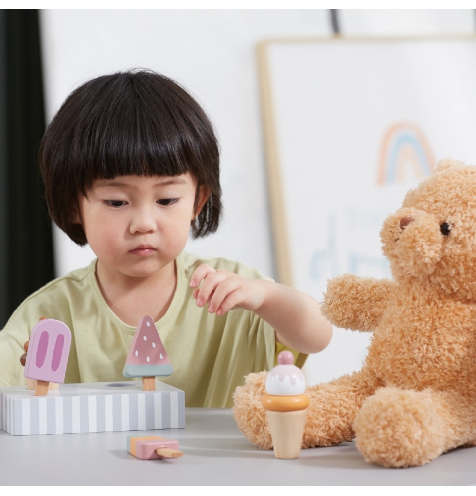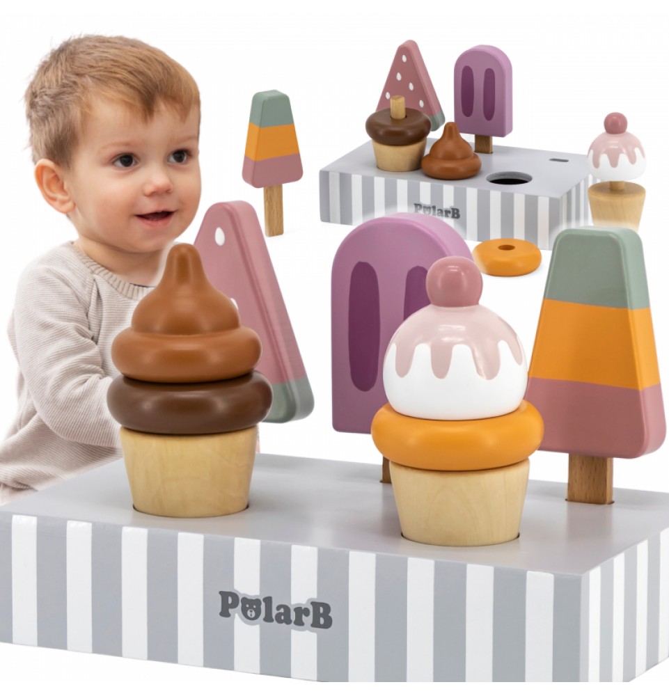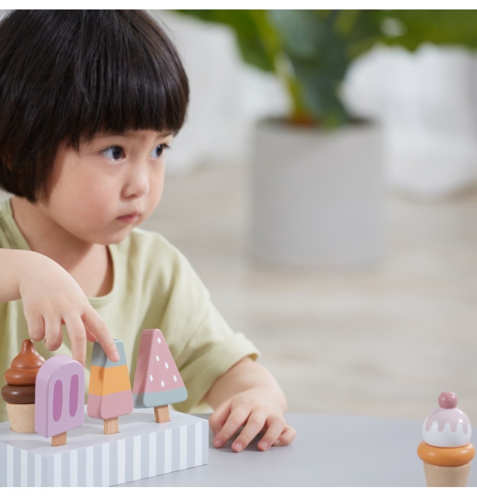 Medinis penkių ledų rinkinys, puikiai tinkantis desertui karštą dieną. Ledai yra gražių spalvų ir skanūs, pagaminti kruopščiai atkreipiant dėmesį į detales. Šis medinis rinkinys puikiai tinka žaisti parduotuvę arba kaip virtuvės aksesuaras. Puiki kokybė, žavios spalvos, praktiškumas ir funkcionalumas. Žaidimų namelis, parduotuvė ir suaugusiųjų vaidmenų imitavimas yra kūrybingi būdai kurti socialinius santykius, lavinti ir mokytis žodyno.