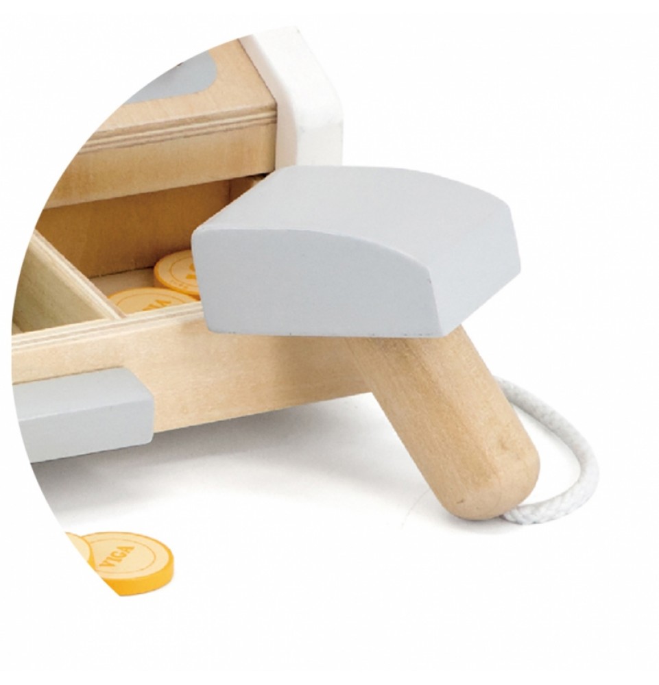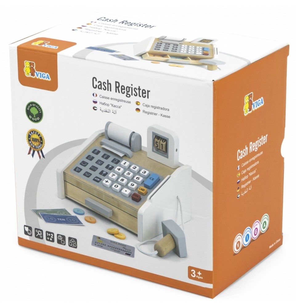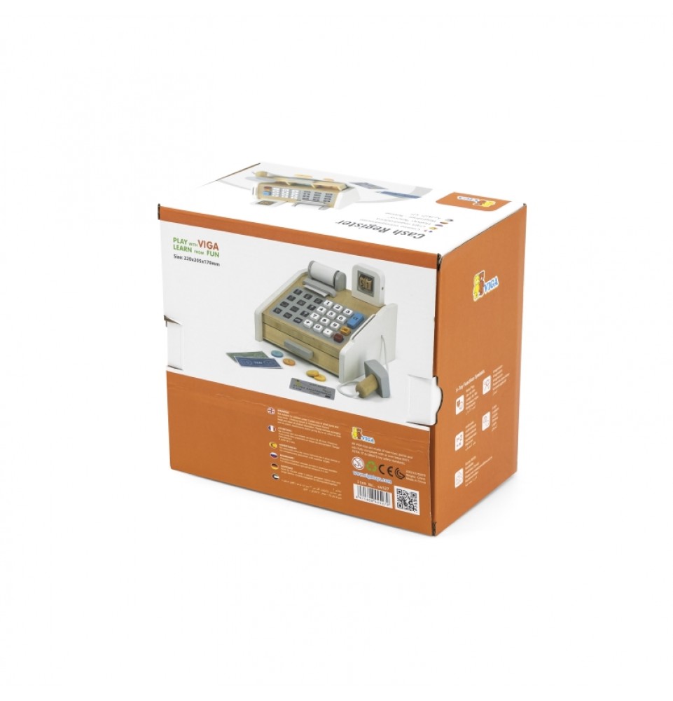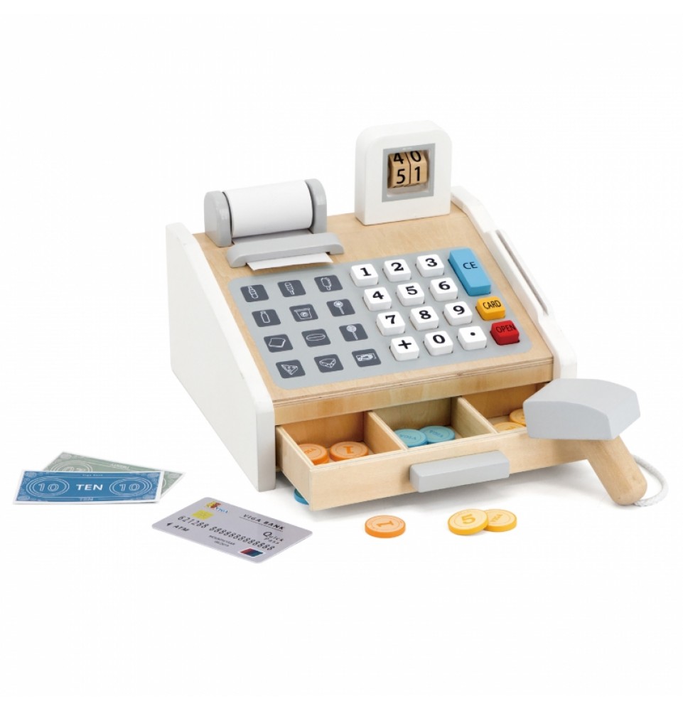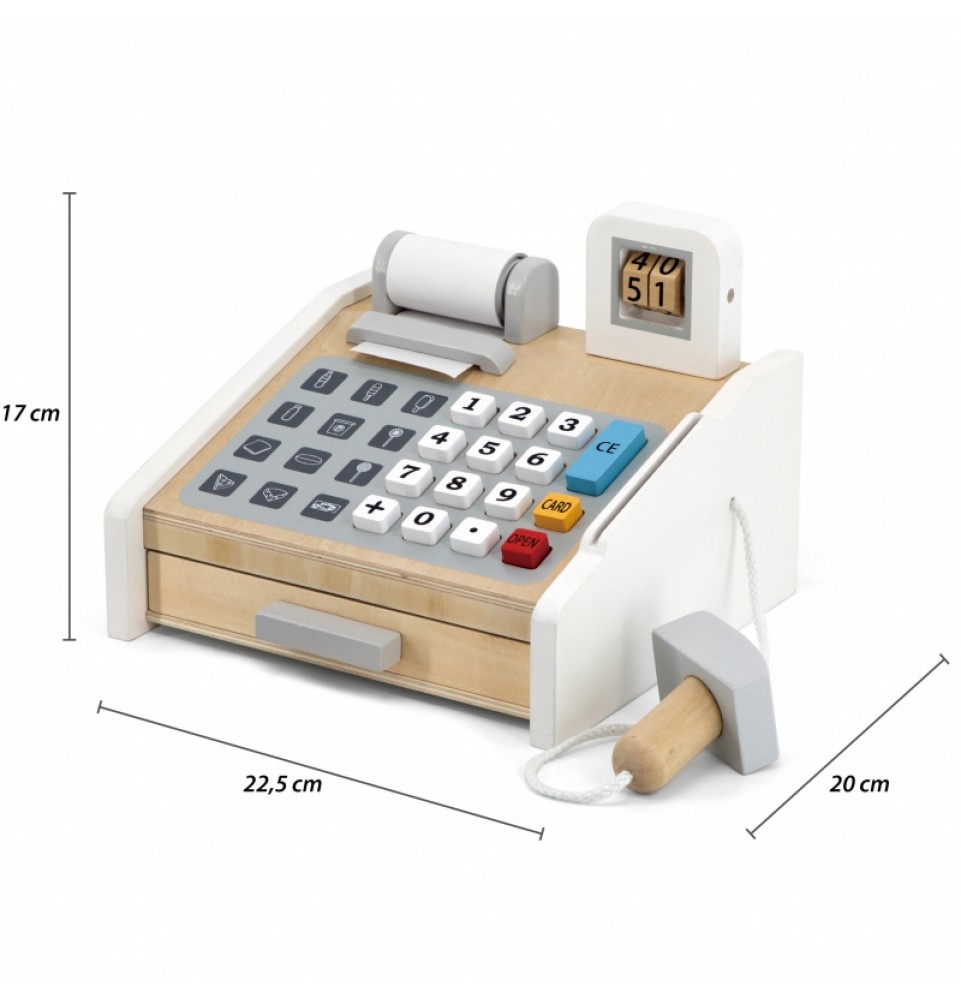 Šis kasos aparatas yra puikus medinis žaislas, leidžiantis žaisti vaidmenimis daugybę scenų, kurios gali vykti parduotuvėje. Vaikai gali įsivaizduoti kasininką arba klientą ir kartu lavinti socialinę sąveiką bei bendravimo įgūdžius . Grynieji pinigai ar kortelė? Suskaičiuokite sumą, priimkite pinigus ir atiduokite teisingą grąžą. Kasos aparate yra banknotai, monetos ir mokėjimo kortelė. Vaikai gali mokytis linksmai! Mokslų karalienė – matematika nebebus bauginanti.