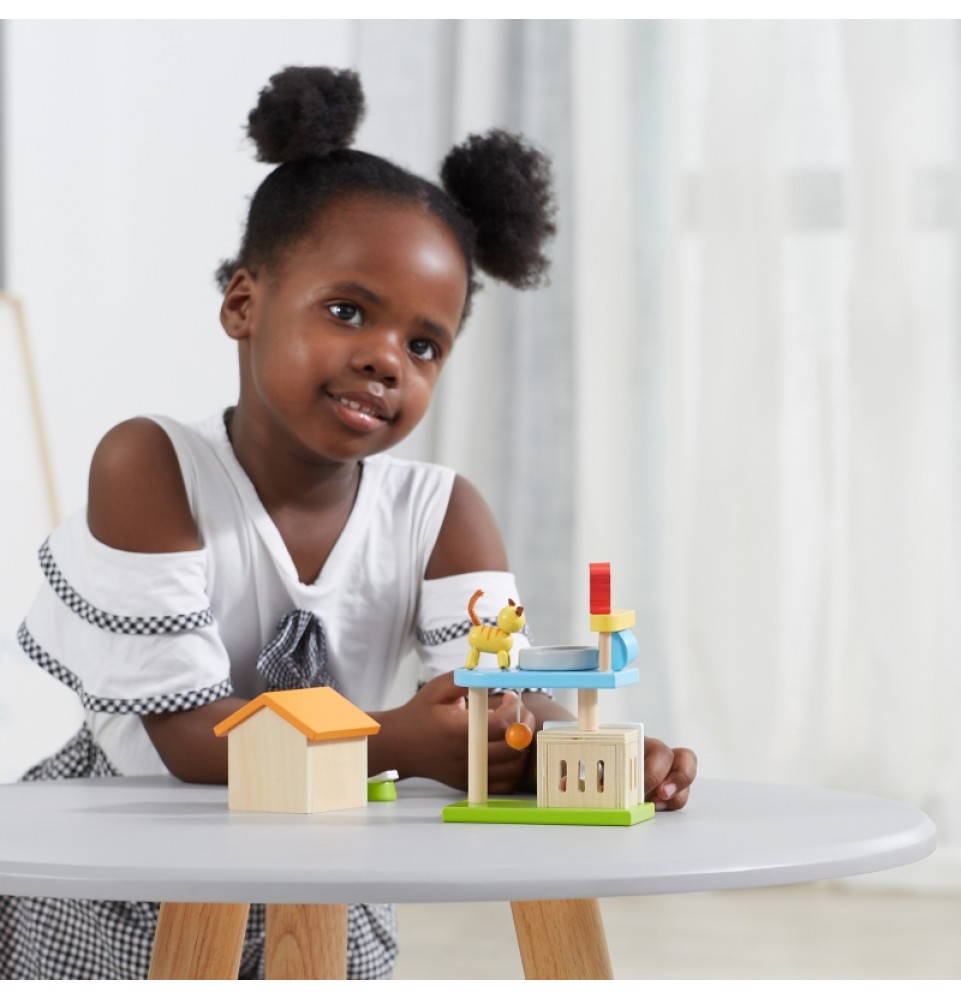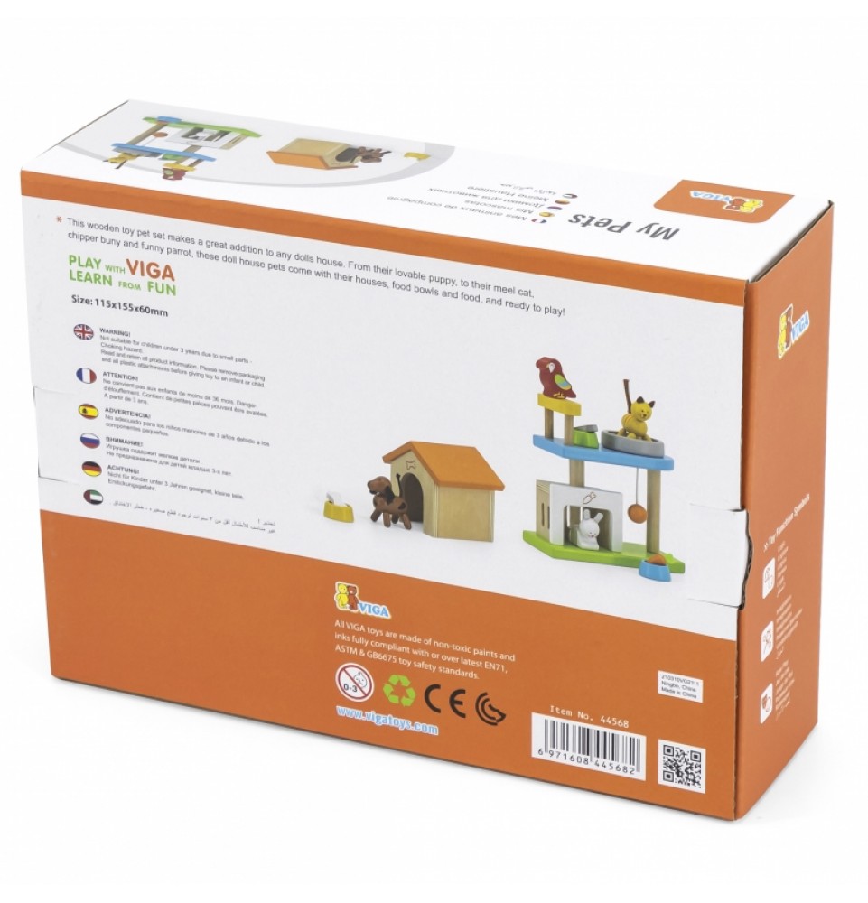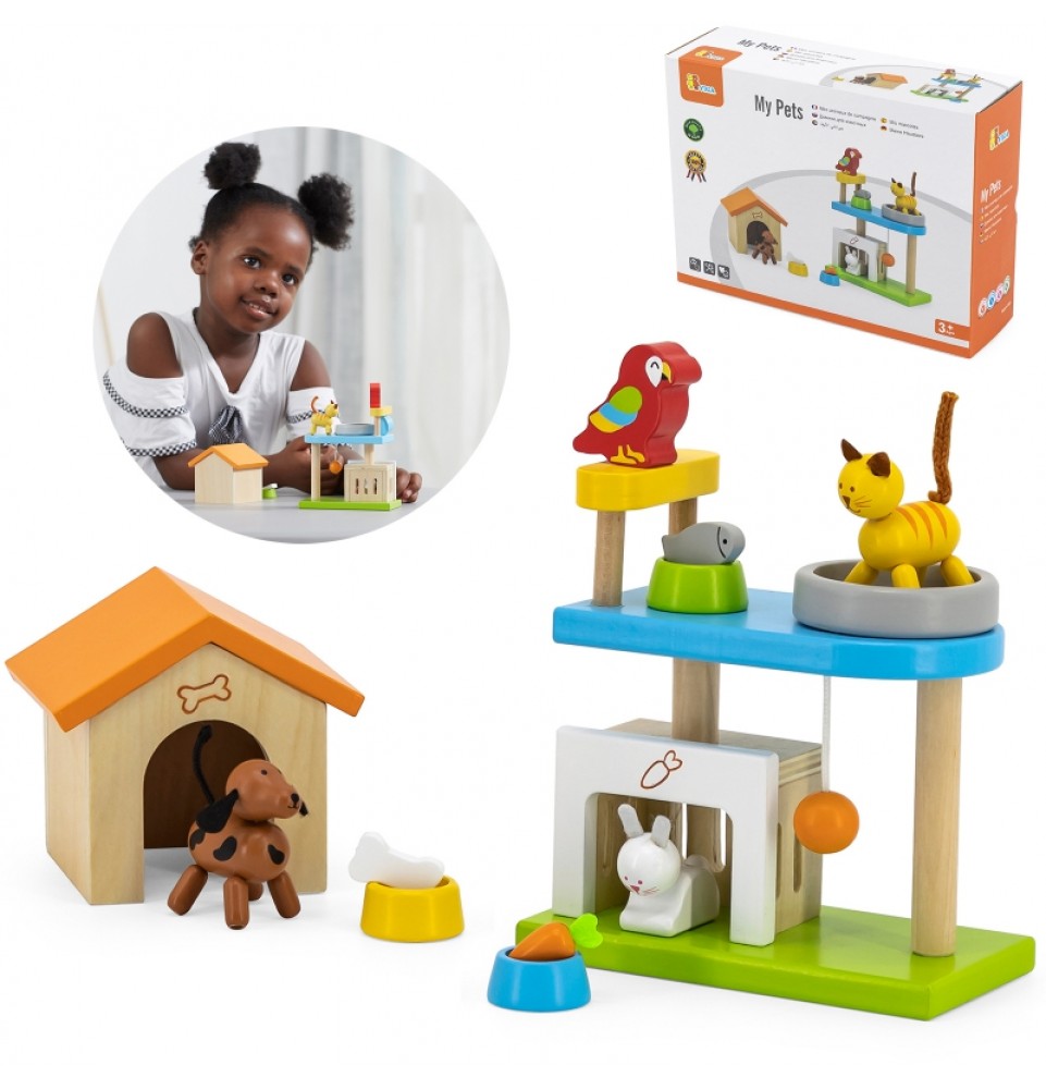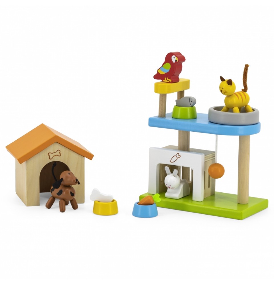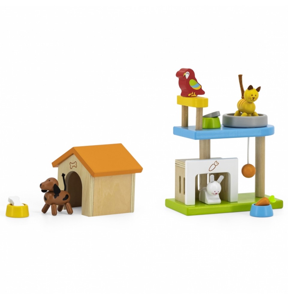 Šis medinių gyvūnų rinkinys puikiai papildys bet kurį lėlių namelį. Rinkinį sudaro įvairūs gyvūnai – žavingas šuniukas, kačiukas, zuikutis, papūga – kartu su jų nameliais ir mini žaidimų aikštele. Vaikai mėgsta kurti istorijas, o šis rinkinys yra puikus būdas sužadinti jų vaizduotę.
