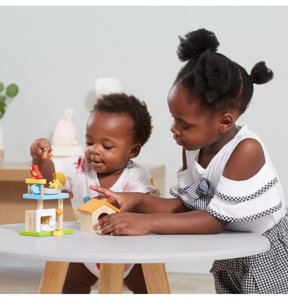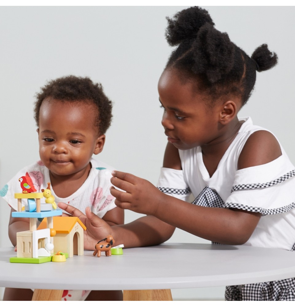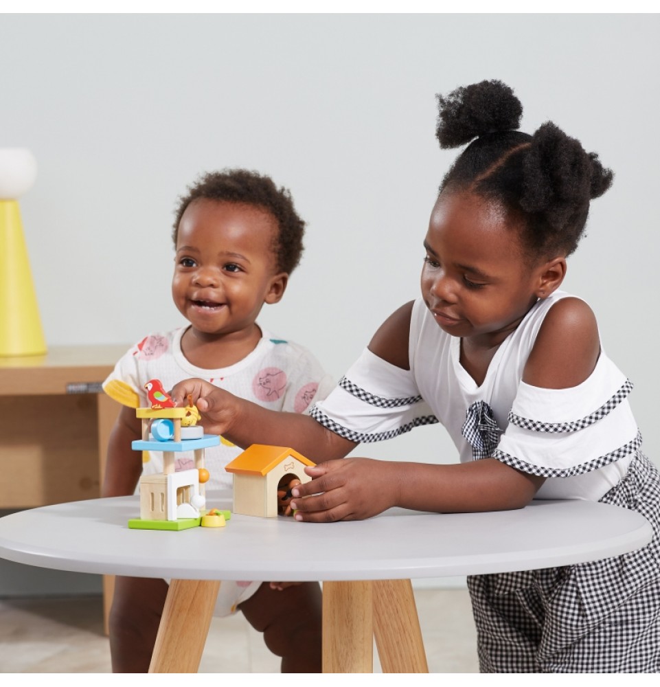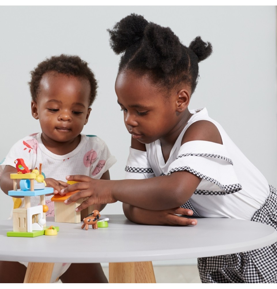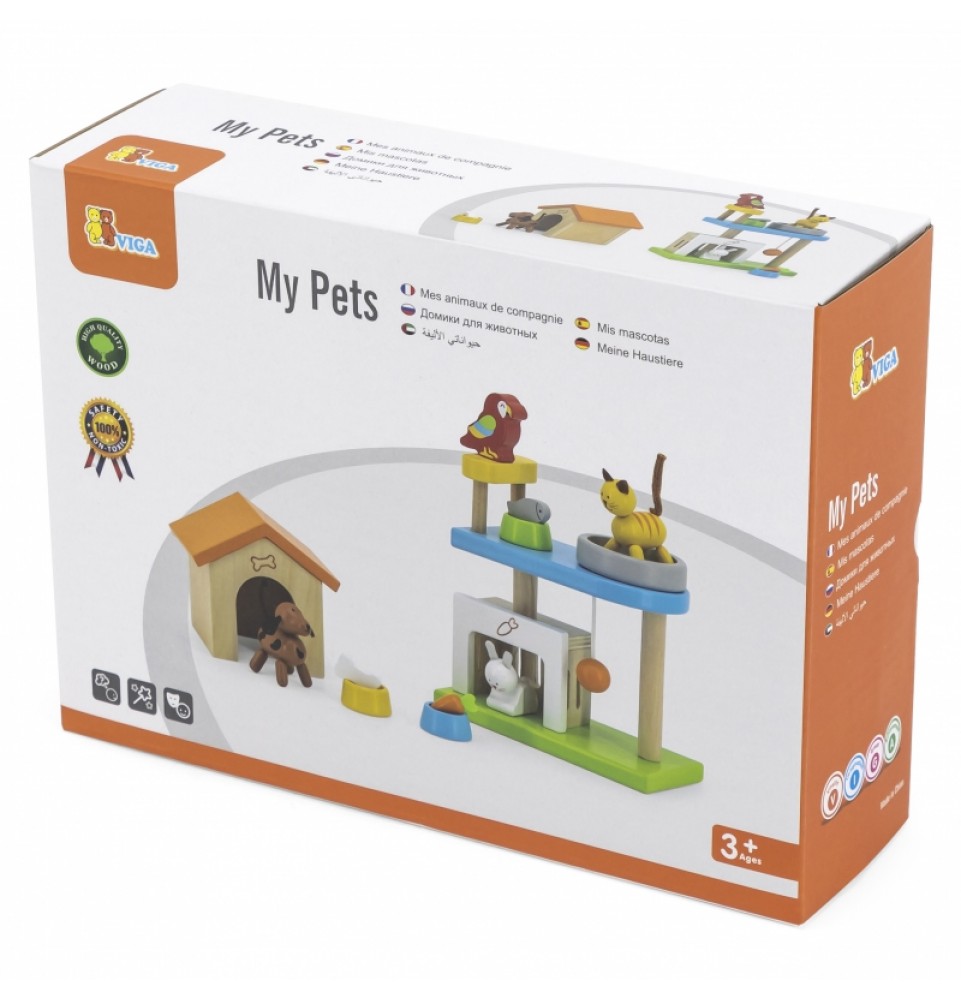 Šis medinių gyvūnų rinkinys puikiai papildys bet kurį lėlių namelį. Rinkinį sudaro įvairūs gyvūnai – žavingas šuniukas, kačiukas, zuikutis, papūga – kartu su jų nameliais ir mini žaidimų aikštele. Vaikai mėgsta kurti istorijas, o šis rinkinys yra puikus būdas sužadinti jų vaizduotę.