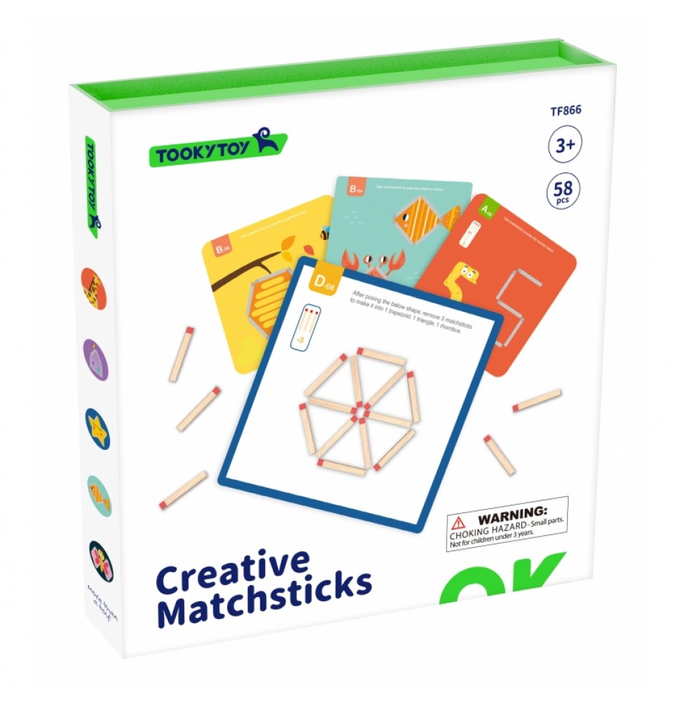 „ Tooky Toy “ „Creative Matches“ – tai fantastiškas lavinamasis žaidimas, garantuojantis valandų valandas įtraukiančio pramogų tiek vaikams, tiek suaugusiems. Dėl įvairių raštų ir dėjimo galimybių šis žaidimas lavina ne tik vaizduotę , bet ir loginį mąstymą . Žaidimas puikiai tinka žaisti vienam arba grupėje, todėl tai puikus būdas praleisti laiką kartu . Žaidimas apima porų dėliojimą ant pridėtų lentų pagal raštus arba savarankiškai, naudojant savo idėjas. Žaidimas siūlo įvairius sudėtingumo lygius – nuo lengvų užduočių jauniausiems žaidėjams iki sudėtingesnių galvosūkių, reikalaujančių didelio susikaupimo ir loginio mąstymo. Sudėtingumo lygiai pažymėti skirtingomis spalvomis ant kortelių. Žaidime yra kortelės su 50 skirtingų raštų ir knygelė su instrukcijomis ir įvairiais žaidimo būdais.