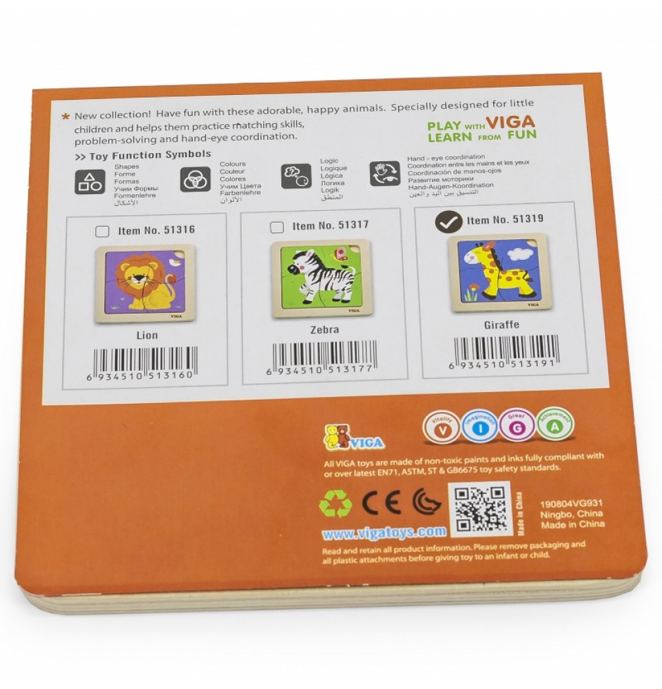 „ Viga “ medinė dėlionė vaikams nuo 12 mėnesių amžiaus yra idealus sprendimas tiek namams, tiek ikimokyklinio amžiaus vaikams. Ją sudaro lenta ir keturios teminės detalės, kurias reikia prie jos pritvirtinti. Ant medinio pagrindo yra iš anksto nupieštas paveikslėlis, todėl vaikams lengviau suderinti detales. Visa dėlionė pagaminta iš medžio ir nudažyta vaikams saugiais ryškių spalvų dažais , kurie pradžiugins kiekvieną vartotoją ir suteiks daug džiaugsmo.