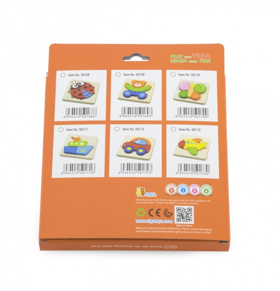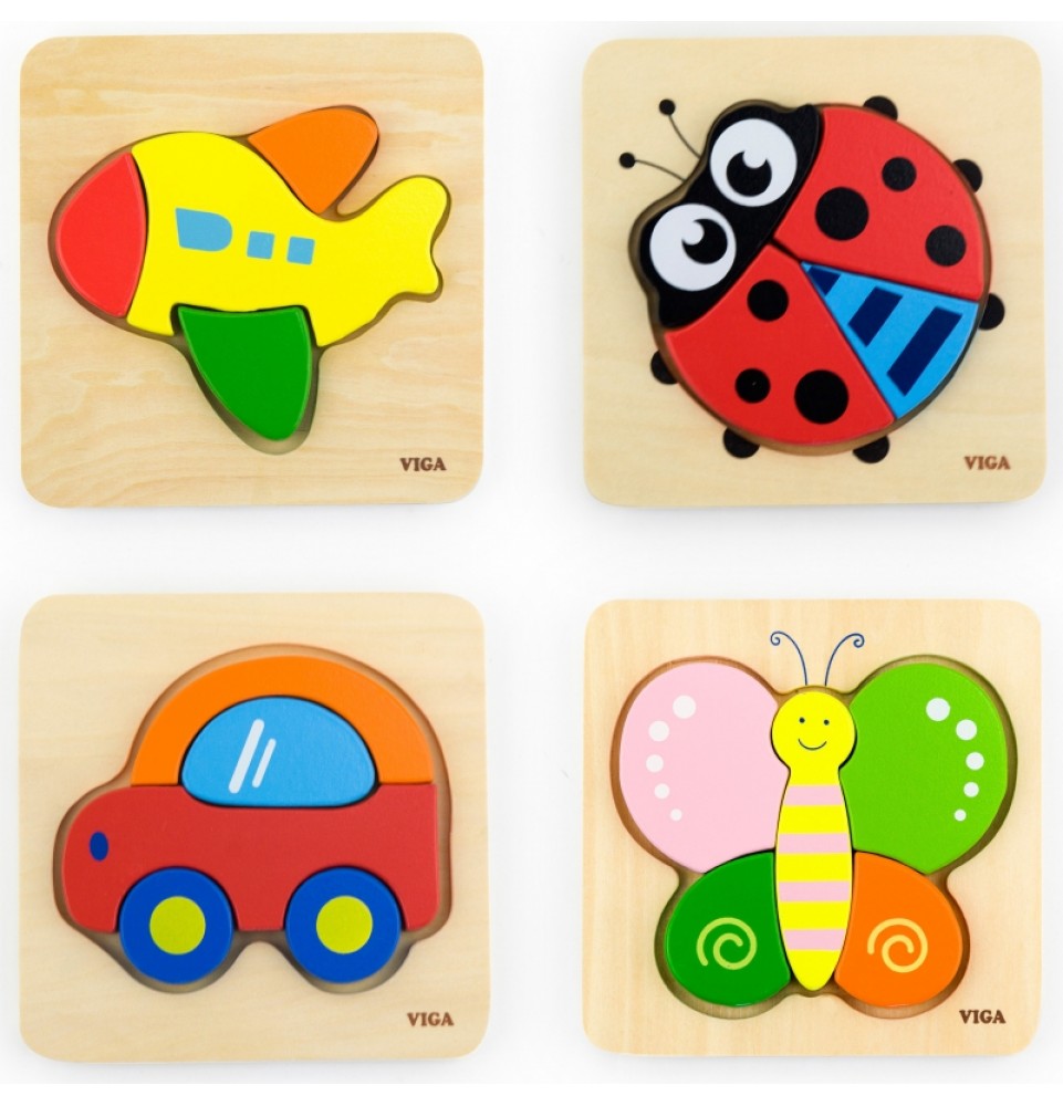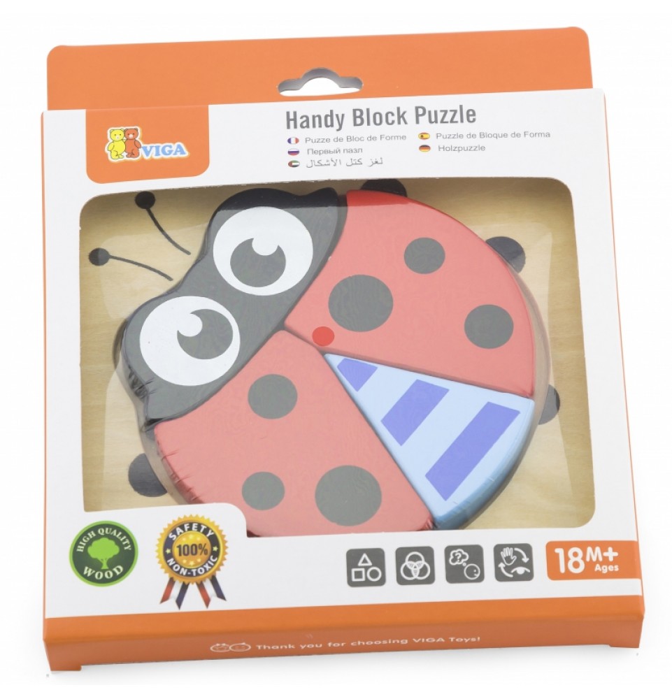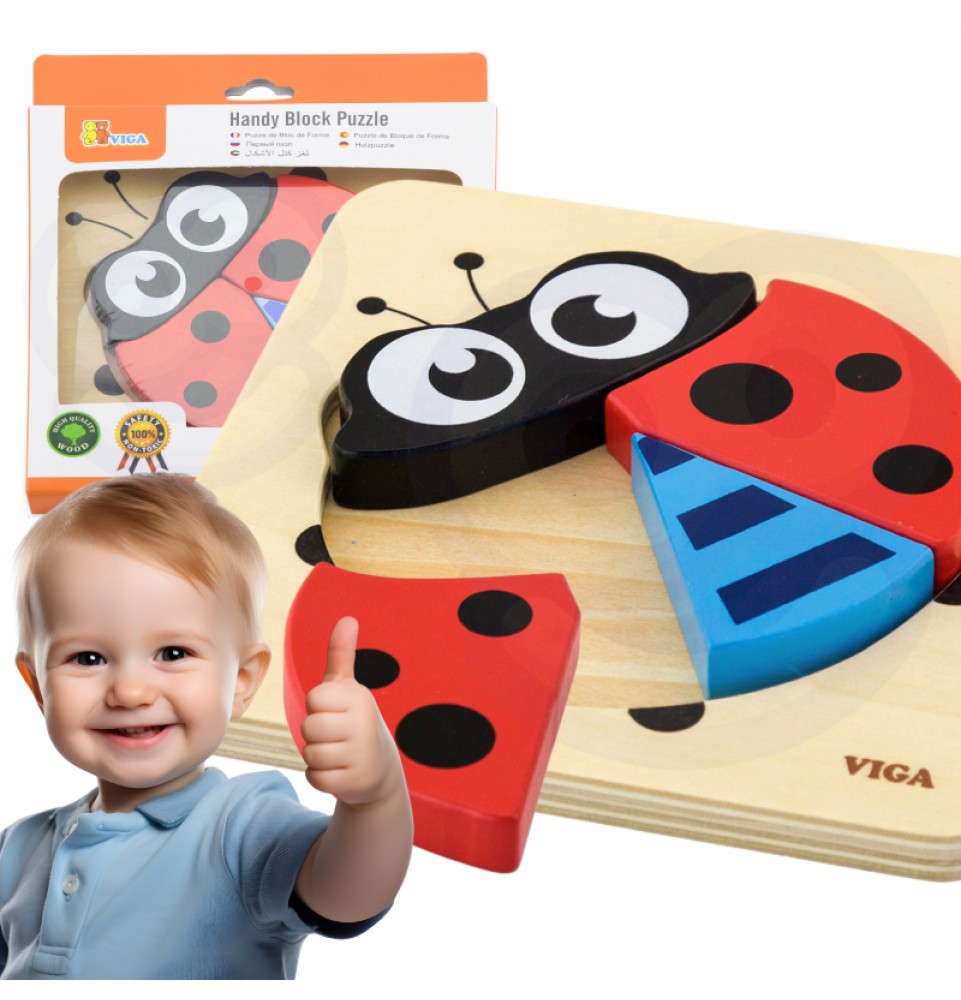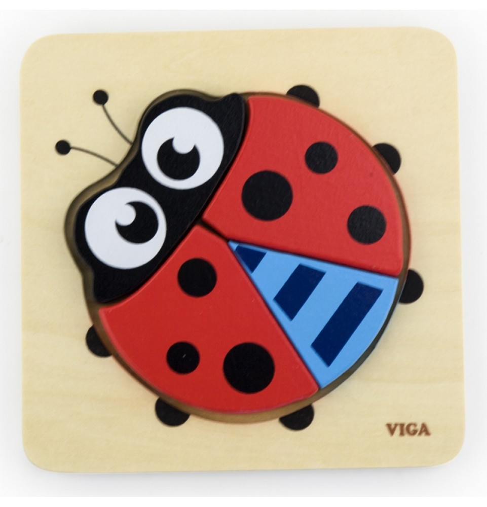 Mediniai mini galvosūkiai vaikams iš garsaus „Viga“ prekės ženklo Tai puikus sprendimas tiek namams, tiek ikimokyklinio amžiaus vaikams. Dėlionę sudaro keturios dalys , kurios kartu sudaro boružėlę . Medinis pagrindas yra įdubęs, atitinkantis spalvingas dėlionės dalis.