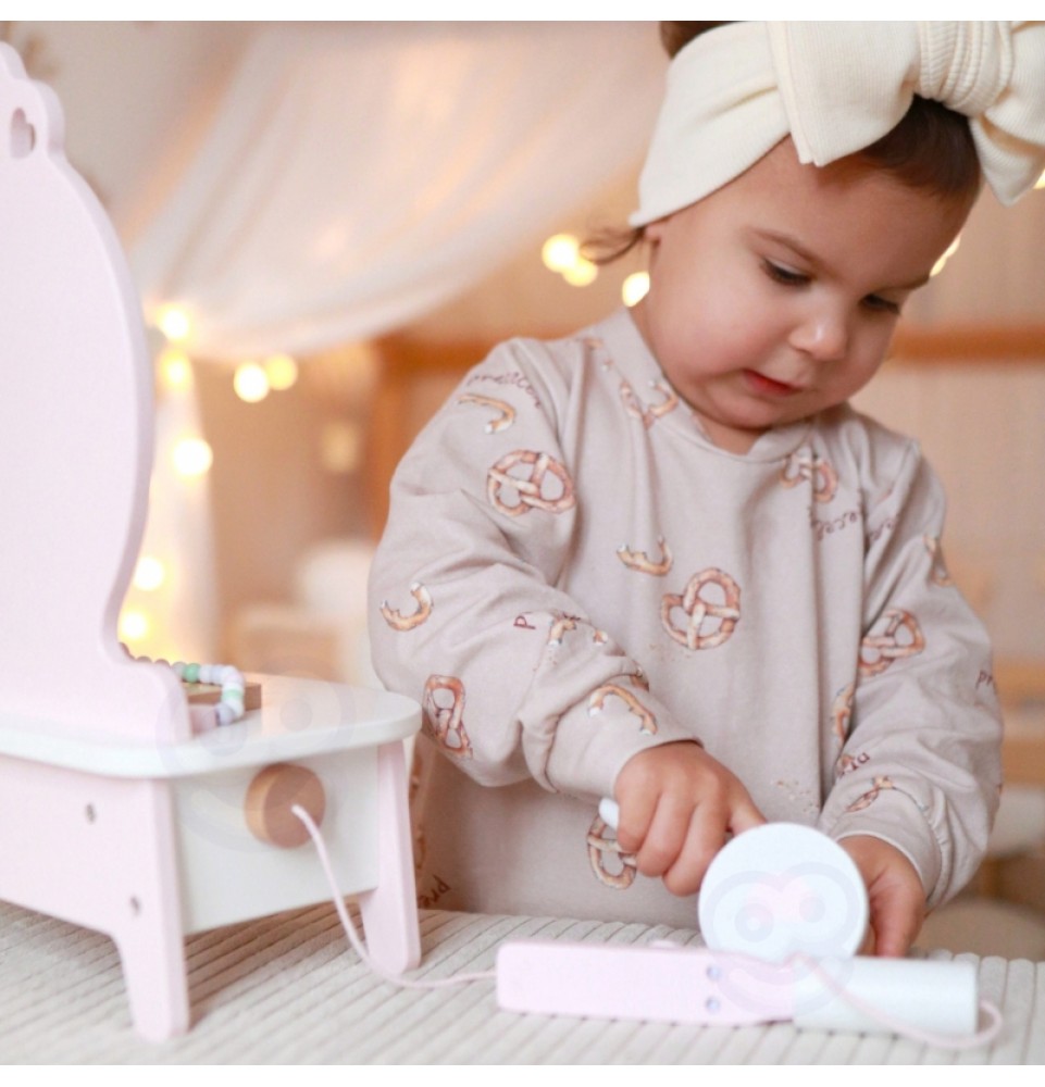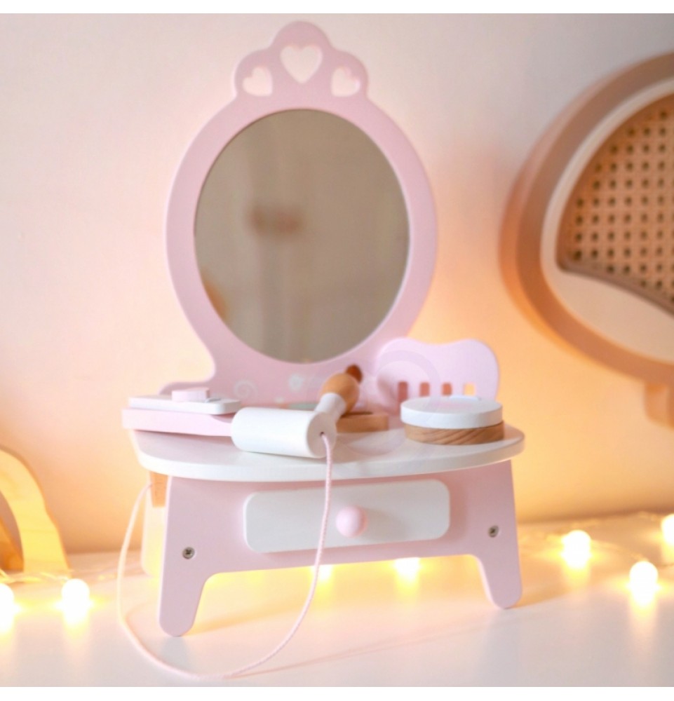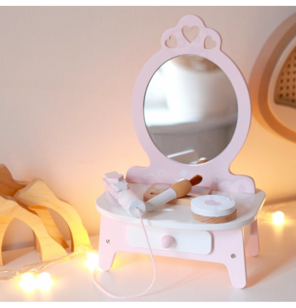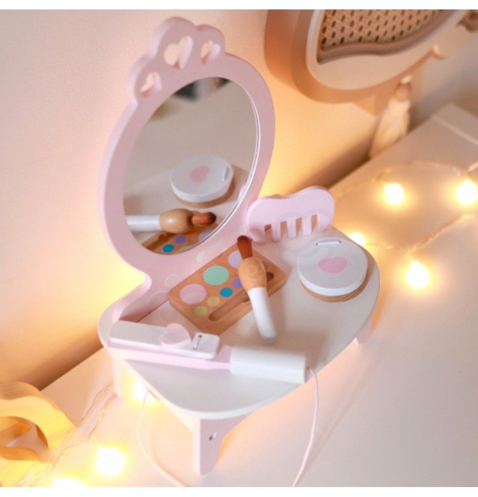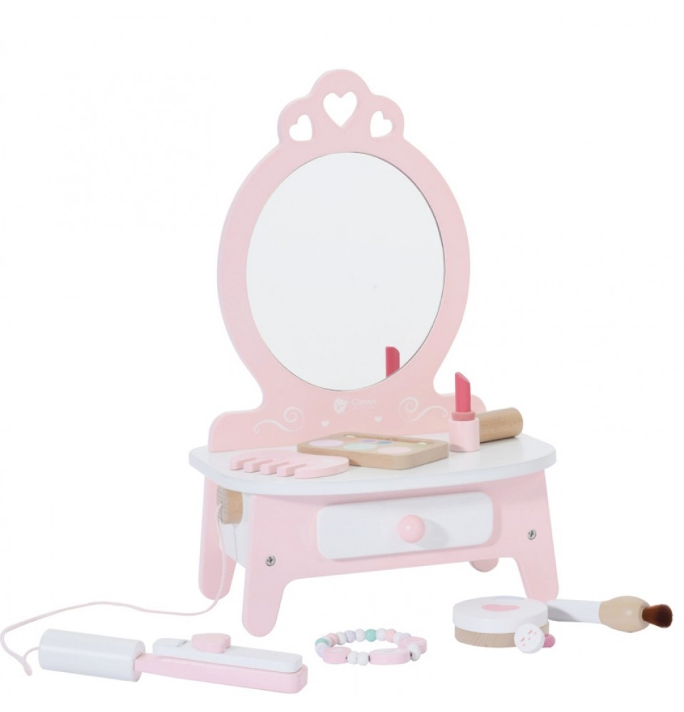 CLASSIC WORLD medinis tualetinis staliukas mergaitėms su veidrodžiu + plaukų tiesintuvas 11 priedų
