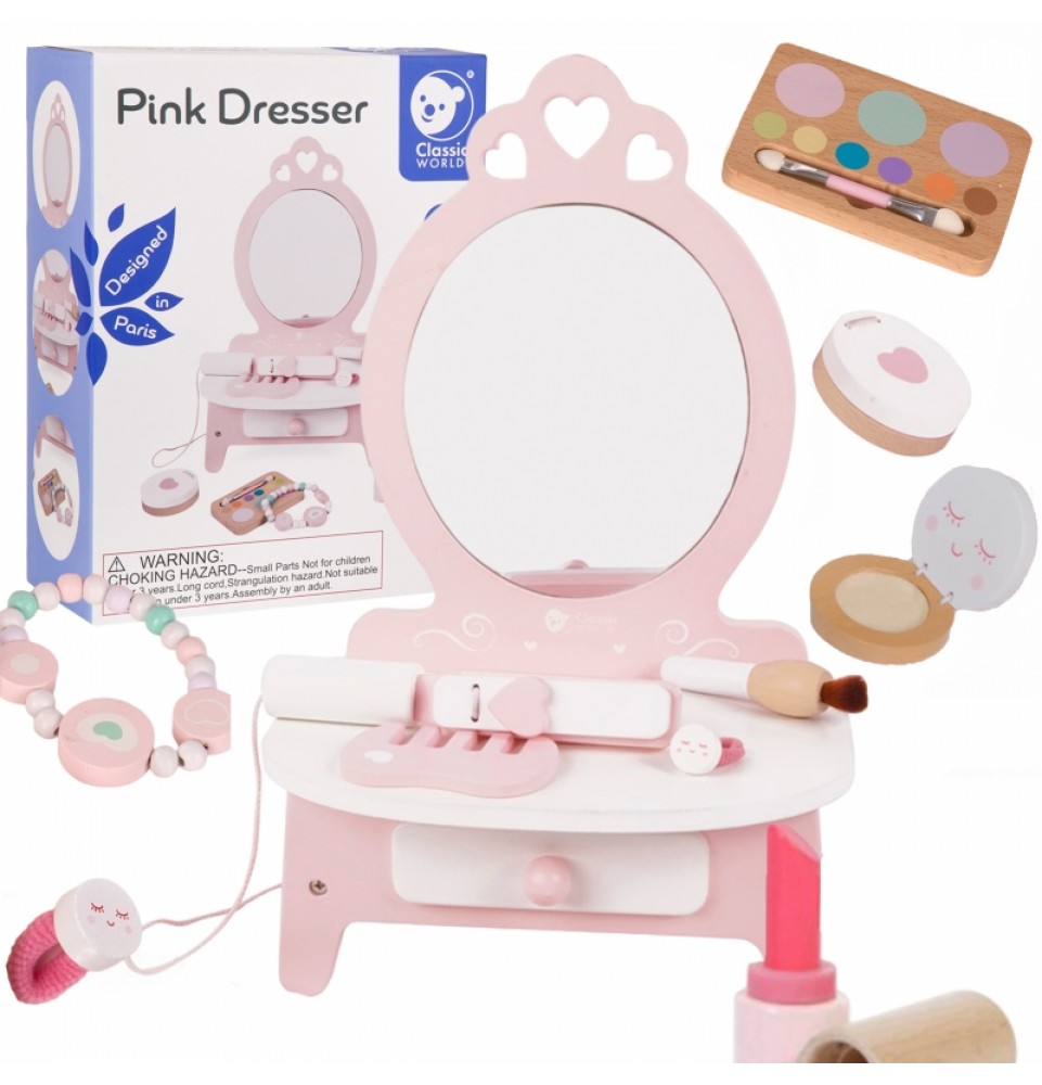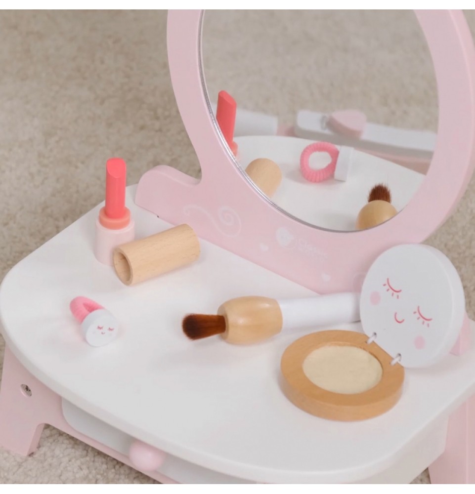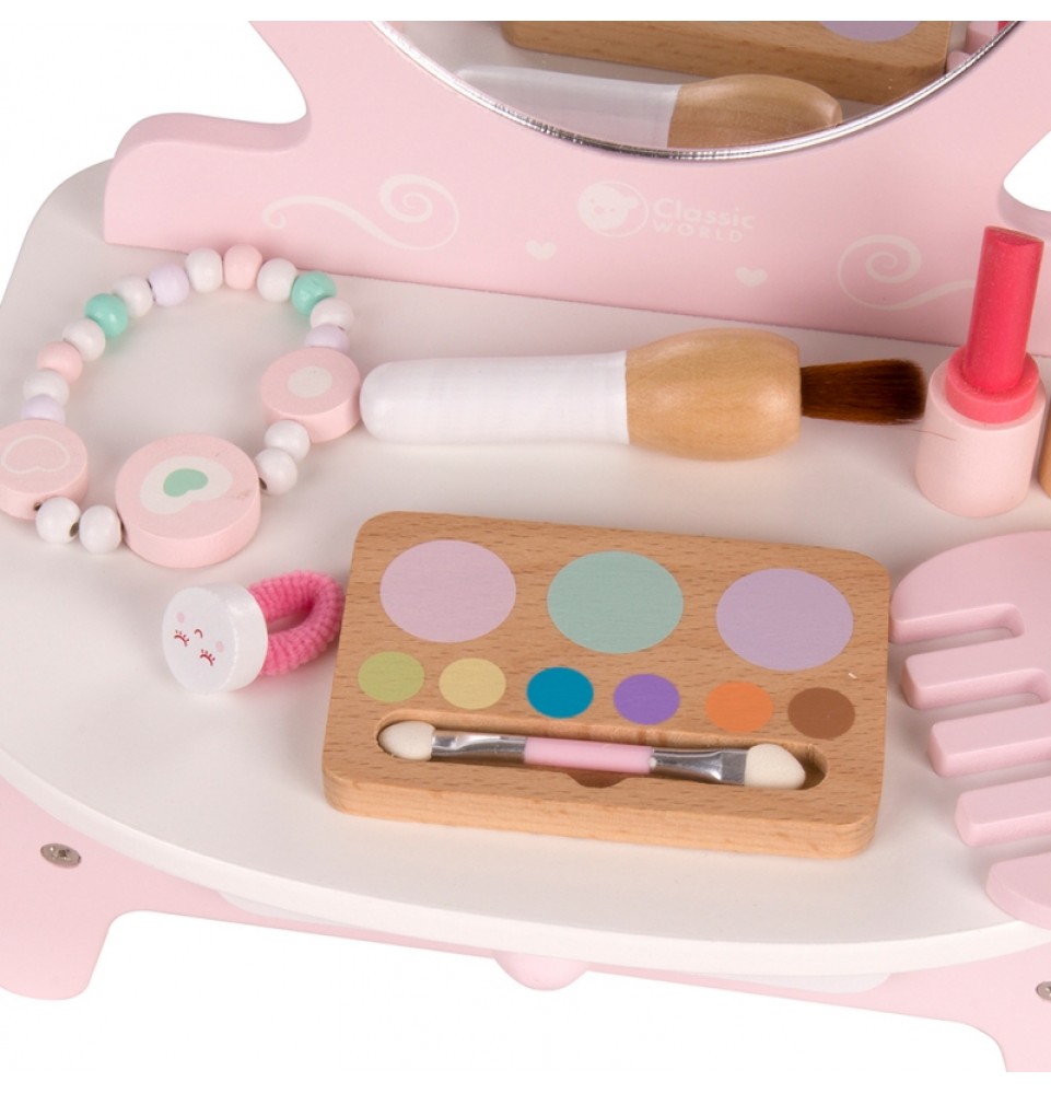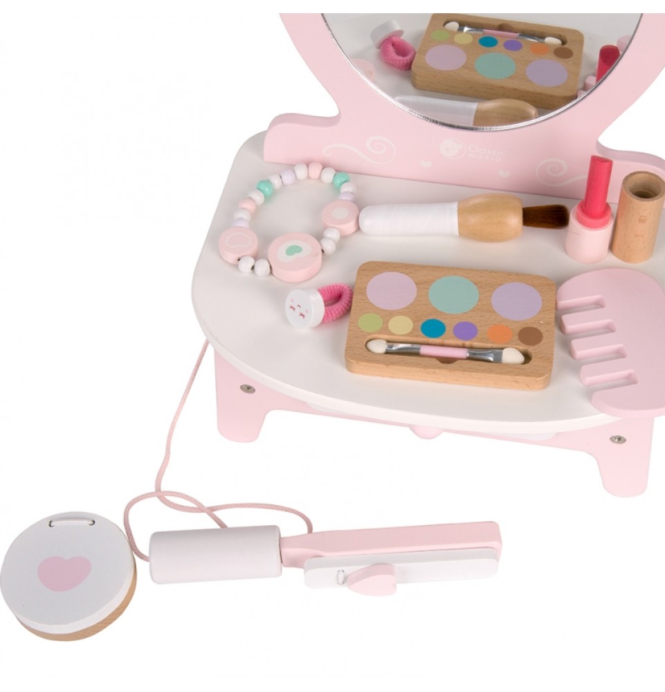 Šis gražus ir funkcionalus „Classic World“ tualetinis staliukas yra puiki dovana vaikams nuo 3 metų amžiaus . Šis platus makiažo ir šukuosenos rinkinys pradžiugins kiekvieną šeimininką. Rinkinyje yra veidrodėlis , kuriame jūsų mažylis galės pasidaryti makiažą. Didelis priedų pasirinkimas , pavyzdžiui, šukos , lūpų dažai , tiesintuvas , makiažo šepetėlis ir pudros kompaktinė plokštelė , leis smagiai praleisti laiką ir atsipalaiduoti ruošiantis kartu su tėvais. Praustuvo stalviršis yra labai funkcionalus ir jame telpa visi būtini mūsų modelio aksesuarai. Šis žaislas gali būti naudojamas kaip grožio salono aksesuaras mažų mergaičių kambariuose.