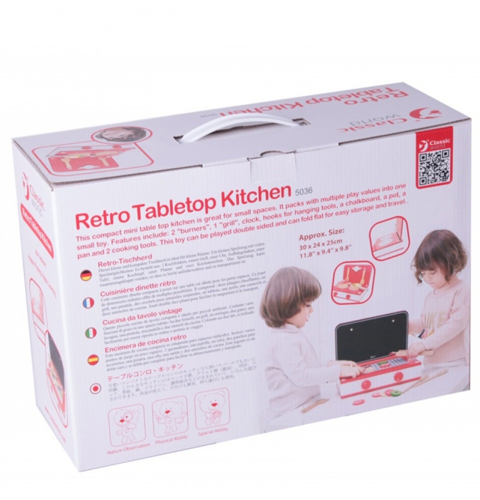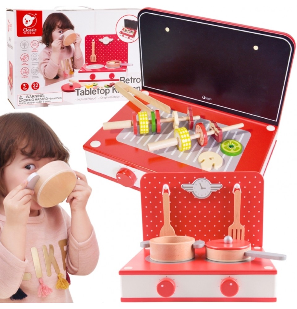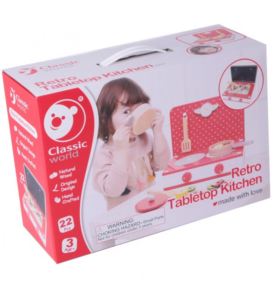 Ar namuose turite pradedantįjį virėją ? O galbūt jūsų mažylis tiesiog nori pamėgdžioti mamą ir tėtį? Bet kuriuo atveju, „Classic World“ stalo virtuvėje yra viskas, ko reikia valgiui paruošti. Ryškiai raudona šios viryklės spalva patiks visiems vaikams, nes rinkinyje yra puodai ir keptuvės , taip pat „paruoštas“ maistas . Jūsų mažylis greitai paruoš valgį. Be puodų , keptuvių , stalo įrankių ir maisto , yra ir iešmelių rinkinys maistui suverti, o visi maisto gabalėliai yra su skylutėmis.