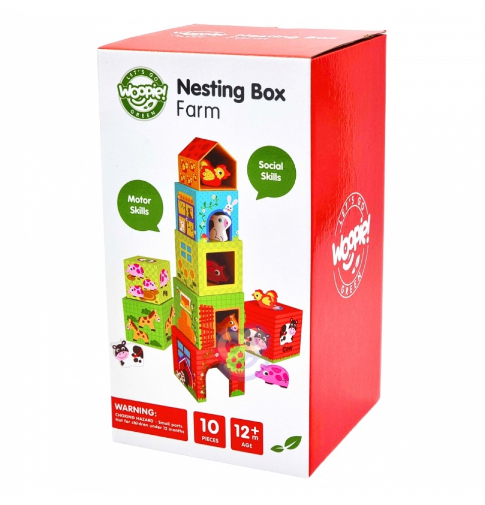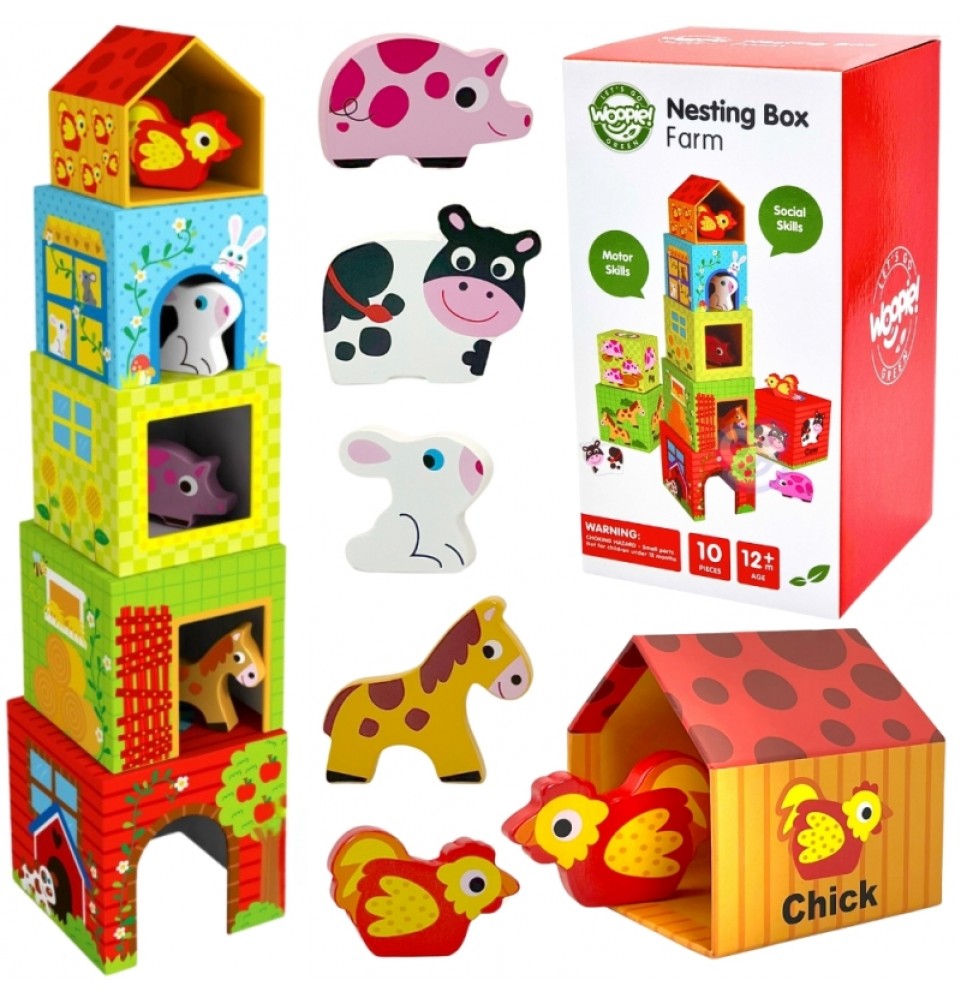 „WOOPIE“ prekės ženklo ūkio dėlionė, priklausanti GREEN serijai, yra kūrybinga alternatyva klasikinėms dėlionėms ir kaladėlėms. Spalvingi, iliustruoti kubeliai leidžia vaikams derinti mokymąsi su žaidimu, o medinės gyvūnų figūrėlės supažindina su vaidmenų žaidimais ir ūkio gyvenimu. Kiekvienas kubelis vaizduoja skirtingus namus – nuo didelės karvės iki mažos vištos – sunumeruotus pagal gyvūnų dydį ir skaičių. Paveikslėliai vaizduoja angliškus pavadinimus , padedančius mokytis kalbų nuo ankstyvo amžiaus.