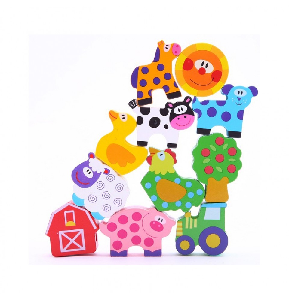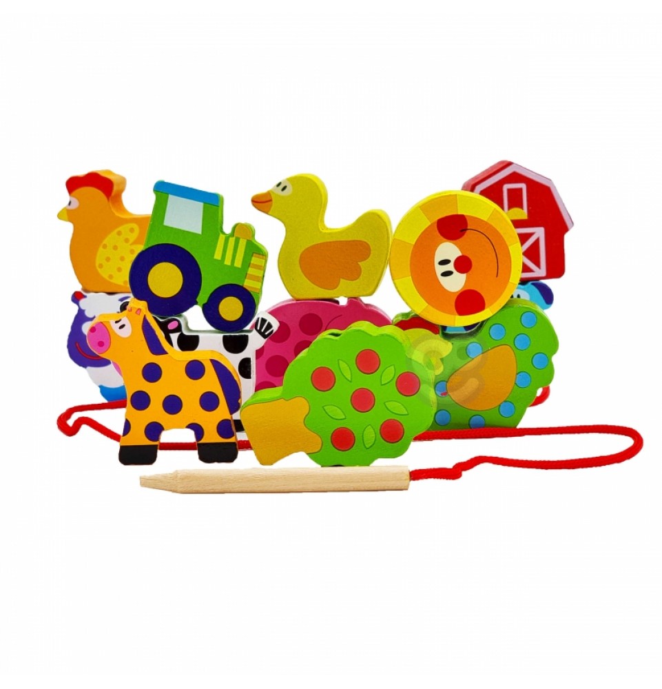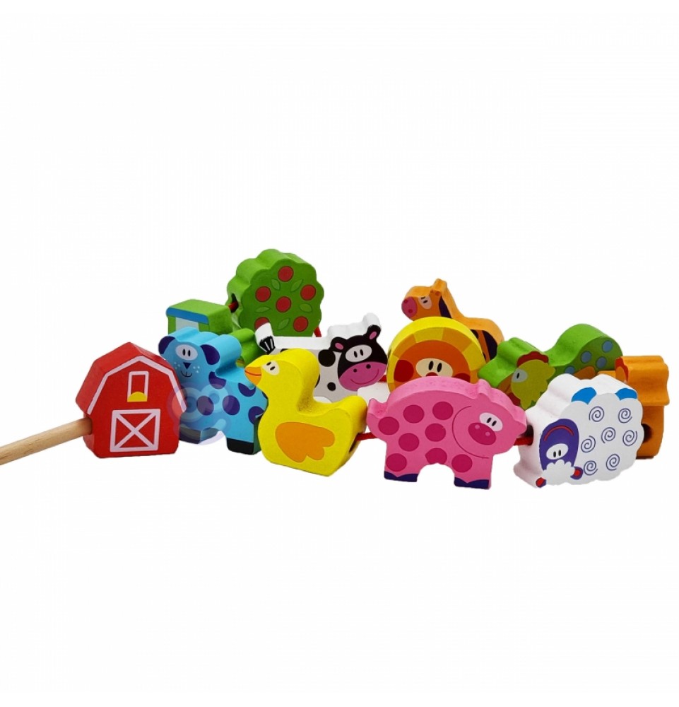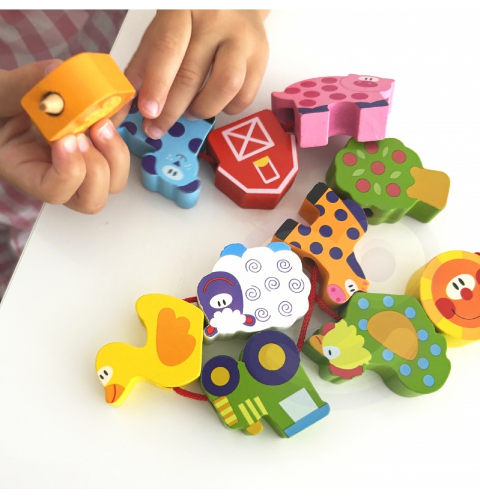 WOOPIE GREEN Mediniai siūlų vėrimo kaladėlės Gyvūnų ūkis 13 vnt.