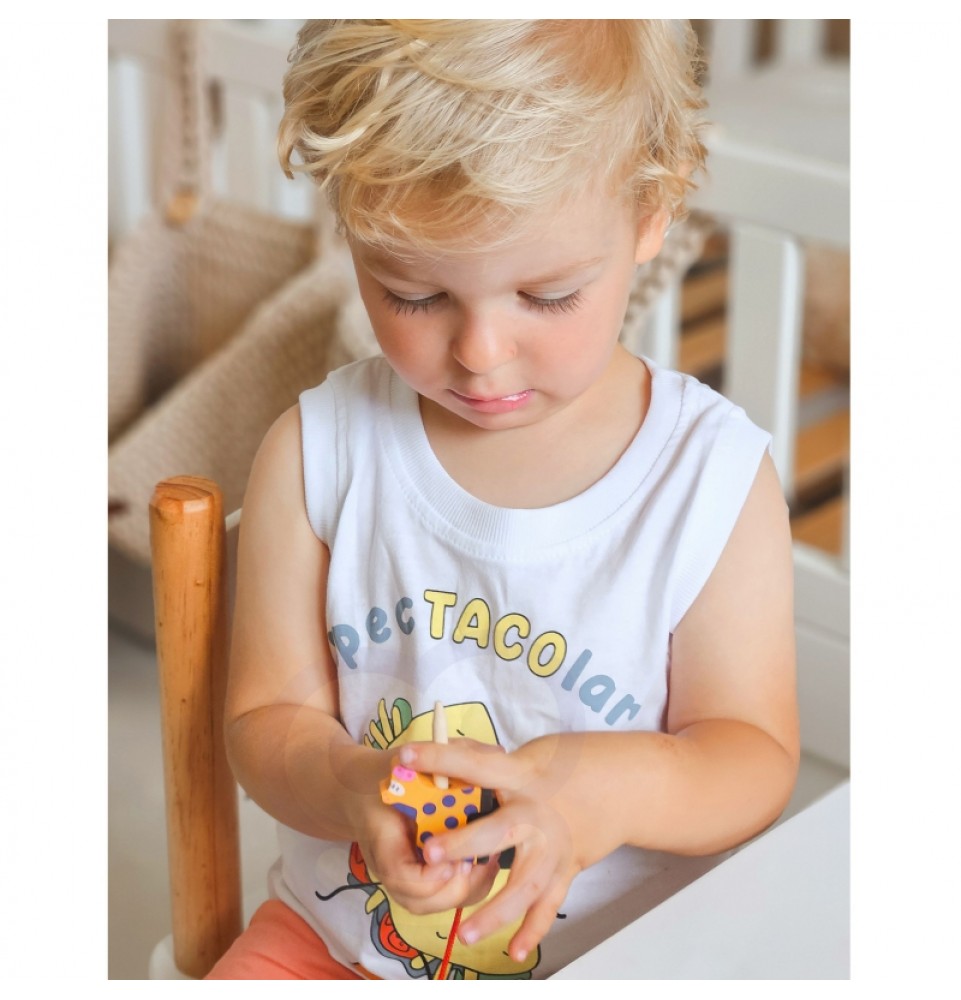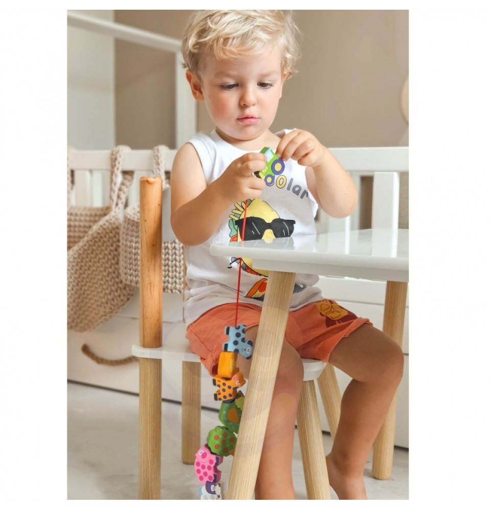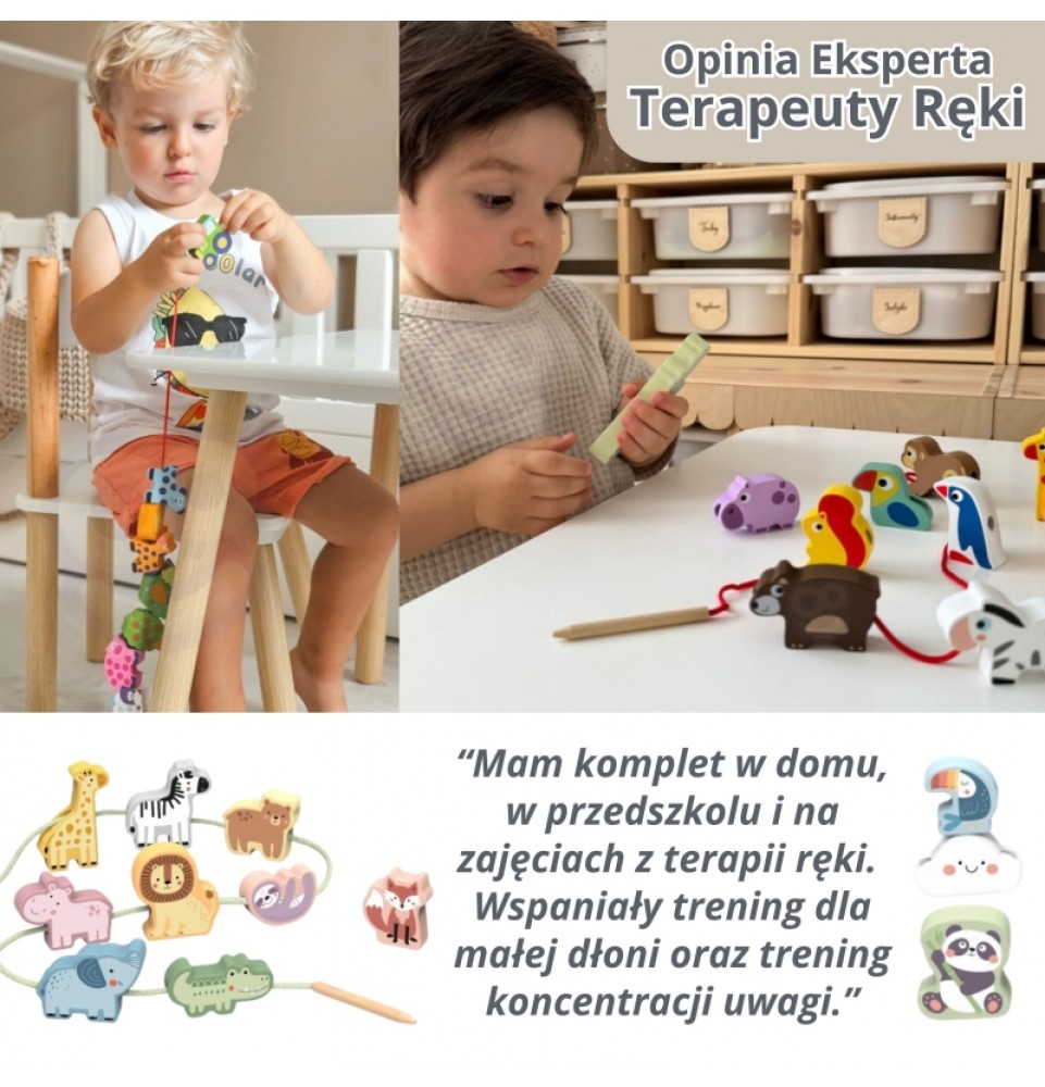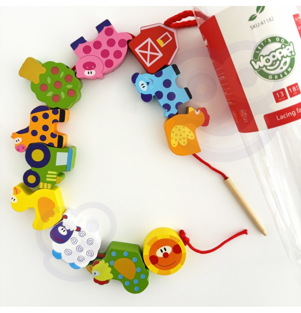 WOOPIE ŽALIEJI karoliukai vėrimui siūlo modernų, lavinamąjį klasikinio pynimo žaidimo variantą. Ūkio tematika su žavingais gyvūnais ir kaimo gyvenimo elementais skatina vaizduotę ir kūrybišką žaidimą. Vaikai veria medinius karoliukus ant siūlo, lavindami miklumą, susikaupimą ir kantrybę. Natūrali mediena ir ekologiška konstrukcija daro šį žaislą saugų ir draugišką aplinkai .