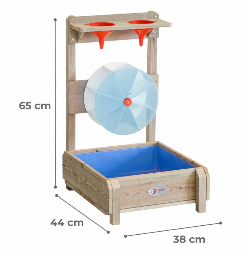 Garsaus „Classic World“ prekės ženklo vandens žaislas vaikams – puikus jūsų smėlio dėžės papildymas! Pagamintas iš aukštos kokybės medienos , padengtas netoksiška, vaikams saugia apdaila . Tiesiog pripildykite piltuvėlį vandens ir stebėkite, kaip jis teka į besisukantį ratą. Produktas lavina vaikų vaizduotę, suvokimą ir loginį mąstymą.