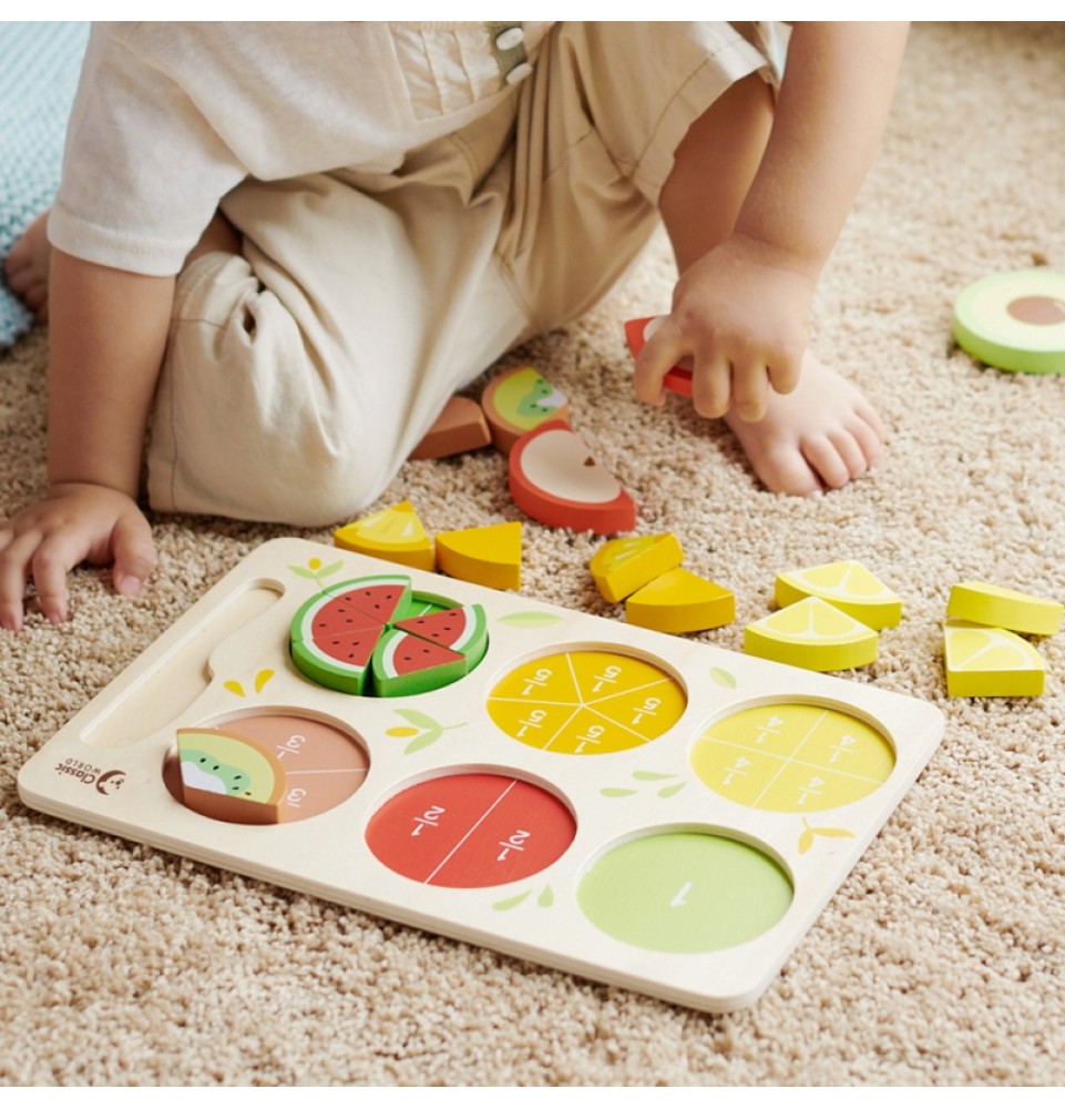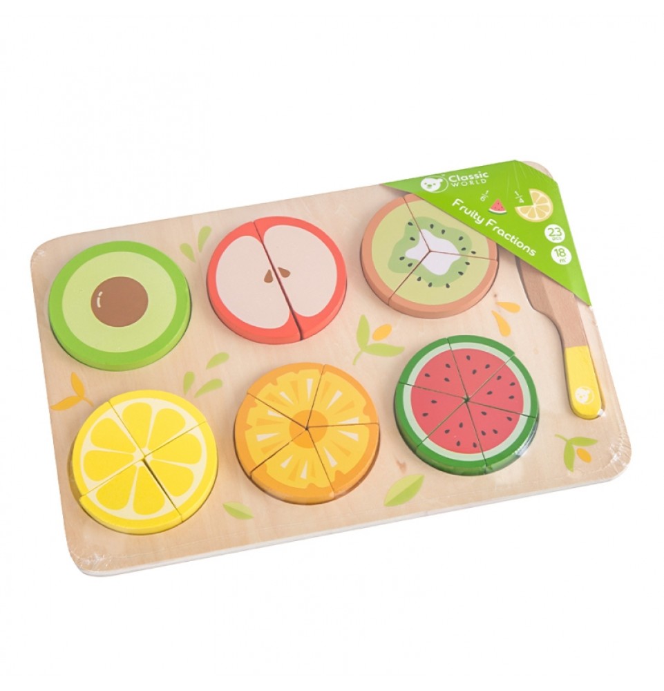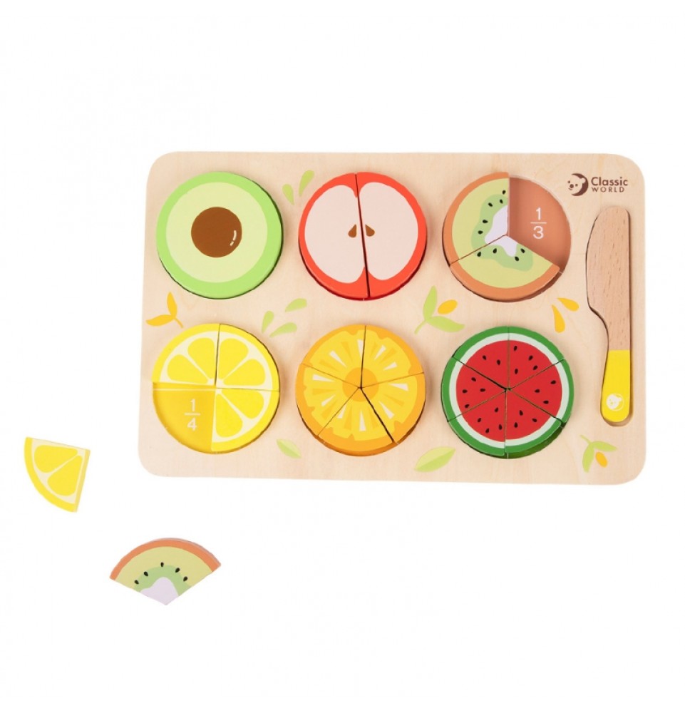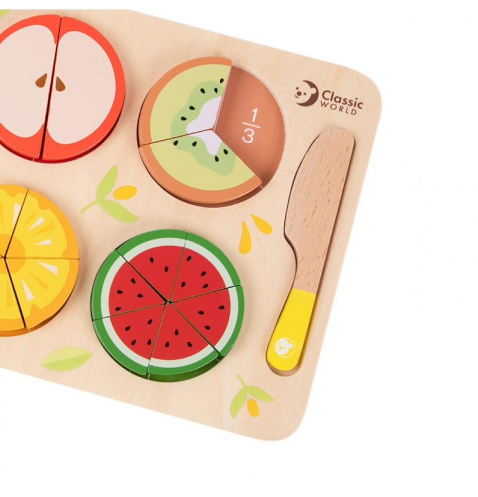 CLASSIC WORLD Mediniai vaisiai pjaustymui su lipdukais + trupmenų ir dalybos mokymasis MONTESSORI 23 vnt.
