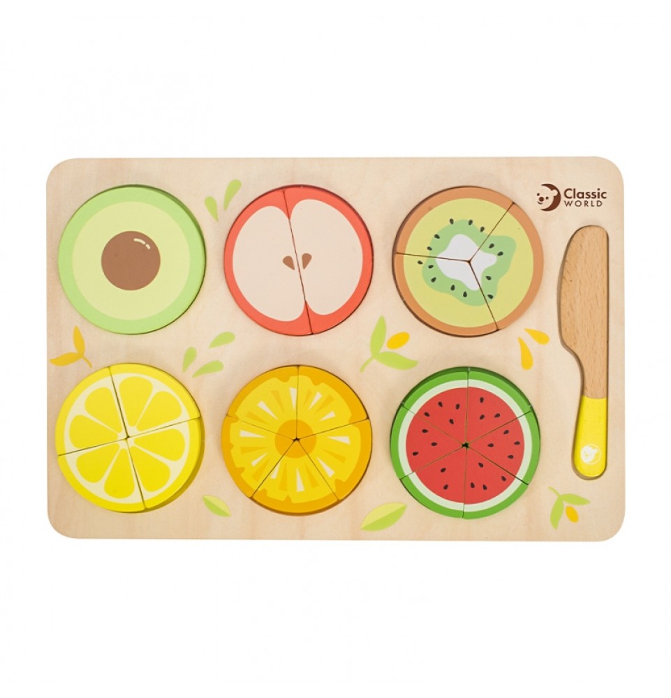CLASSIC WORLD vaisių pjaustymo rinkinys yra puikus žaidimo papildymas mažiesiems virėjams, kurie mėgsta žaisti namus ar gaminti. Rinkinį sudaro 23 detalės. Šis žaidimas leidžia žaisti vaidmenimis nuo mažens ir atlieka edukacinę funkciją, įskaitant trupmenų ir dalybos mokymąsi . Šis produktas yra fantastiškas būdas smagiai praleisti laiką! Gražios spalvos ir imituoti vaisiai skatins nesibaigiantį žaidimą. Jūsų mažylis išmoks spalvas ir atskirti skirtingus vaisius . Rinkinys sukurtas galvojant apie mažas rankeles. Dėl aštrių briaunų nebuvimo jis yra 100 % saugus vaikams.