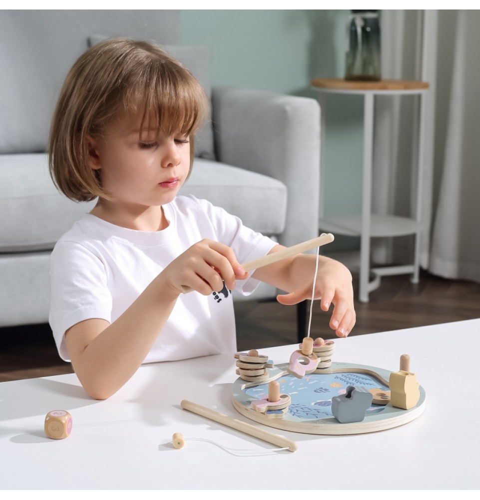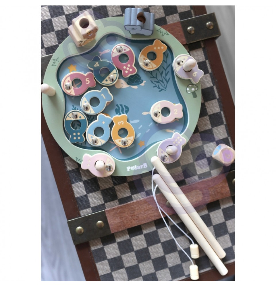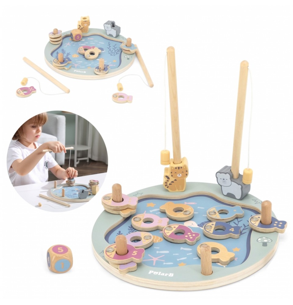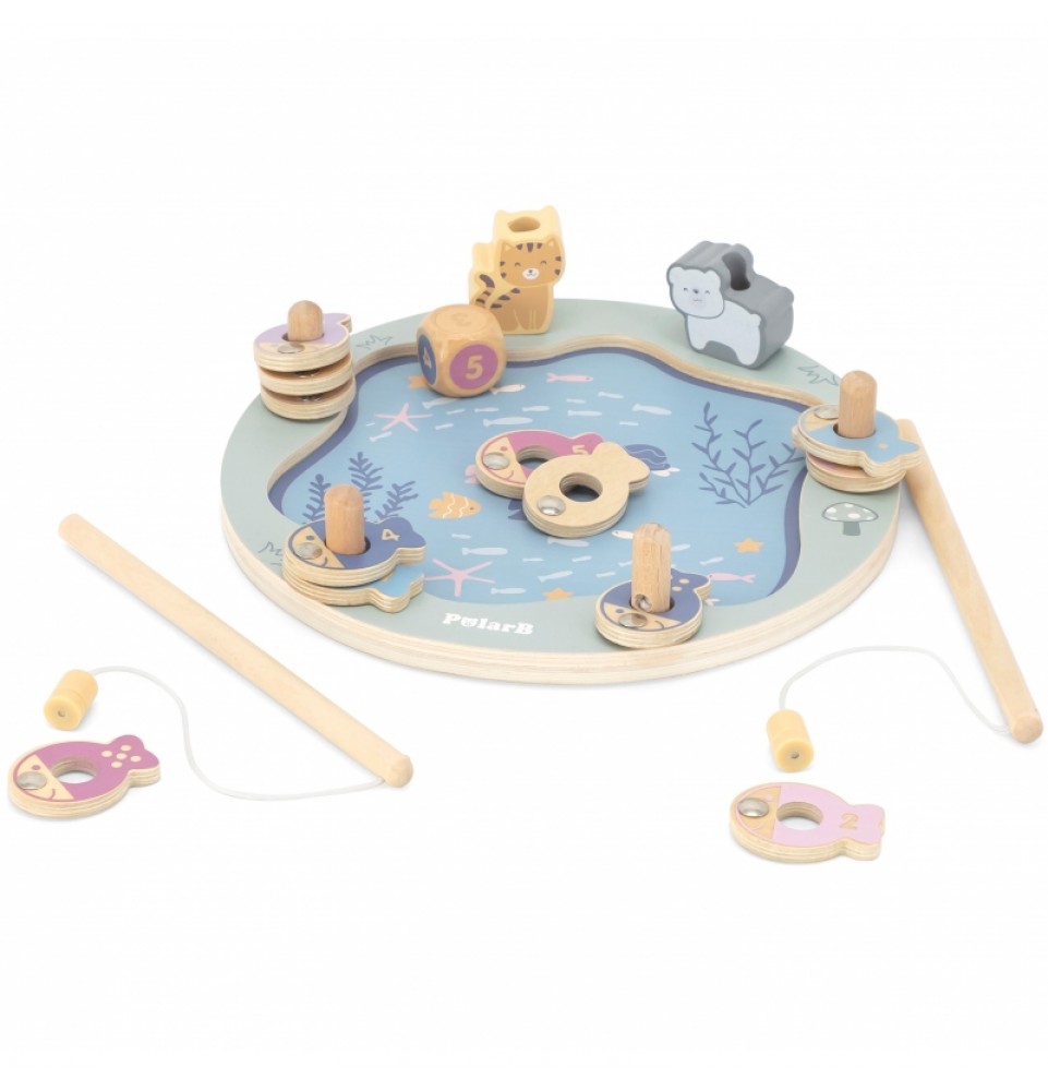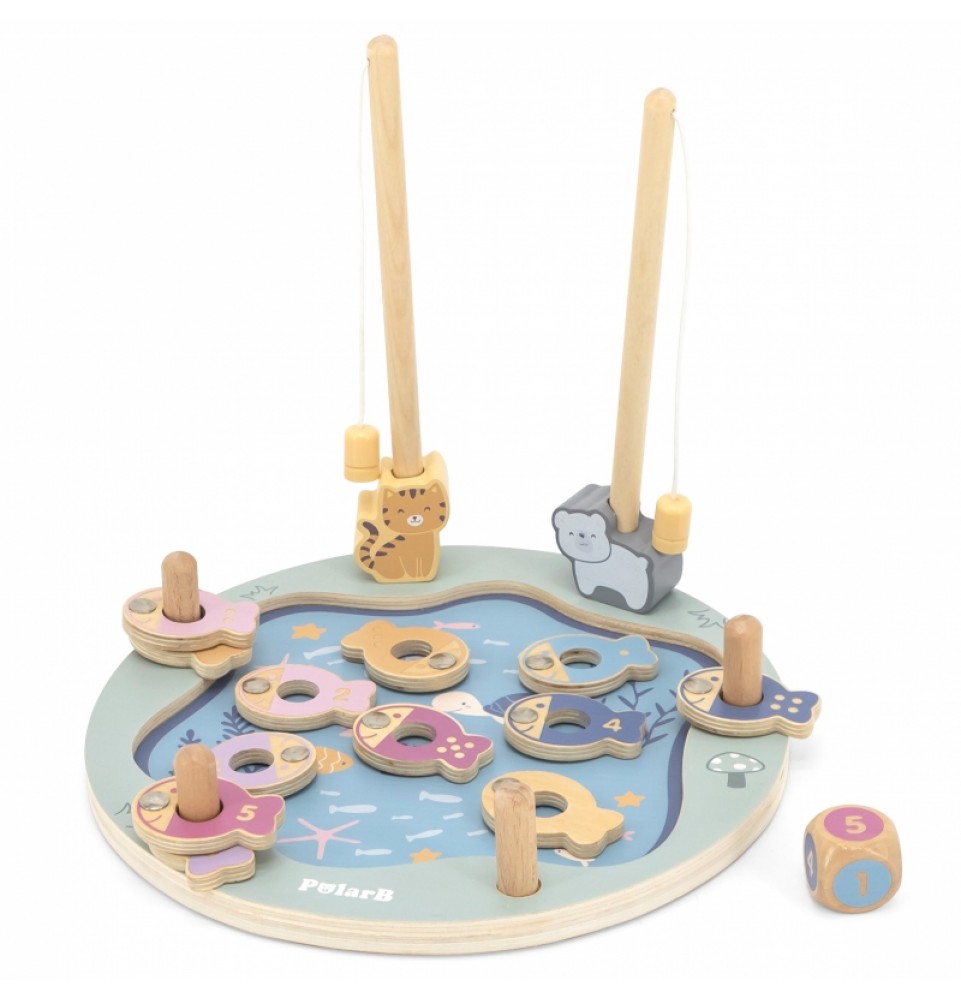 • - žaislą sudaro: medinis žaidimo stovas, 2 meškerės, kauliukas ir 12 žuvų,