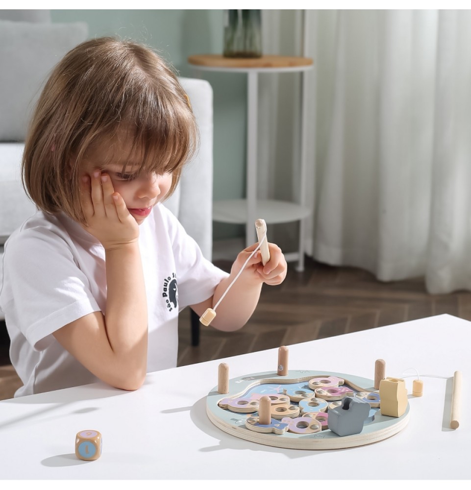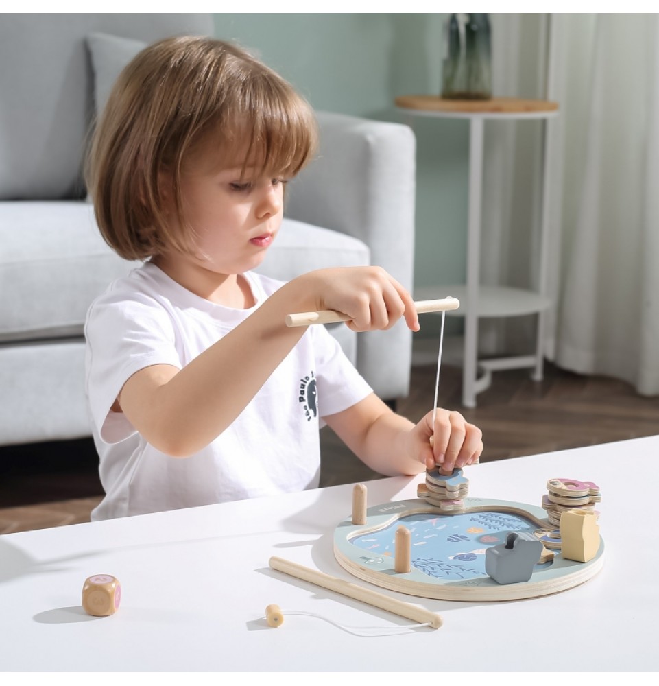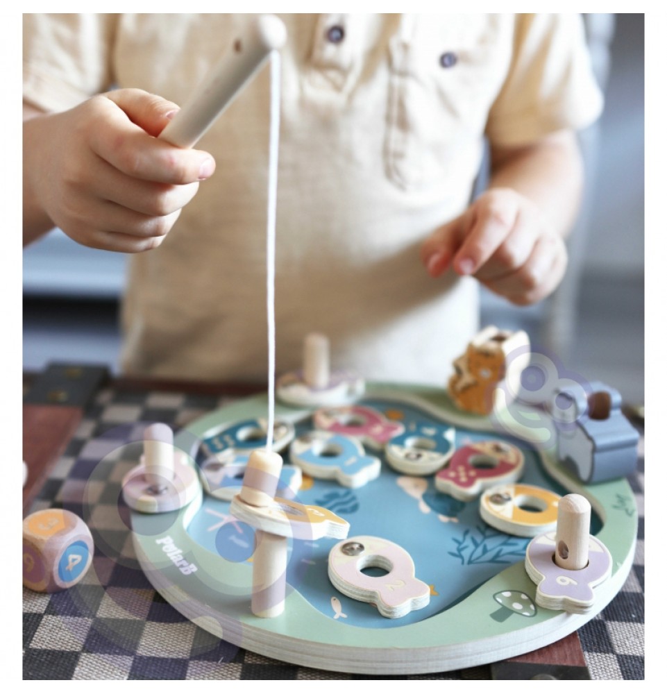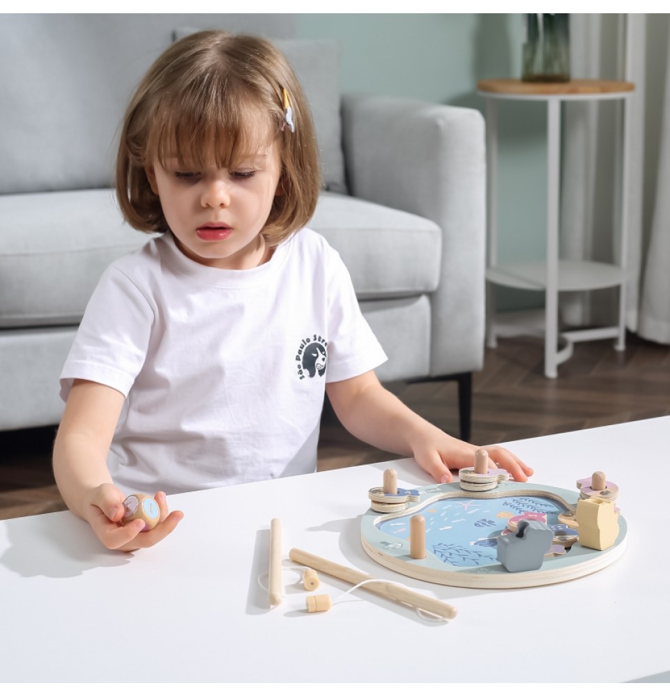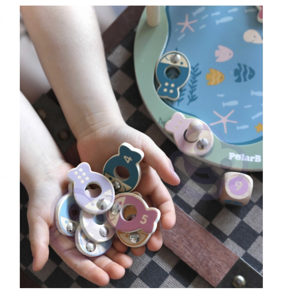• - žaislą sudaro: medinis žaidimo stovas, 2 meškerės, kauliukas ir 12 žuvų,