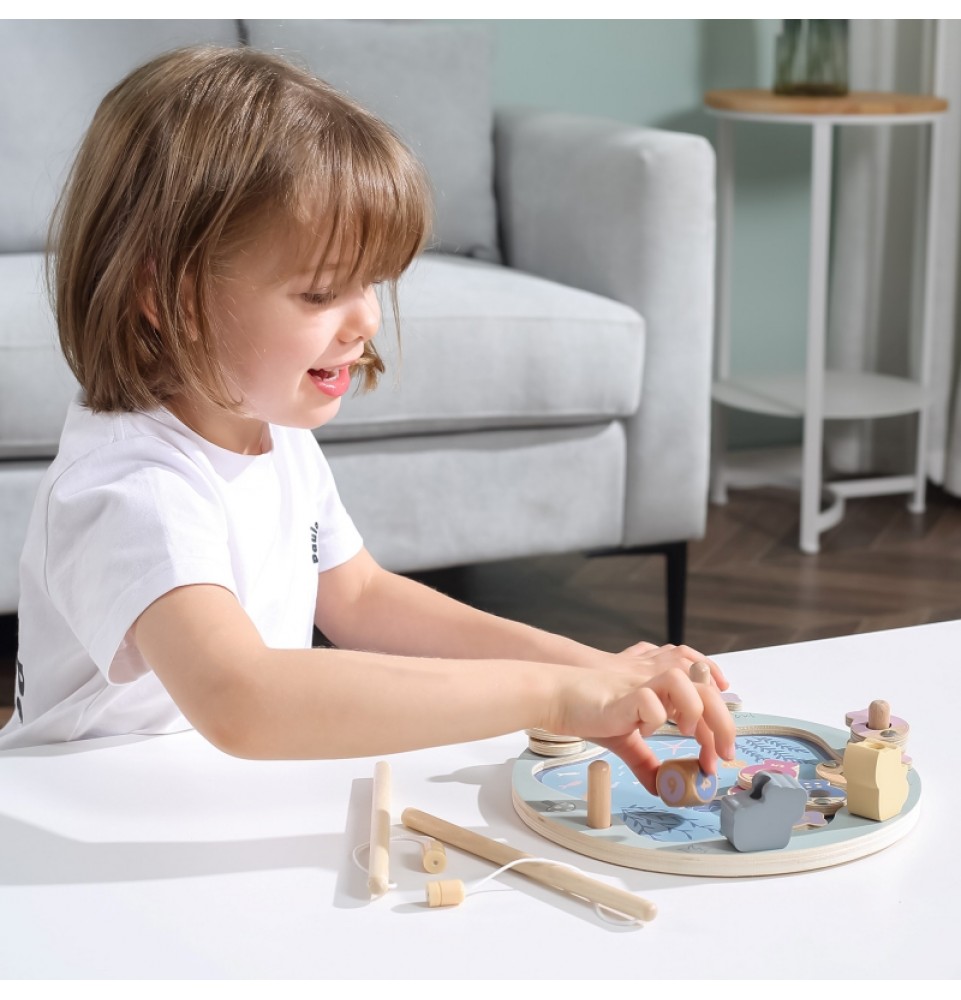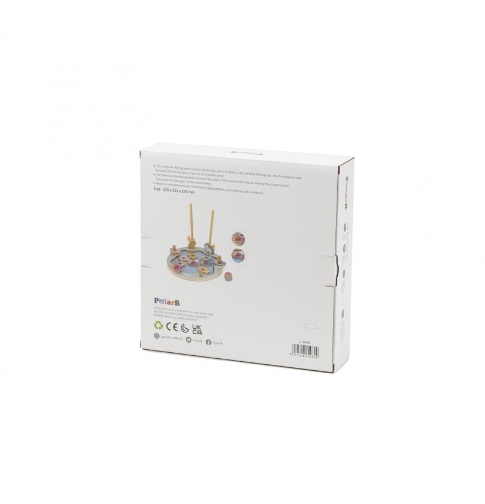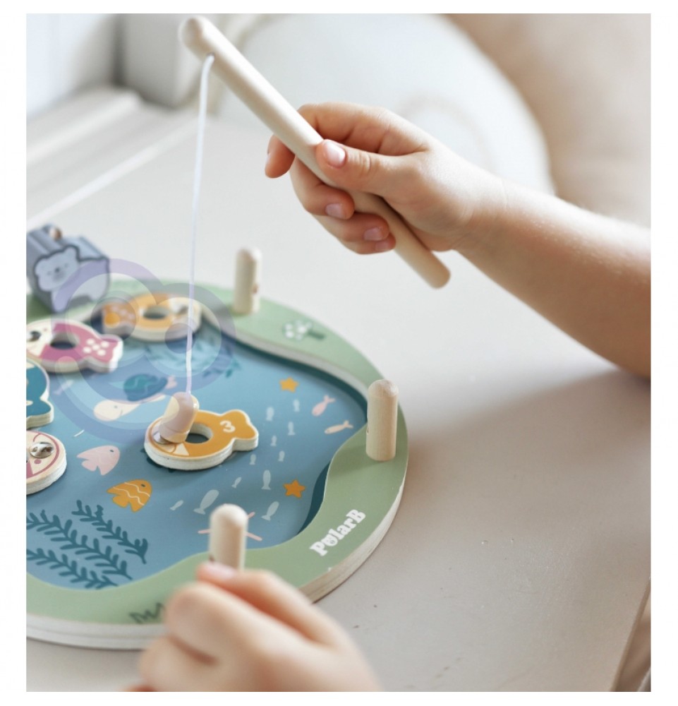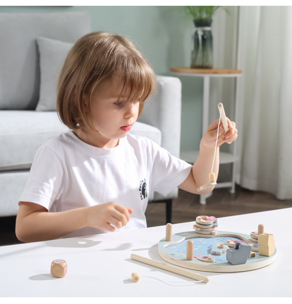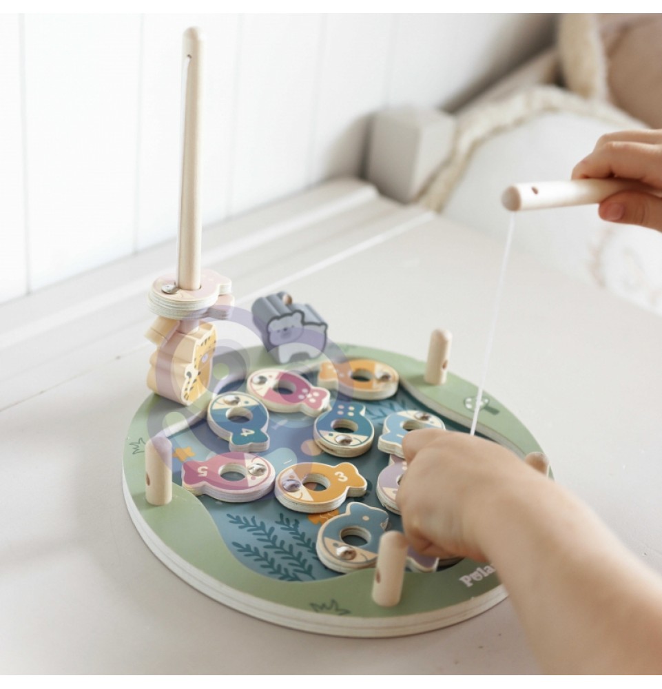 • - žaislą sudaro: medinis žaidimo stovas, 2 meškerės, kauliukas ir 12 žuvų,