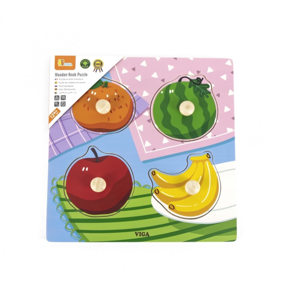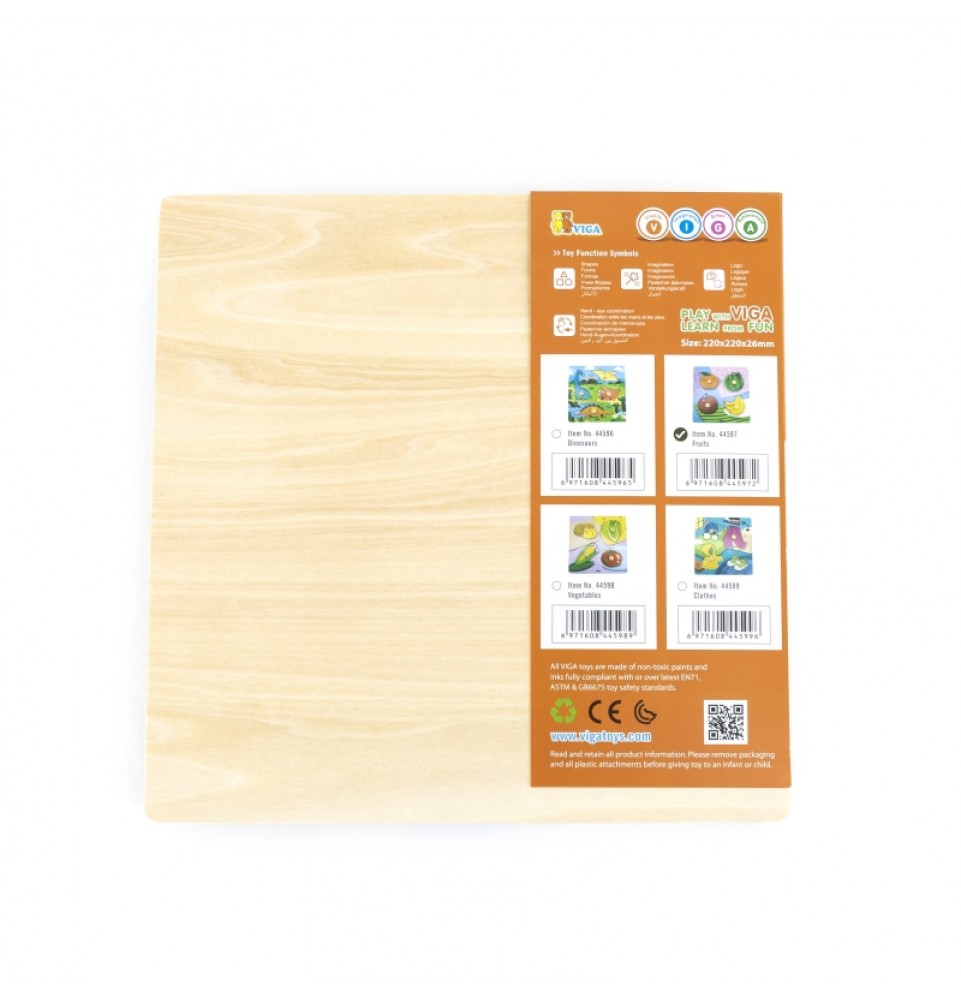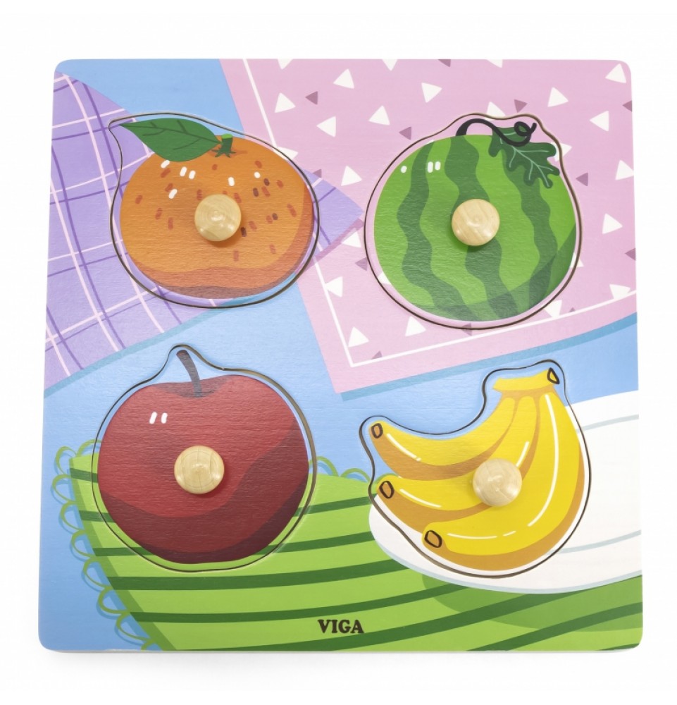 Ši medinė vaisių dėlionė iš garsaus „Viga“ prekės ženklo yra pirmaujantis žaislas, kuris ne tik yra tradicinė dėlionė, bet ir leidžia vaikams lavinti rankų įgūdžius bei atpažinti gyvūnų formas. Šis žaidimas, tinkantis 12 mėnesių ir vyresniems vaikams, padės lavinti tikslius rankų judesius , gerins akių ir rankų koordinaciją , taip pat padės lavinti atmintį , loginį mąstymą ir susikaupimą . Spalvingos dėlionės yra vizualiai patrauklios ir skatina žaisti. Rinkinį sudaro keturios dėlionės su skirtingų gyvūnų formomis. Dėlionės turi rankenas , leidžiančias mažyliams lengvai jas paimti ir padėti į tinkamą vietą lentoje.