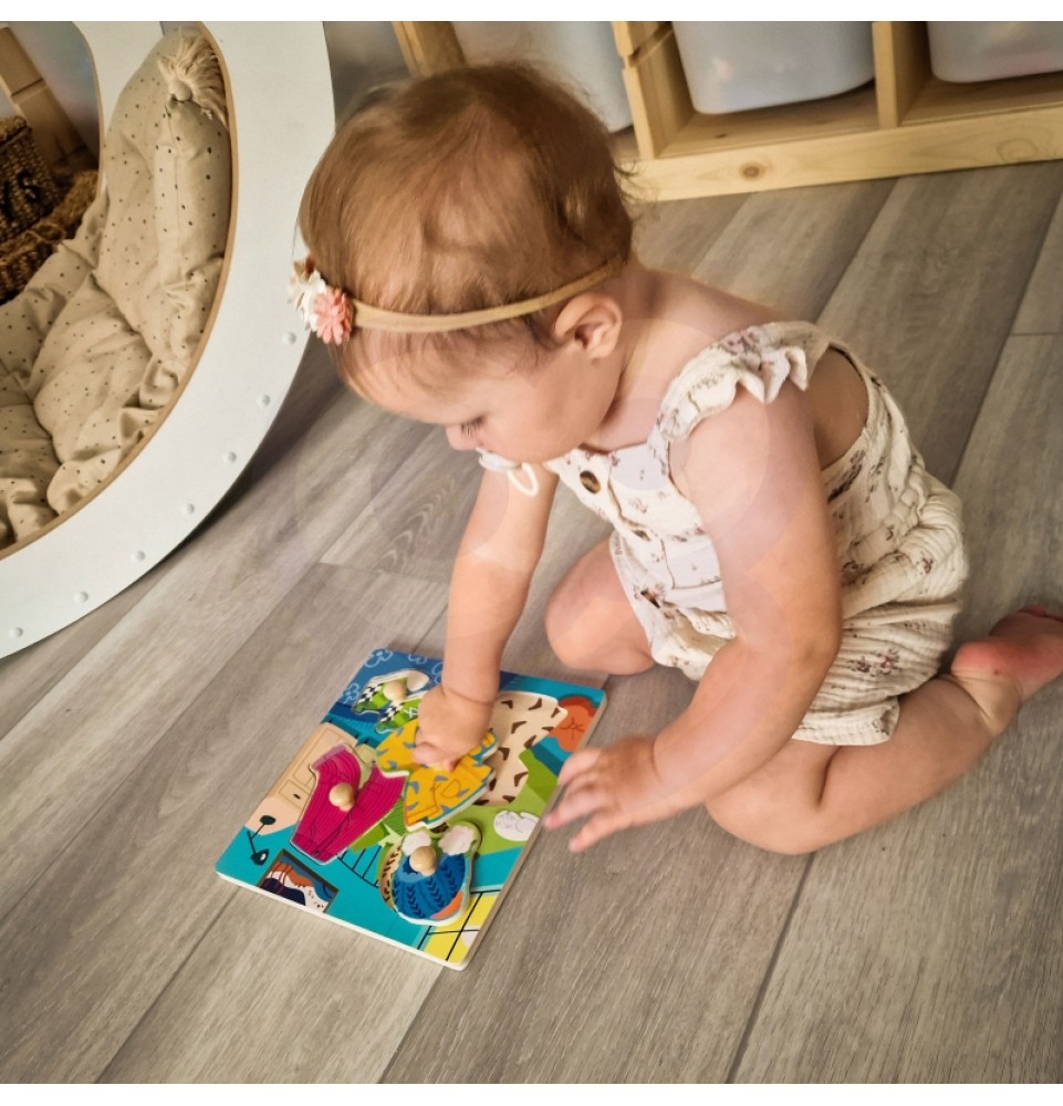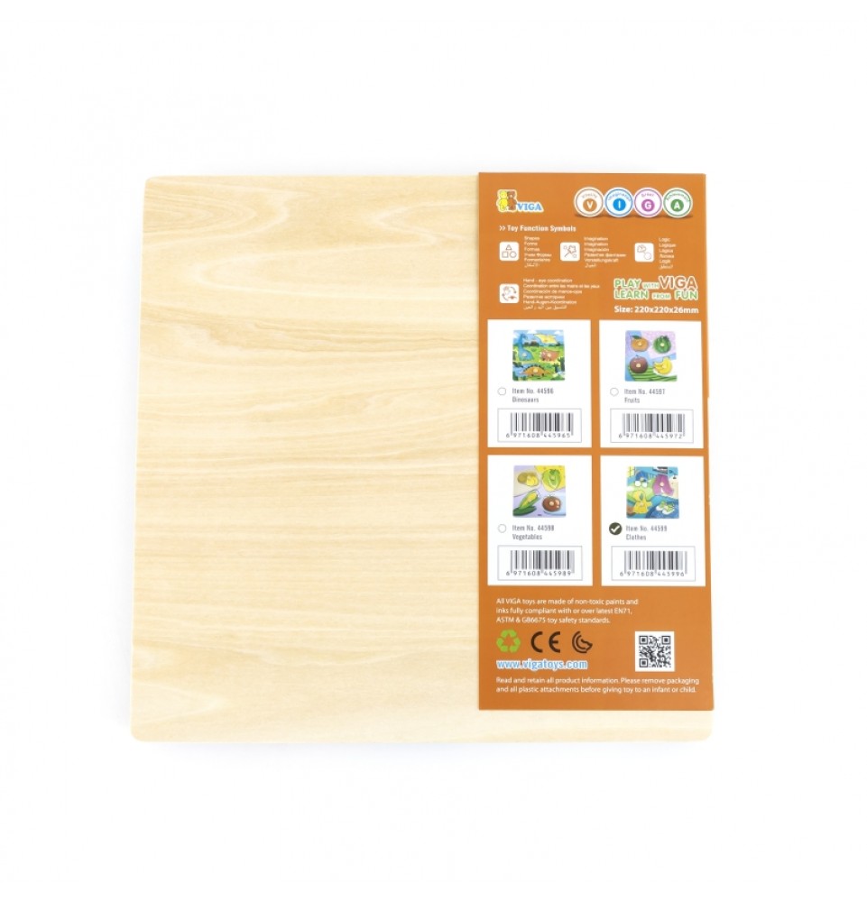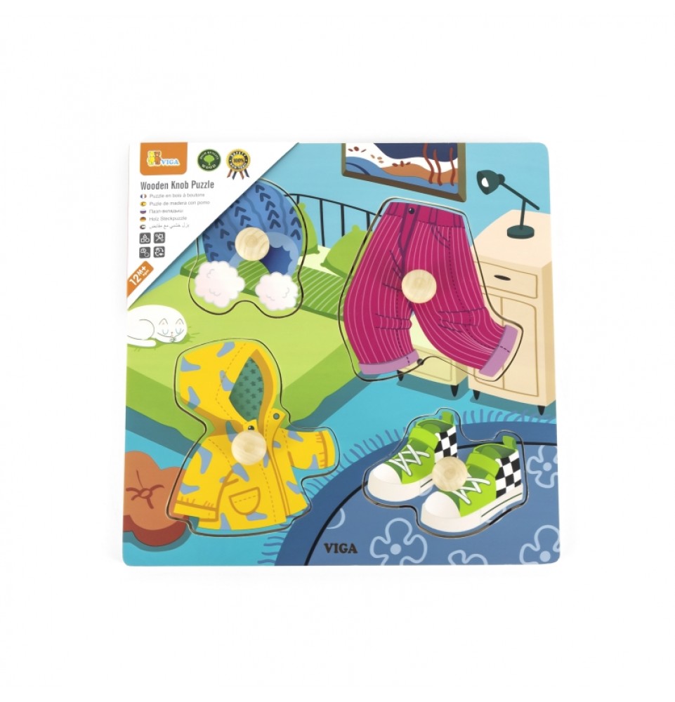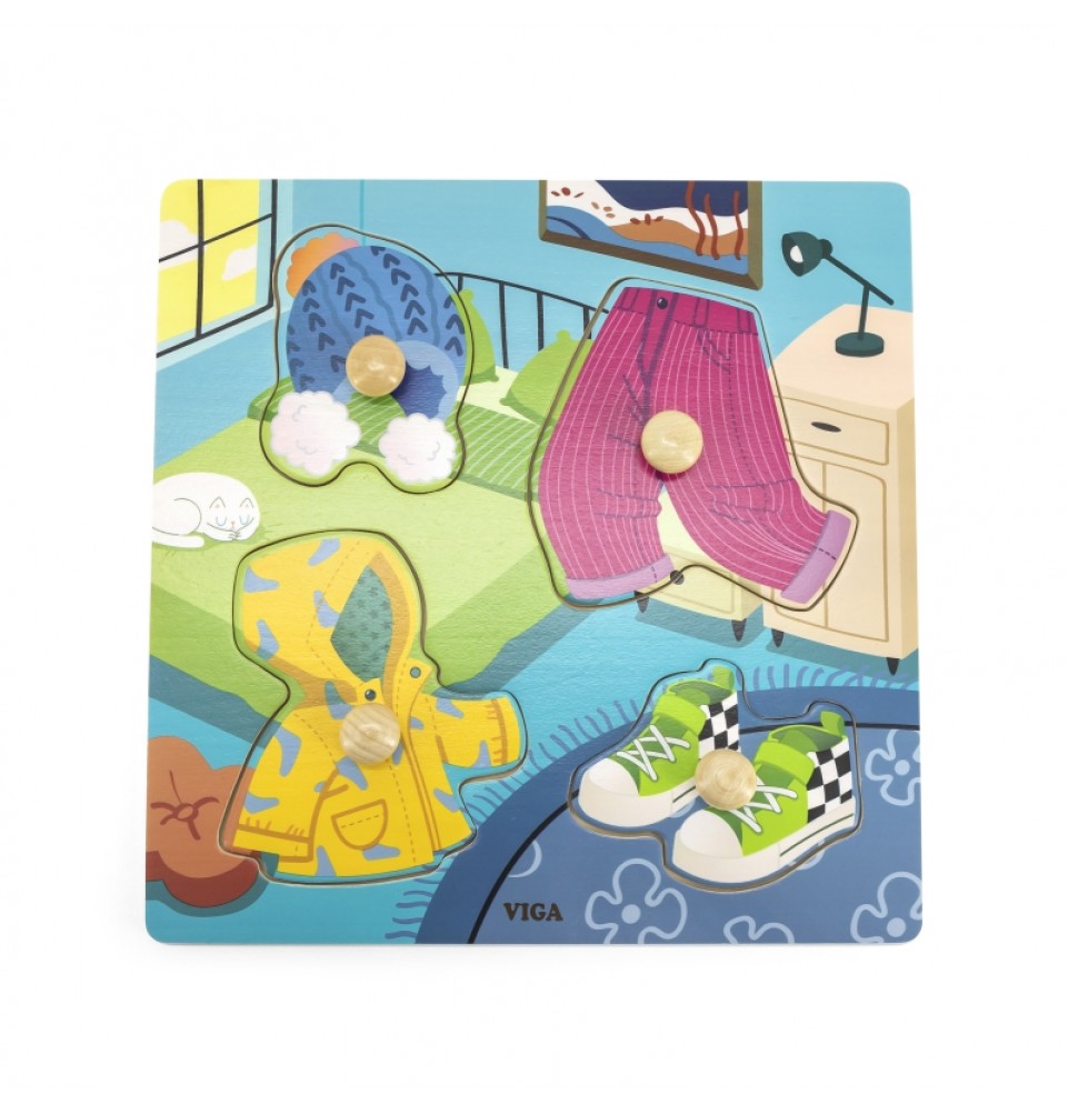 Ši medinė dėlionė su drabužių detalėmis iš garsaus „Viga“ prekės ženklo yra pirmaujantis žaislas, kuris ne tik tarnauja kaip tradicinė dėlionė, bet ir leidžia vaikams lavinti rankų įgūdžius bei atpažinti gyvūnų formas. Šis žaidimas, tinkantis 12 mėnesių ir vyresniems vaikams, padės lavinti tikslius rankų judesius , gerins akių ir rankų koordinaciją , taip pat padės lavinti atmintį , loginį mąstymą ir susikaupimą . Spalvingos dėlionės traukia akį ir skatina žaisti. Rinkinį sudaro keturios dėlionės su skirtingais gyvūnais skirtingose formose. Dėlionės turi rankenas , todėl mažyliai gali jas lengvai paimti ir padėti į tinkamą vietą lentoje.