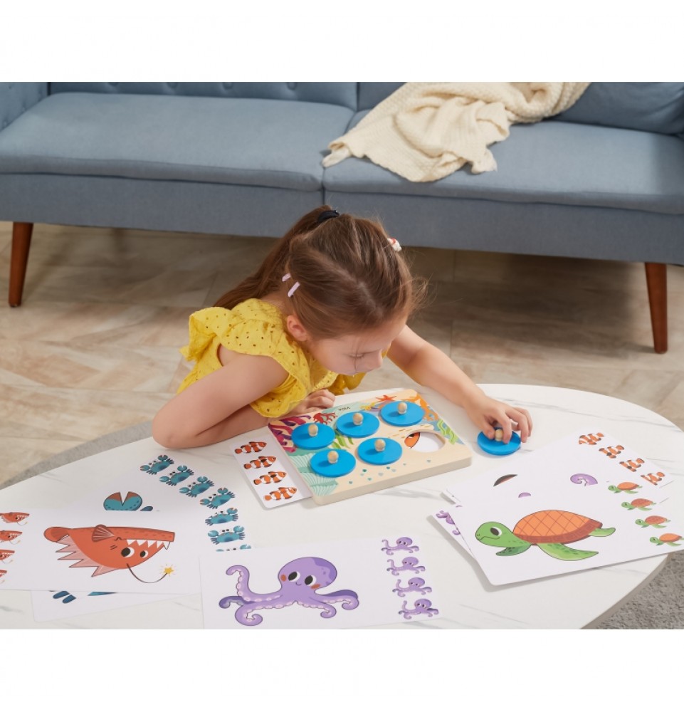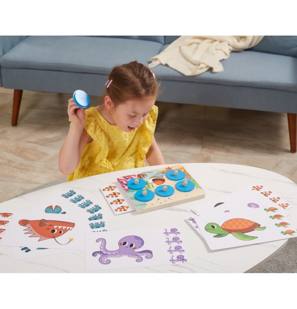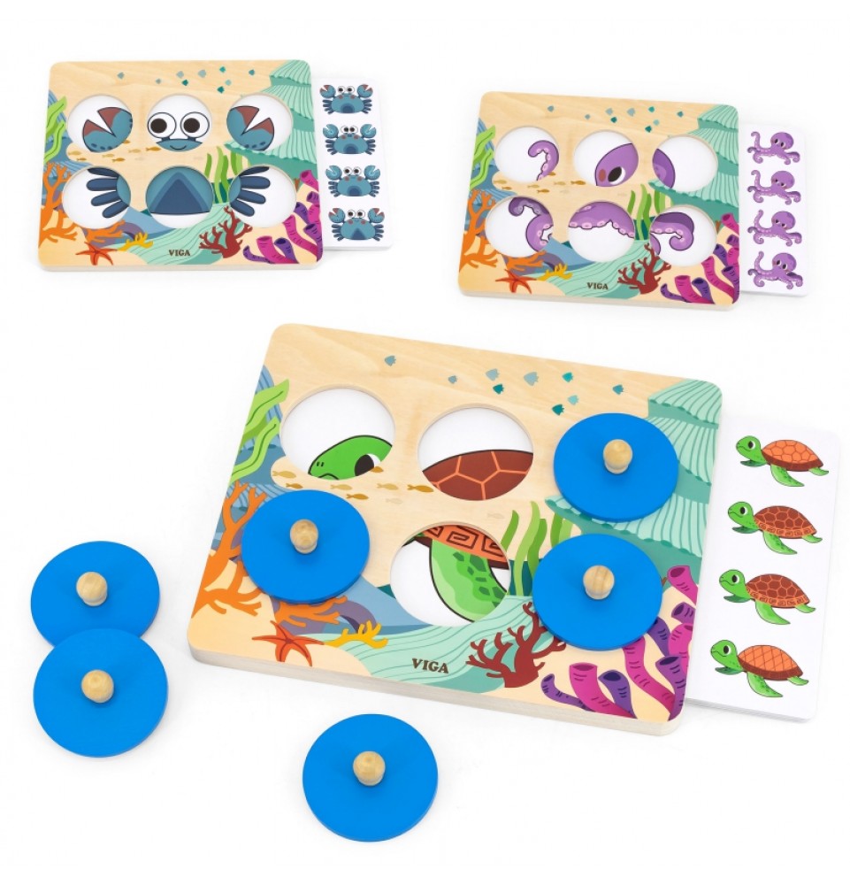 Taisyklės : Įkiškite kortelę į medinę lentą, pakelkite apskritimą už rankenos, pažiūrėkite į rašto elementą ir atspėkite, kuris iš keturių paveikslėlių atitinka paslėptą gyvūną. Jei negalite atspėti, pakelkite kitą apskritimą, kad atskleistumėte detales.