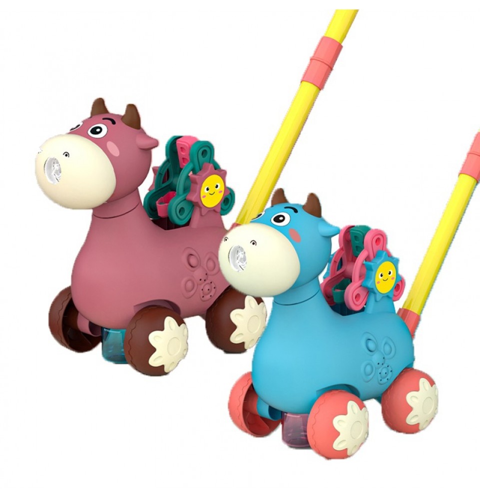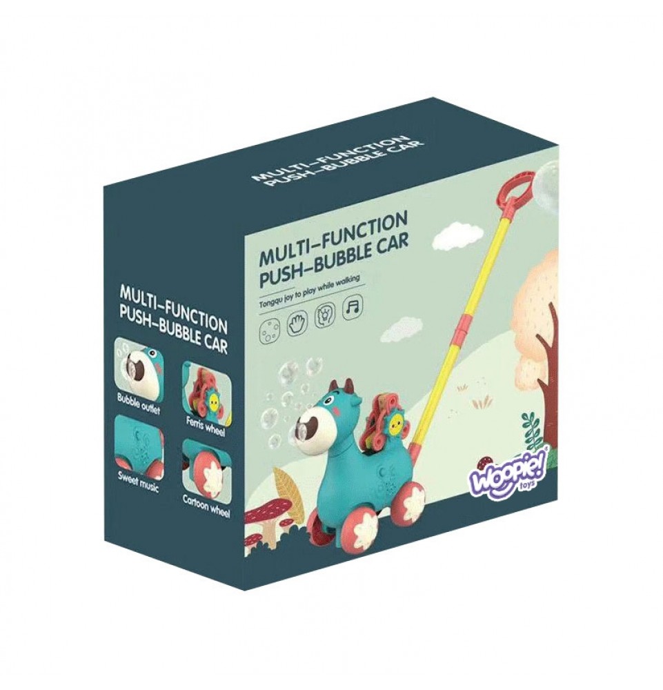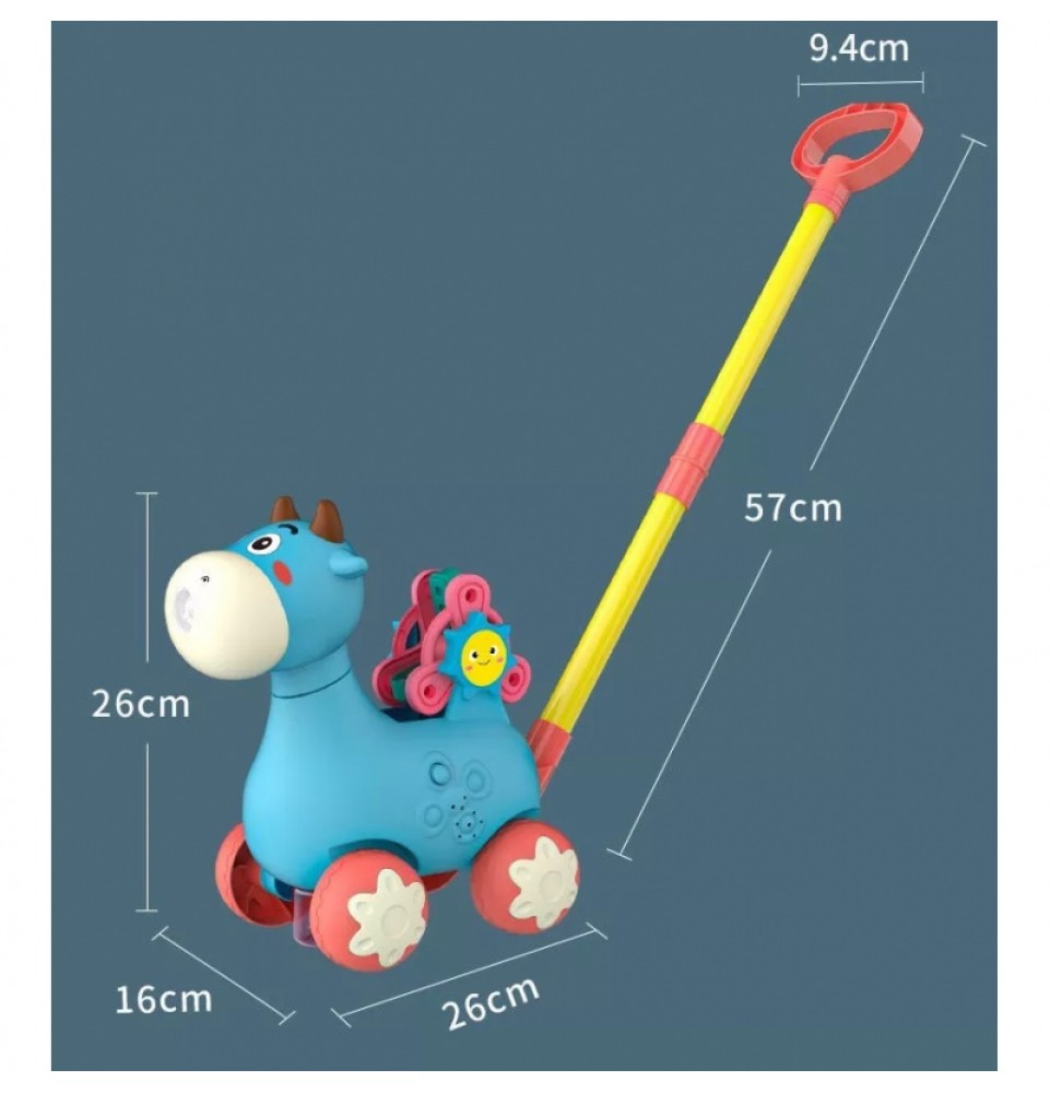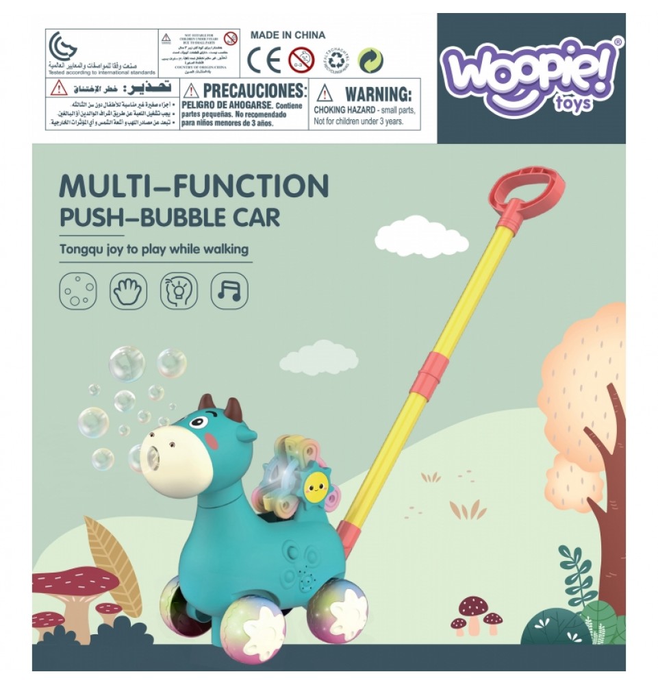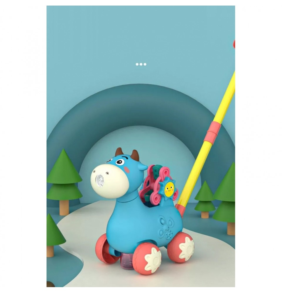 Mėlynas karvės stūmiklis iš WOOPIE yra puiki mokymosi priemonė jūsų vaikui. Vaikai gali praktikuotis vaikščioti stumdami savo mėgstamą karvę. Šis stūmiamas žaislas turi daug funkcijų , kurios pradžiugins vaikus. Karvė pučia burbulus – tiesiog įsukite muilo indelį iš apačios (pridedami du indeliai) . Burbulai išbėga iš karvės nasrų. Jame yra besisukantis ratelis su abėcėlės raidėmis (A, B ir C) mokymuisi. Visa tai lydi nuostabios melodijos, kurias galima įjungti ir išjungti vienu mygtuko paspaudimu . Šis žaislas padės lavinti jūsų vaiko koordinaciją , motorinius įgūdžius, vaikščiojimo įgūdžius ir leis jam žengti pirmuosius žingsnius mokantis abėcėlės .