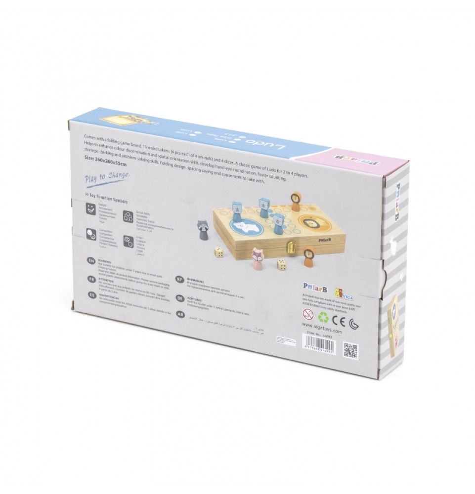 Stalo žaidimas „Ludo“ yra gerai žinomas vaikams ir suaugusiems visame pasaulyje. „Viga PolarB“ sukūrė visiškai naują versiją, kuri sužavės mažuosius. Rinkinį sudaro keturi kauliukai, lenta/dėžutė ir šešiolika gražiai pagamintų, pastelinių spalvų figūrėlių.