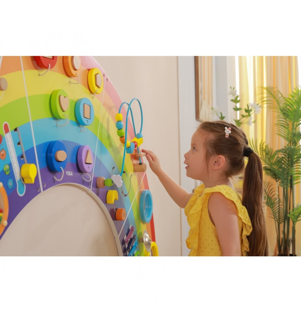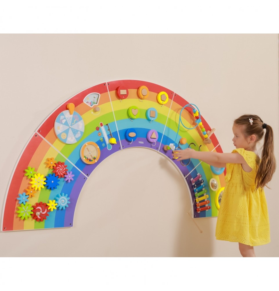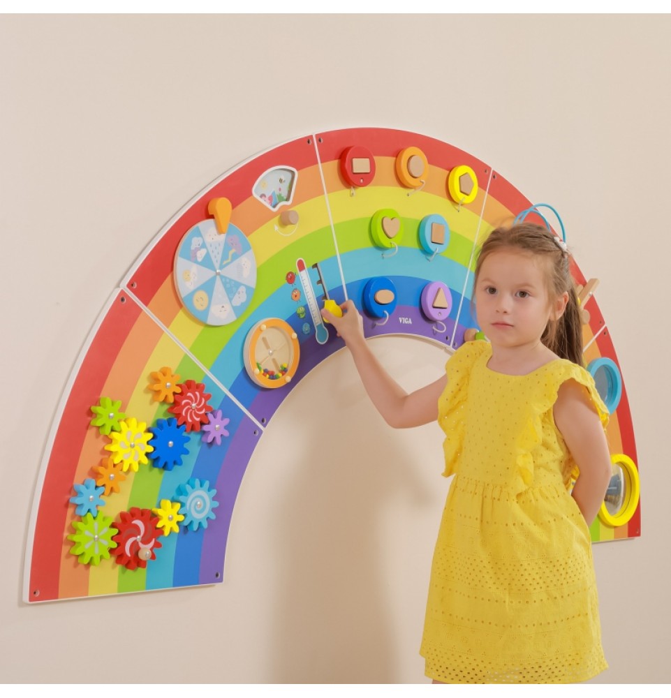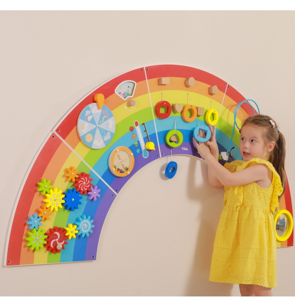 „Viga Toys“ vaivorykštės sensorinė ir manipuliacinė lenta yra medinis, daugiafunkcis sieninis žaislas , kuris suteiks vaikams valandų valandas pramogų. Tarp įvairių veiklų rasite 12: besisukančias pavaras, oro sąlygų lentą, riedantį diską, kaladėlių derinimo įrankį, ksilofoną, įgaubtą ir išgaubtą veidrodį, gongą ir karoliukų pynimą. Orų sąlygų lenta specialiai sukurta atsižvelgiant į vaivorykštės temą. Besikeičiančių metų laikų skydelį galima tyrinėti kartu su oro pokyčiais ir temperatūros svyravimais. Padalinta į 5 dalis, kad būtų lengva transportuoti ir surinkti. Visos 5 dalys yra vienodo dydžio, todėl jas galima surinkti bet kokia tvarka. Išlenktas dizainas skatina įvairaus dydžio vaikus žaisti ir tuo pačiu metu mokytis pagrindinių sąvokų apie spalvas, formas, garsus ir orus. Šis žaislas skirtas stimuliuoti pojūčius ir lavinti vaikų motorinius įgūdžius . Tai puikus pratimas lavinti mažųjų pirštelių miklumą . Jis taip pat lavina loginį mąstymą ir kantrybę. Tai idealus papildymas ankstyvojo mokymosi aplinkoje ir vaikų priežiūros įstaigose.