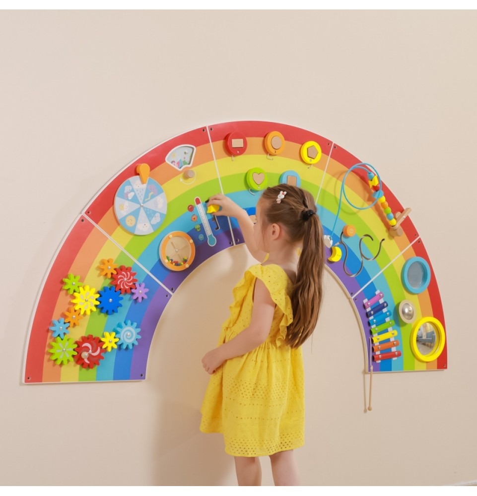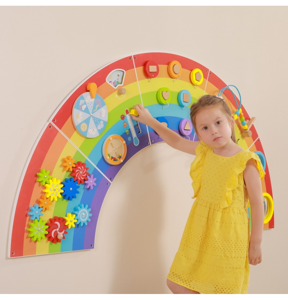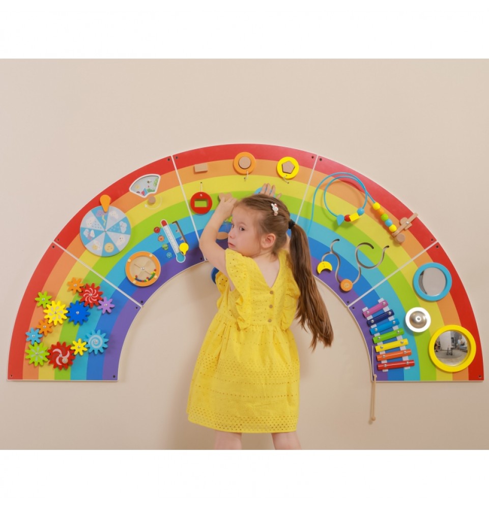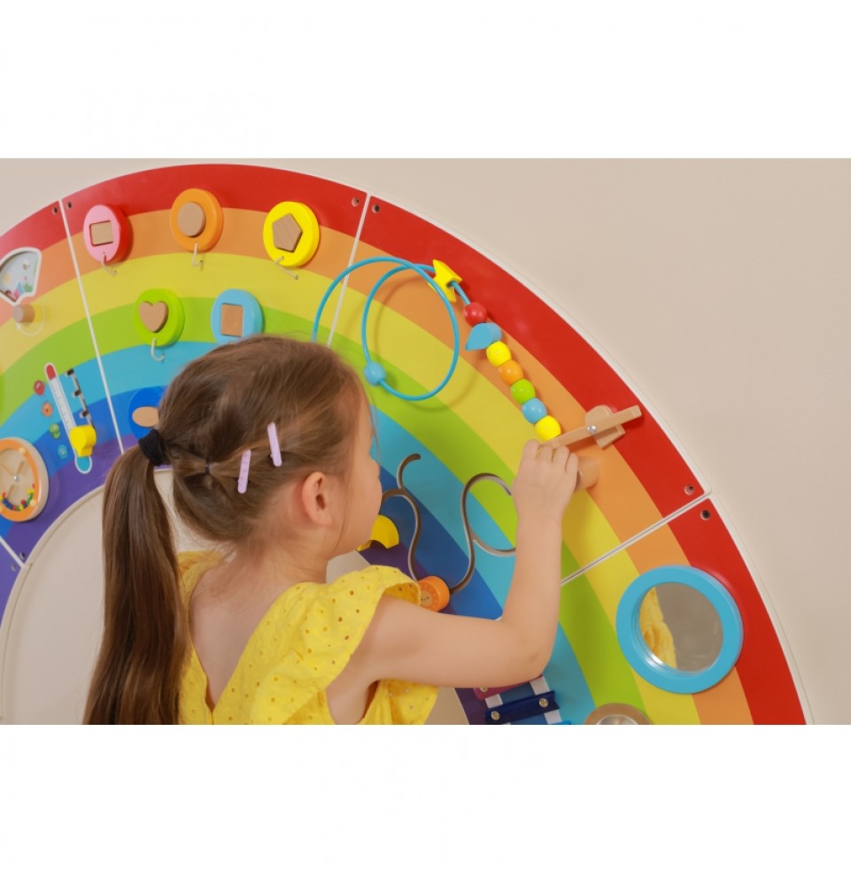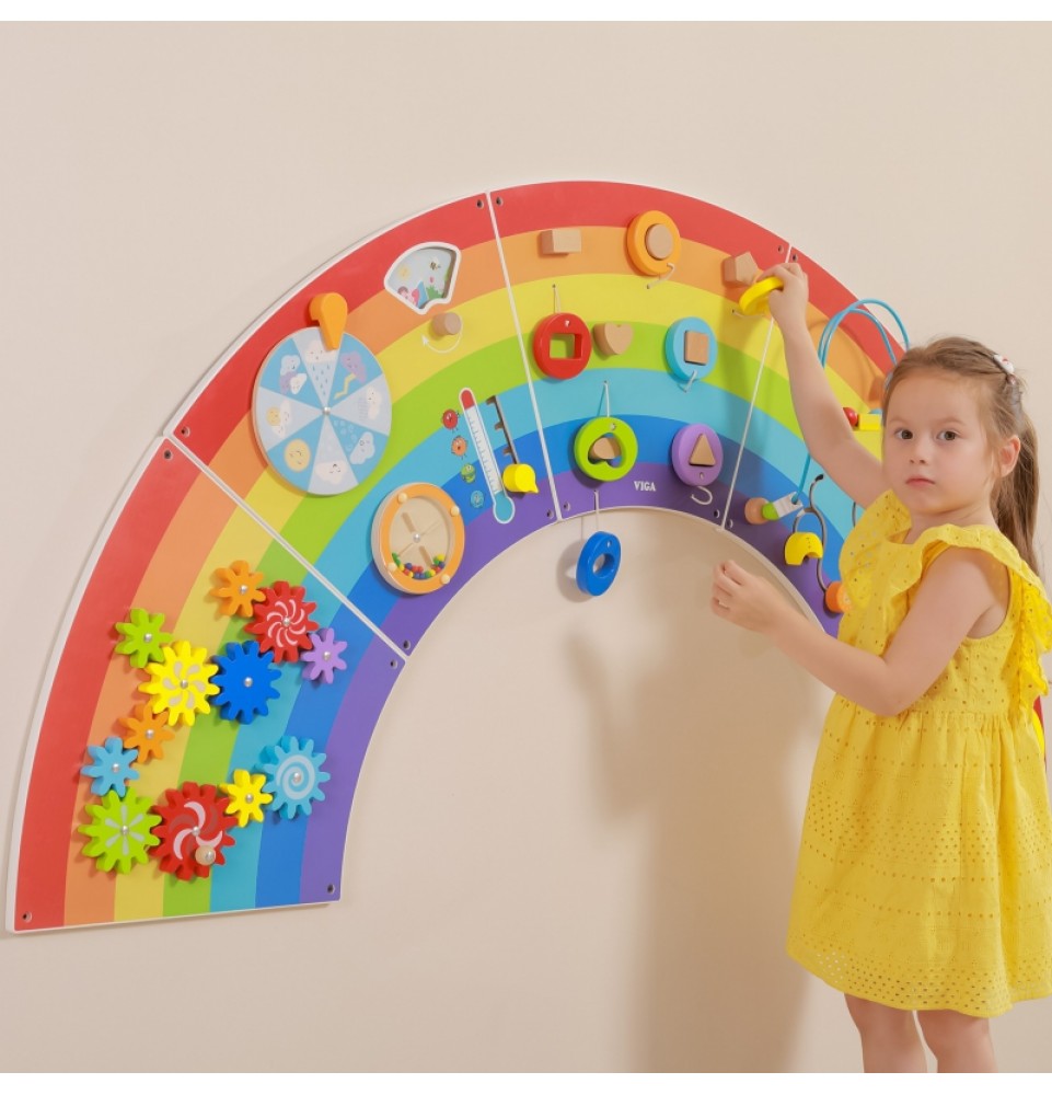 „Viga Toys“ vaivorykštės sensorinė ir manipuliacinė lenta yra medinis, daugiafunkcis sieninis žaislas , kuris suteiks vaikams valandų valandas pramogų. Tarp įvairių veiklų rasite 12: besisukančias pavaras, oro sąlygų lentą, riedantį diską, kaladėlių derinimo įrankį, ksilofoną, įgaubtą ir išgaubtą veidrodį, gongą ir karoliukų pynimą. Orų sąlygų lenta specialiai sukurta atsižvelgiant į vaivorykštės temą. Besikeičiančių metų laikų skydelį galima tyrinėti kartu su oro pokyčiais ir temperatūros svyravimais. Padalinta į 5 dalis, kad būtų lengva transportuoti ir surinkti. Visos 5 dalys yra vienodo dydžio, todėl jas galima surinkti bet kokia tvarka. Išlenktas dizainas skatina įvairaus dydžio vaikus žaisti ir tuo pačiu metu mokytis pagrindinių sąvokų apie spalvas, formas, garsus ir orus. Šis žaislas skirtas stimuliuoti pojūčius ir lavinti vaikų motorinius įgūdžius . Tai puikus pratimas lavinti mažųjų pirštelių miklumą . Jis taip pat lavina loginį mąstymą ir kantrybę. Tai idealus papildymas ankstyvojo mokymosi aplinkoje ir vaikų priežiūros įstaigose.