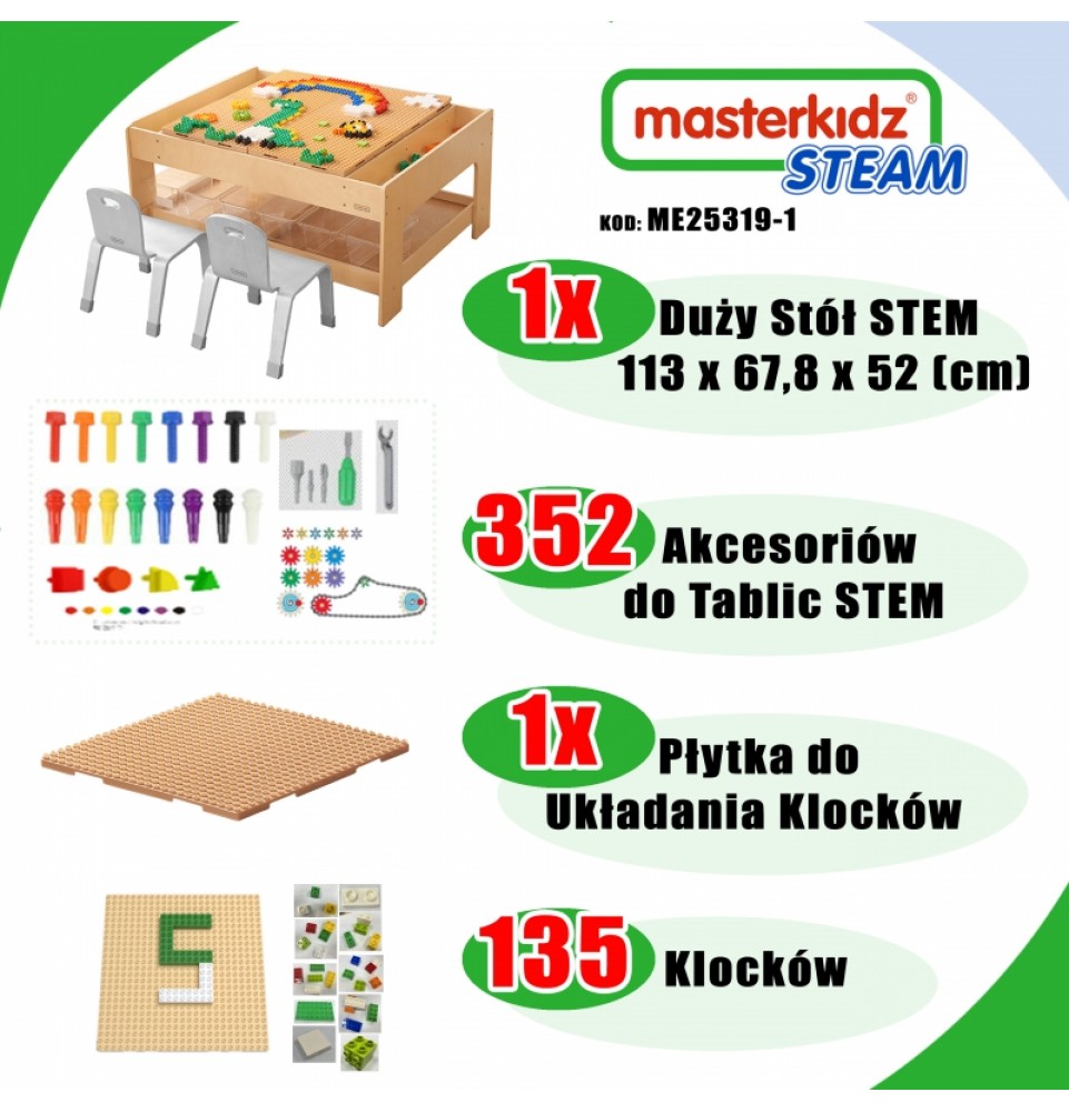„Masterkidz STEM“ edukacinis stalas + priedai leidžia kūrybiškai žaisti ir tyrinėti mokslo pasaulį. Stalas turi plokštę su skylėmis, į kurias galima įdėti spalvingus ir geometrinius kaiščius, varžtus ir krumpliaračius, kad būtų sukurti gražūs raštai. Be to, rinkinyje yra 39,7 x 39,7 cm lenta, kurią galima padėti ant stalo, ir 135 kaladėlės, kurias galima sudėti ant jos.