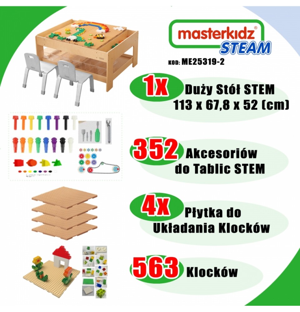 „Masterkidz STEM“ edukacinis stalas + priedai leidžia kūrybiškai žaisti ir tyrinėti mokslo pasaulį. Stalas turi plokštę su skylėmis, į kurias galima įdėti spalvingus ir geometrinius kaiščius, varžtus ir krumpliaračius, kad būtų sukurti gražūs raštai. Be to, rinkinyje yra keturios 39,7 x 39,7 cm lentos, kurias galima padėti ant stalo, ir 563 sudedamos kaladėlės.