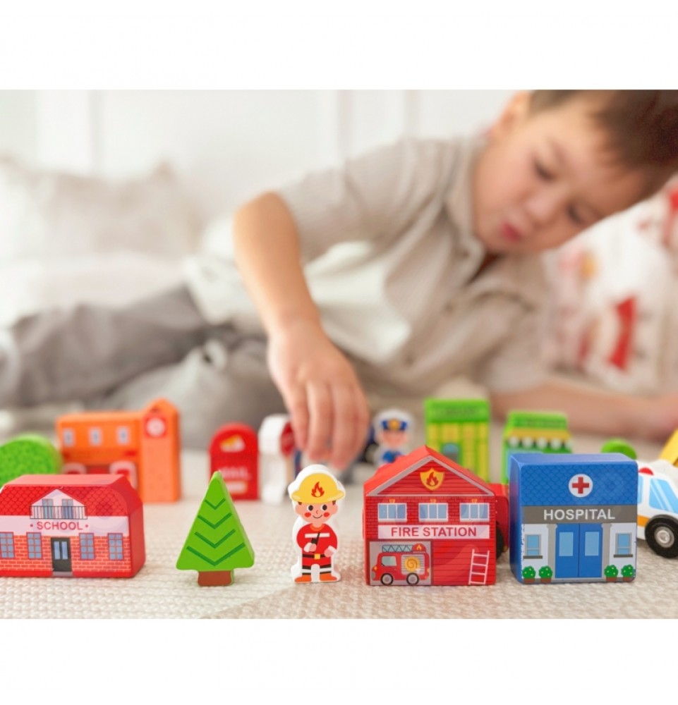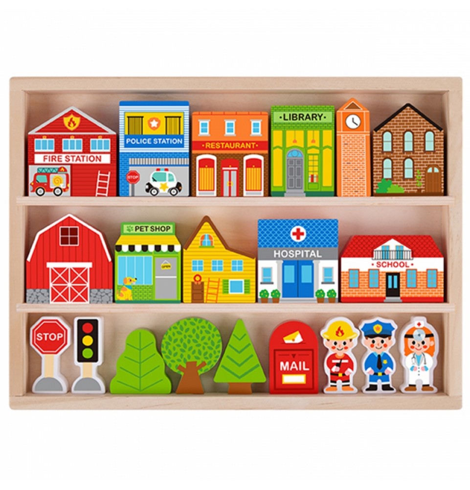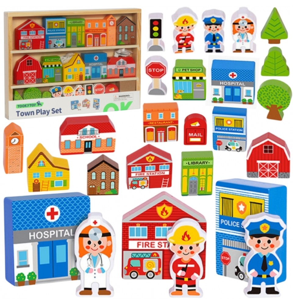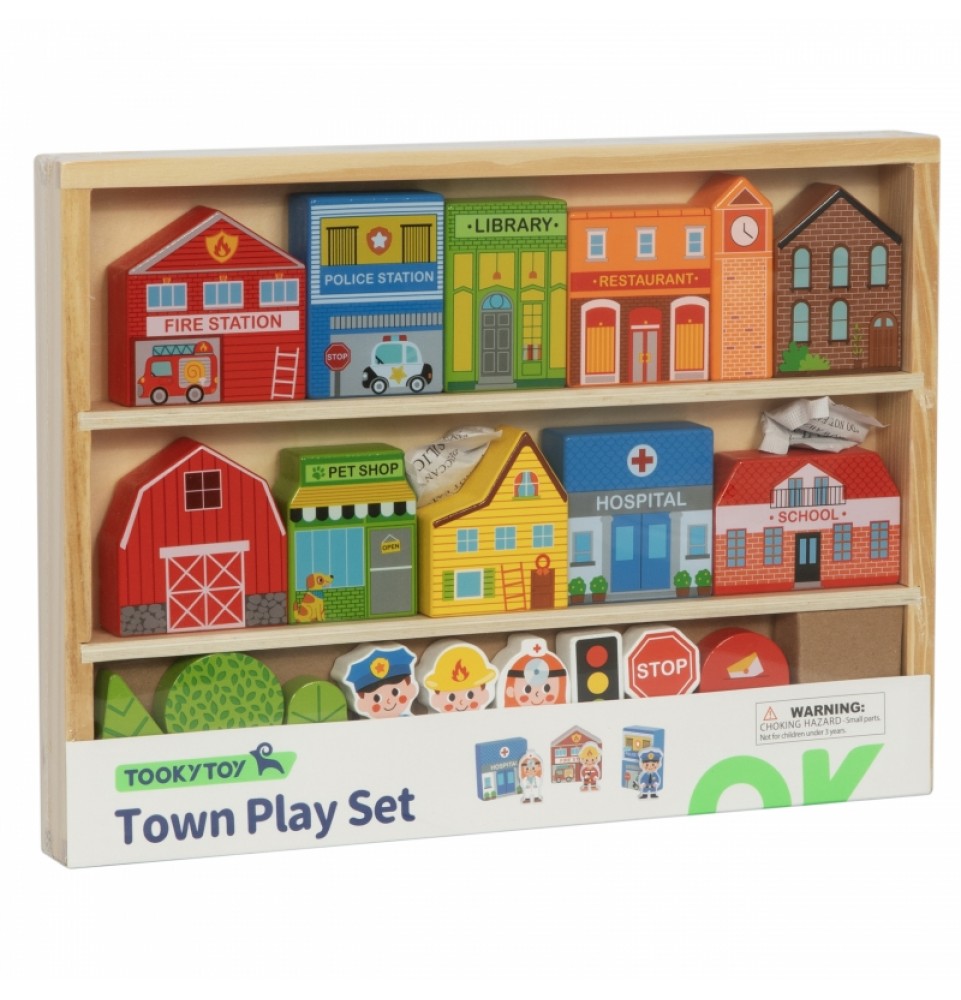 „TOOKY TOY“ pastatų ir figūrėlių rinkinys leidžia jums pastatyti savo miestelį ir panaudoti figūrėles skirtingoms scenoms, kurios ten galėtų vykti, kurti. Rinkinys leidžia žaisti savarankiškai , bet jis taip pat puikiai papildo kitus rinkinius. Rinkinį sudaro medinė dėžė su skyriais, 11 pastatų figūrėlių , 3 personažų figūrėlės , įskaitant ugniagesį, policininką ir gydytoją , ir 6 kitos daiktinės figūrėlės: STOP ženklas, šviesoforas, du medžiai, krūmas ir pašto dėžutė. Žaisdami vaidmenimis vaikai lavina savo kūrybiškumą, vaizduotę ir socialinius įgūdžius . Rinkinys pagamintas iš aukščiausios kokybės medžiagų ir nudažytas netoksiškais dažais, kurie yra saugūs vaikams ir aplinkai.