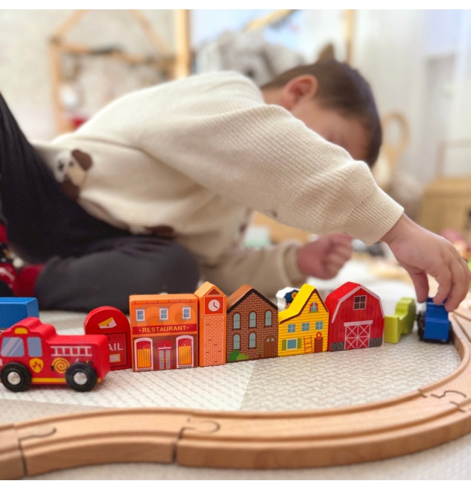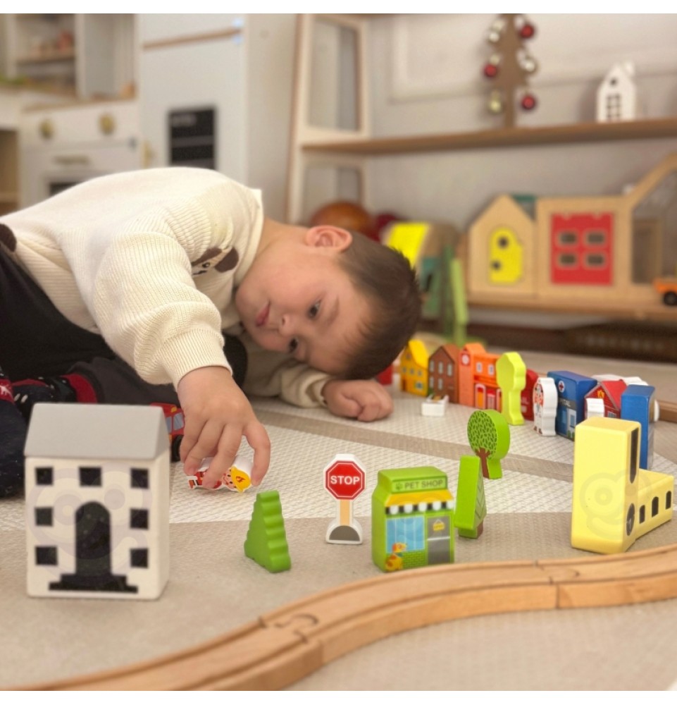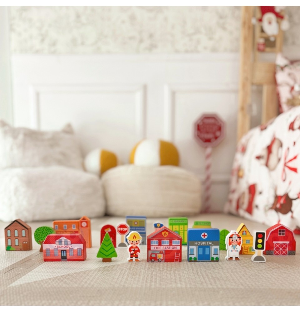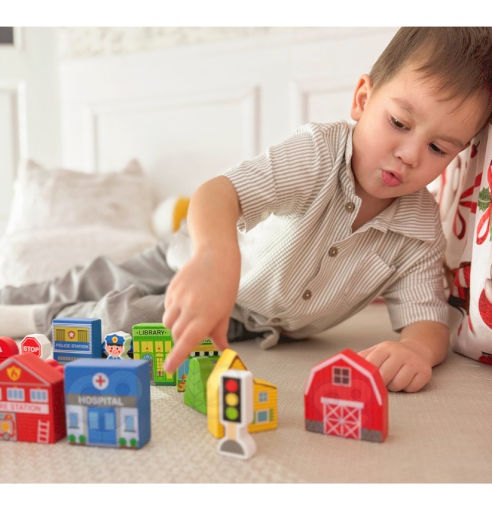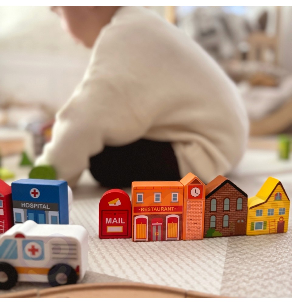 „TOOKY TOY“ pastatų ir figūrėlių rinkinys leidžia jums pastatyti savo miestelį ir panaudoti figūrėles skirtingoms scenoms, kurios ten galėtų vykti, kurti. Rinkinys leidžia žaisti savarankiškai , bet jis taip pat puikiai papildo kitus rinkinius. Rinkinį sudaro medinė dėžė su skyriais, 11 pastatų figūrėlių , 3 personažų figūrėlės , įskaitant ugniagesį, policininką ir gydytoją , ir 6 kitos daiktinės figūrėlės: STOP ženklas, šviesoforas, du medžiai, krūmas ir pašto dėžutė. Žaisdami vaidmenimis vaikai lavina savo kūrybiškumą, vaizduotę ir socialinius įgūdžius . Rinkinys pagamintas iš aukščiausios kokybės medžiagų ir nudažytas netoksiškais dažais, kurie yra saugūs vaikams ir aplinkai.