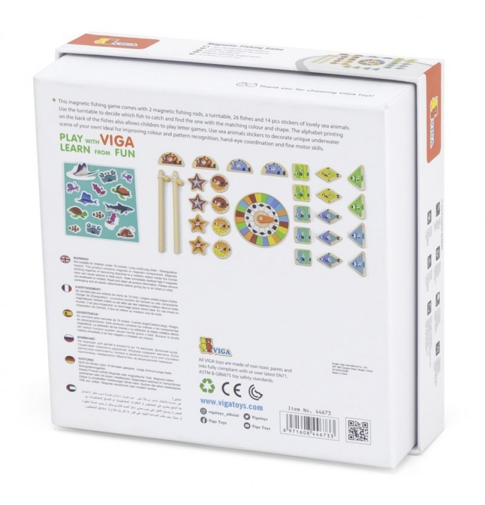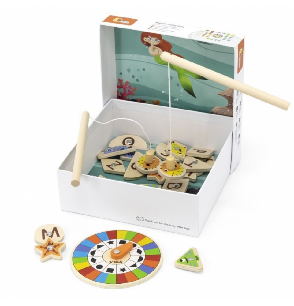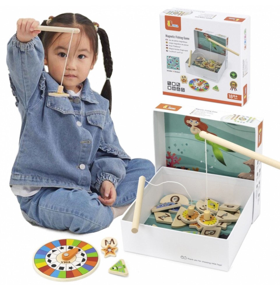VIGA magnetinis žvejybos žaidimas yra žaislas, kuris suteiks jūsų vaikui valandų valandas pramogų ir mokymosi. Rinkinį sudaro 26 įvairių spalvų ir formų magnetinės žuvelės bei dvi magnetinės meškerės, leidžiančios jūsų vaikui lengvai ir smagiai gaudyti žuvis. Naudodamas besisukantį padėklą , jūsų vaikas gali nuspręsti, kurią žuvį pagauti, o tada turi surasti atitinkamos spalvos ir formos žuvį.