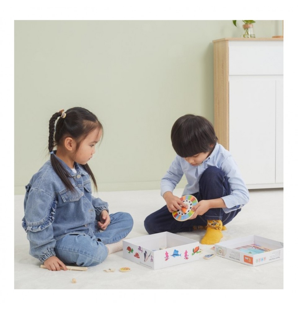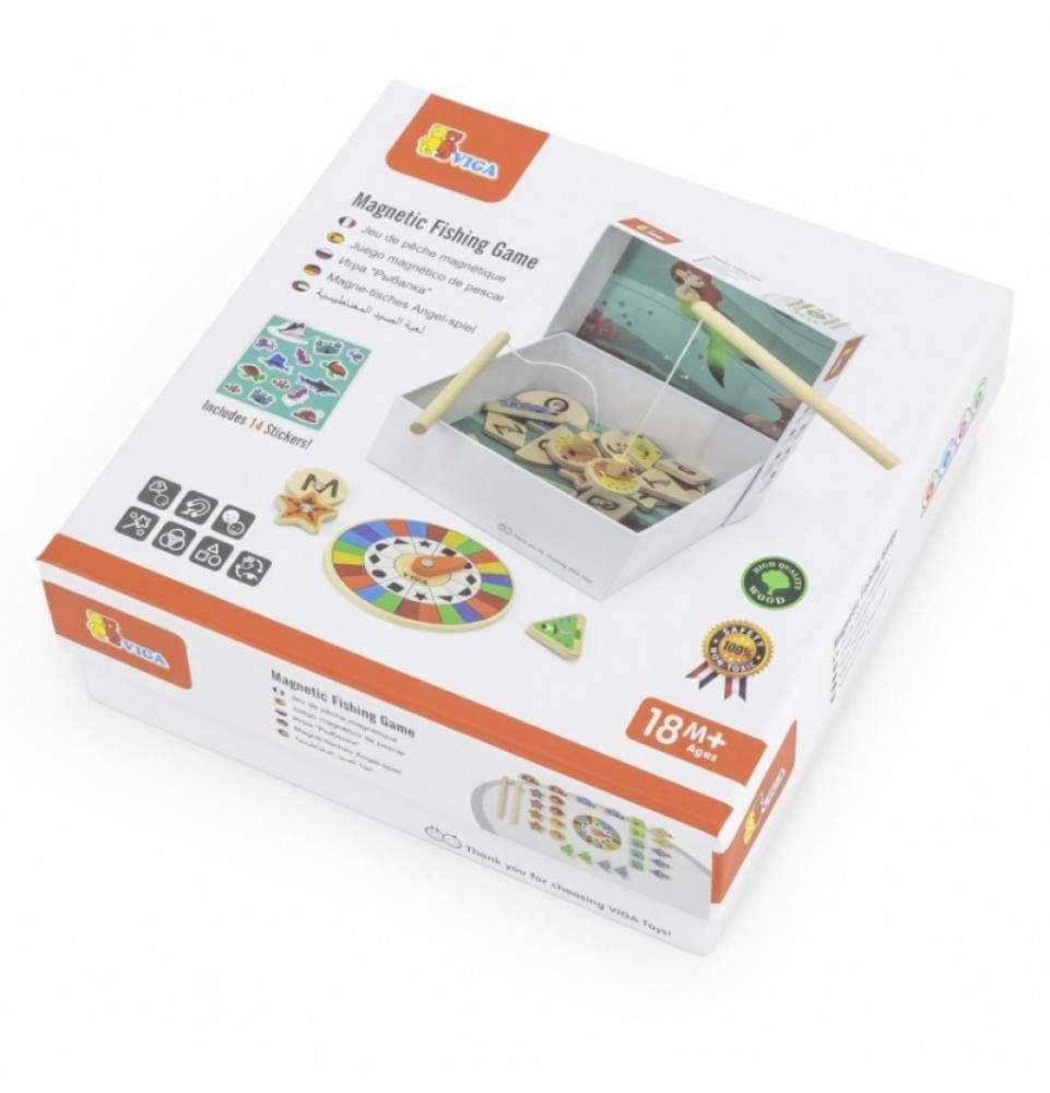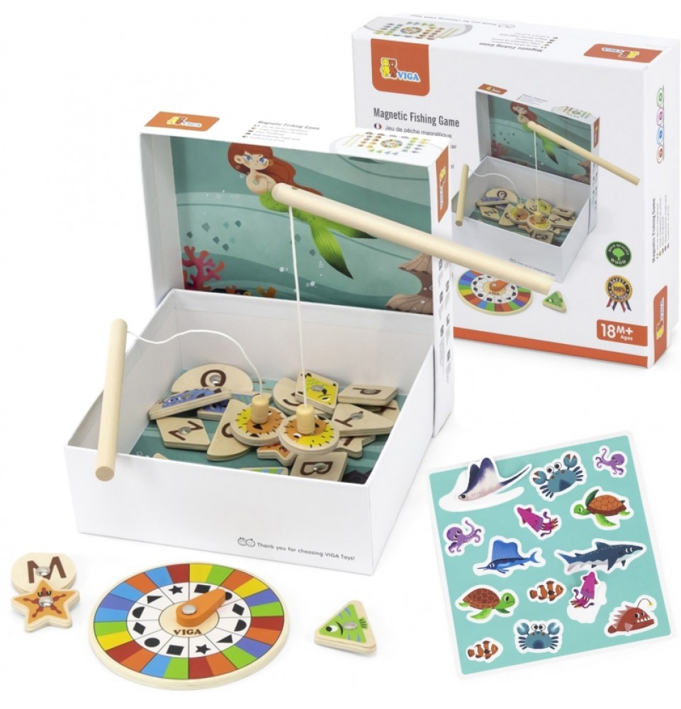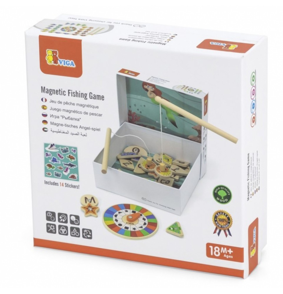 VIGA magnetinis žvejybos žaidimas yra žaislas, kuris suteiks jūsų vaikui valandų valandas pramogų ir mokymosi. Rinkinį sudaro 26 įvairių spalvų ir formų magnetinės žuvelės bei dvi magnetinės meškerės, leidžiančios jūsų vaikui lengvai ir smagiai gaudyti žuvis. Naudodamas besisukantį padėklą , jūsų vaikas gali nuspręsti, kurią žuvį pagauti, o tada turi surasti atitinkamos spalvos ir formos žuvį.