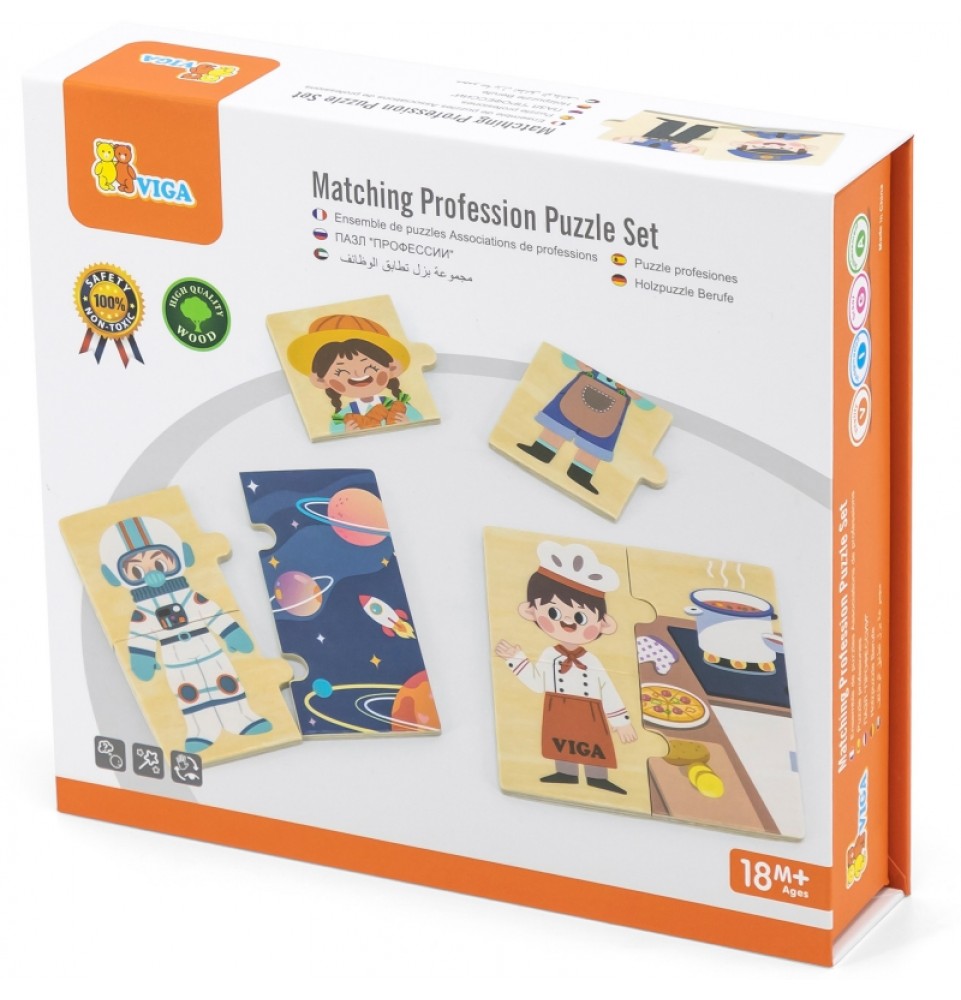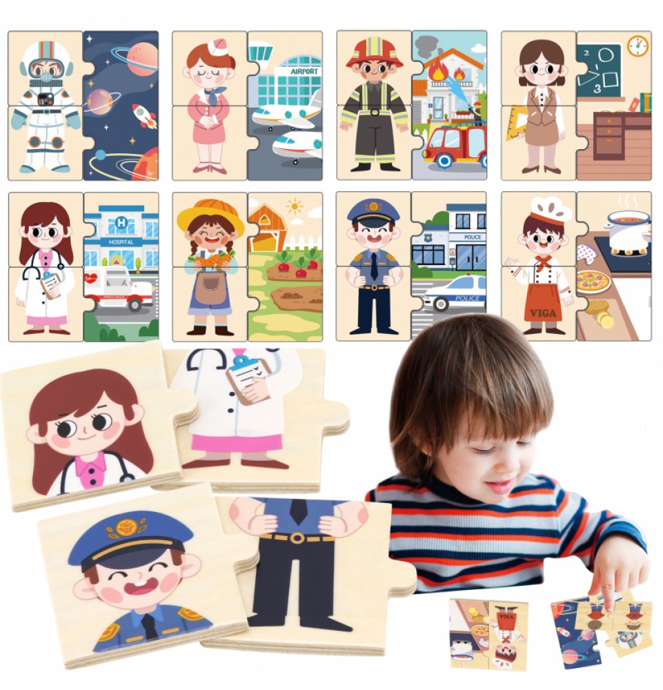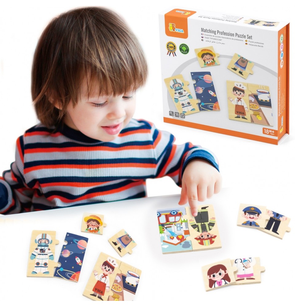 Medinis VIGA dėlionės rinkinys, sudarytas iš 24 spalvingų dėlionės detalių, padės atrasti 8 profesijas ir jų darbo vietas . Žaidimo metu maži vaikai lavins savo žodyną, susikaupimą, motorinius įgūdžius ir loginį mąstymą, derindami ir atrasdami ryšius. Priskirkite tinkamą profesiją jos darbo vietai.